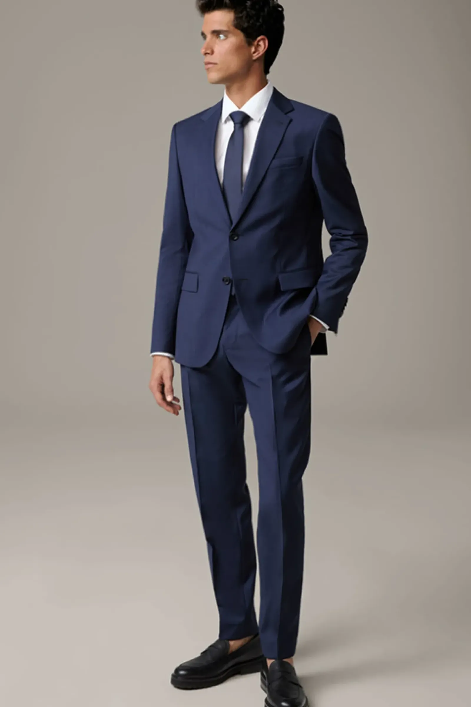 Classic for Business: der Anzug Aidan-Max aus leichtem Wollmix. Sakko mit formgebender Schulterpartie, Pattentaschen und Bewegungsschlitzen. Anzughose mit Bügelfalten und Haken-Zip-Verschluss.