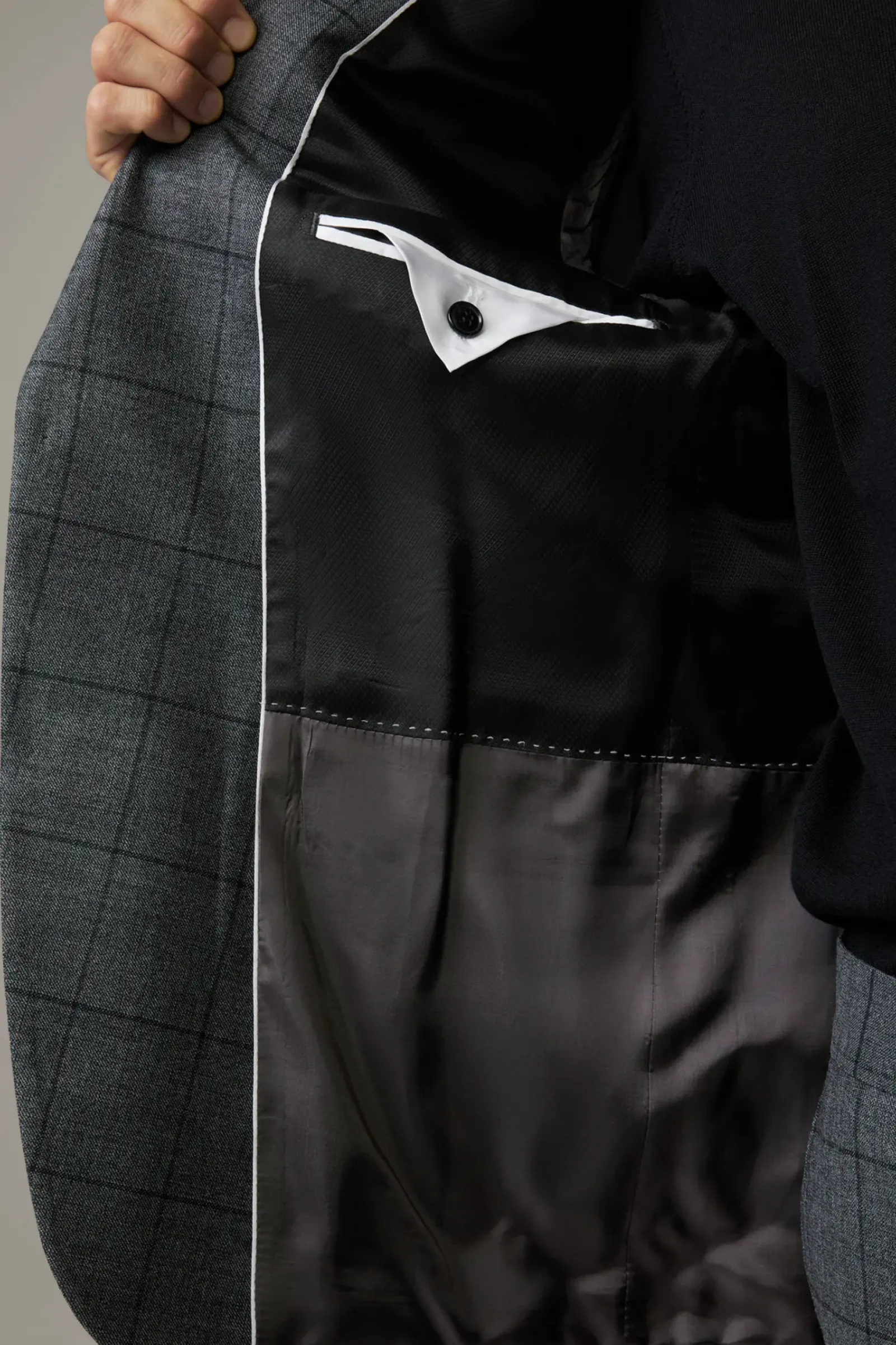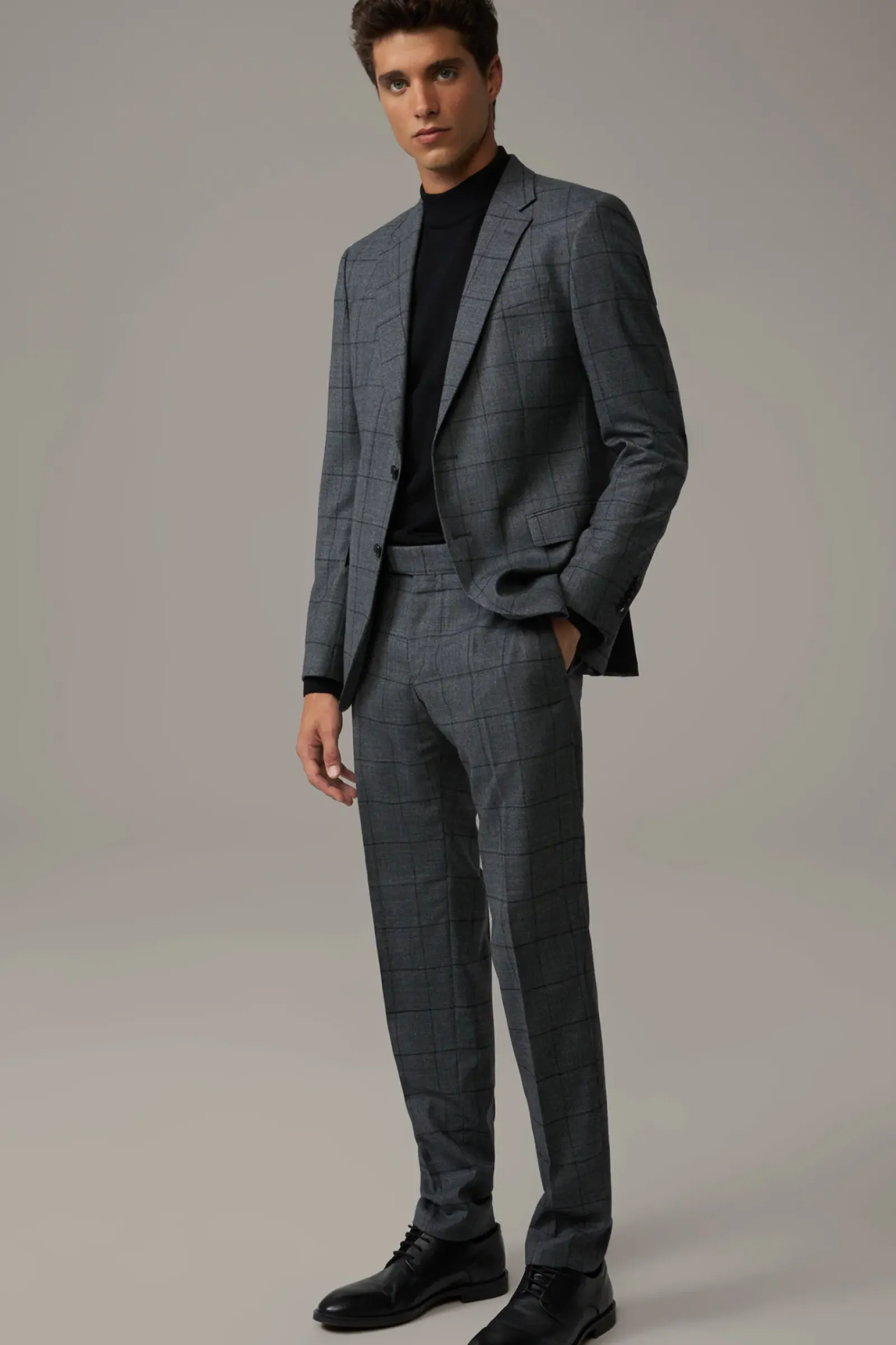 Überzeugt im Glencheck-Style aus Schurwoll-Mix: der Anzug Aidan-Max mit paspelierten Pattentaschen und Bewegungsschlitzen – ergänzt durch eine schmale Anzughose mit doppelter Hakenschließe.