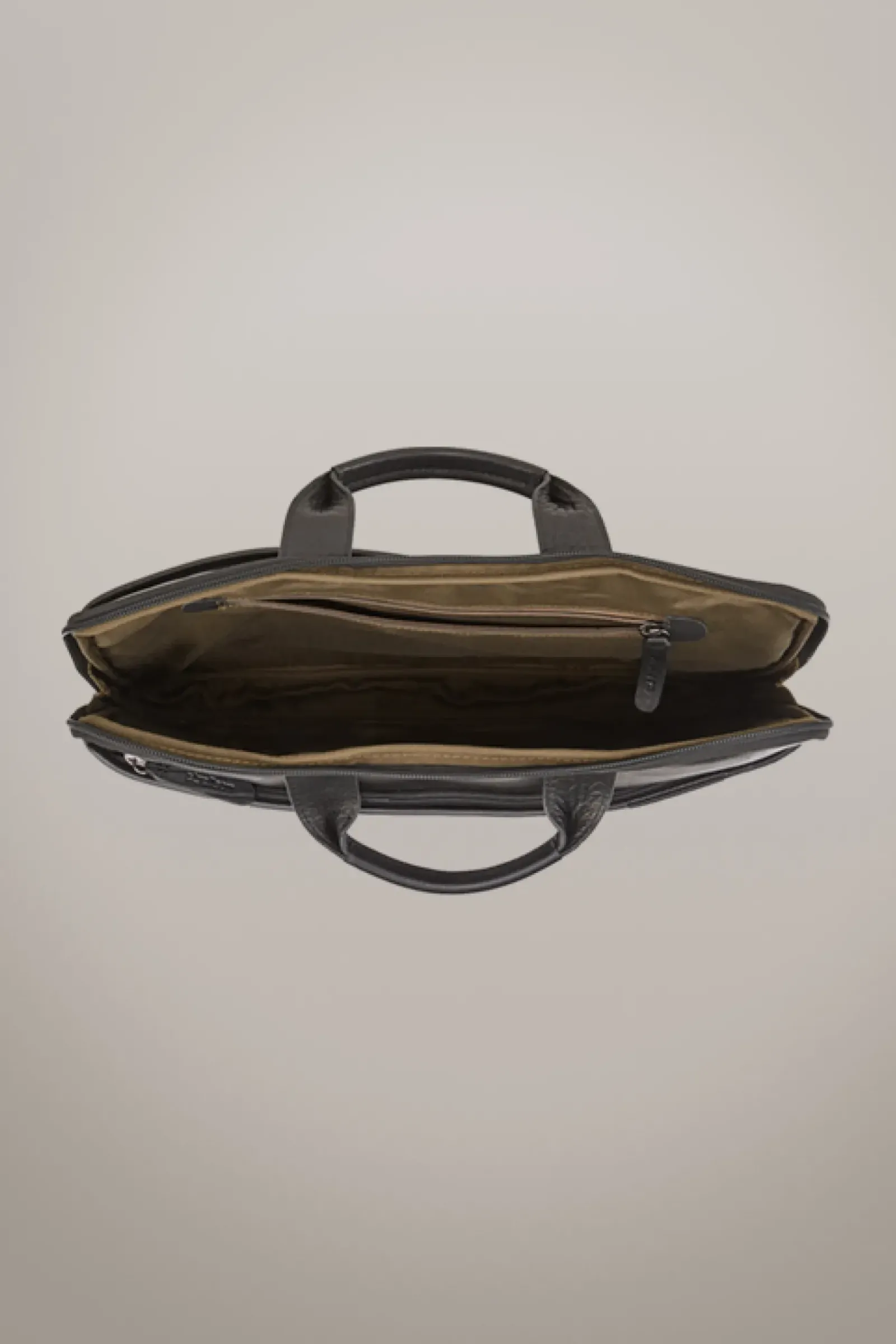 Die klassische Aktentasche aus der exklusiven Leder-Serie Hyde Park überzeugt mit zwei Zipfächern ergänzend zum funktionalen Innenfach für Laptop und Dokumente. Ein praktikabler Zwei-Wege-Zipper und edle Logo-Details runden das Design ab.