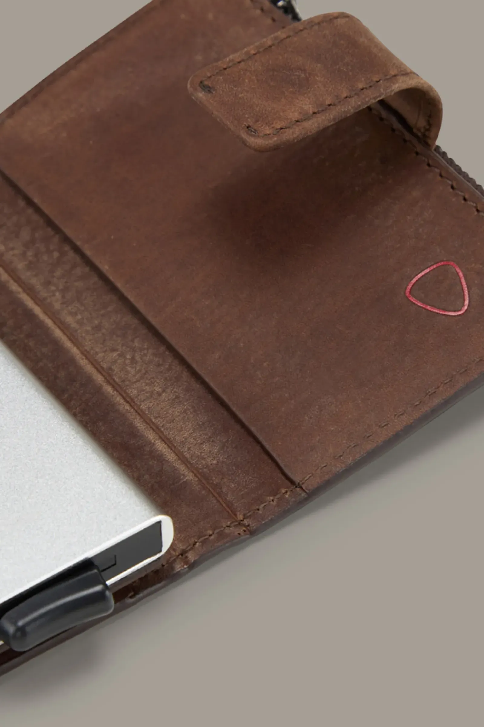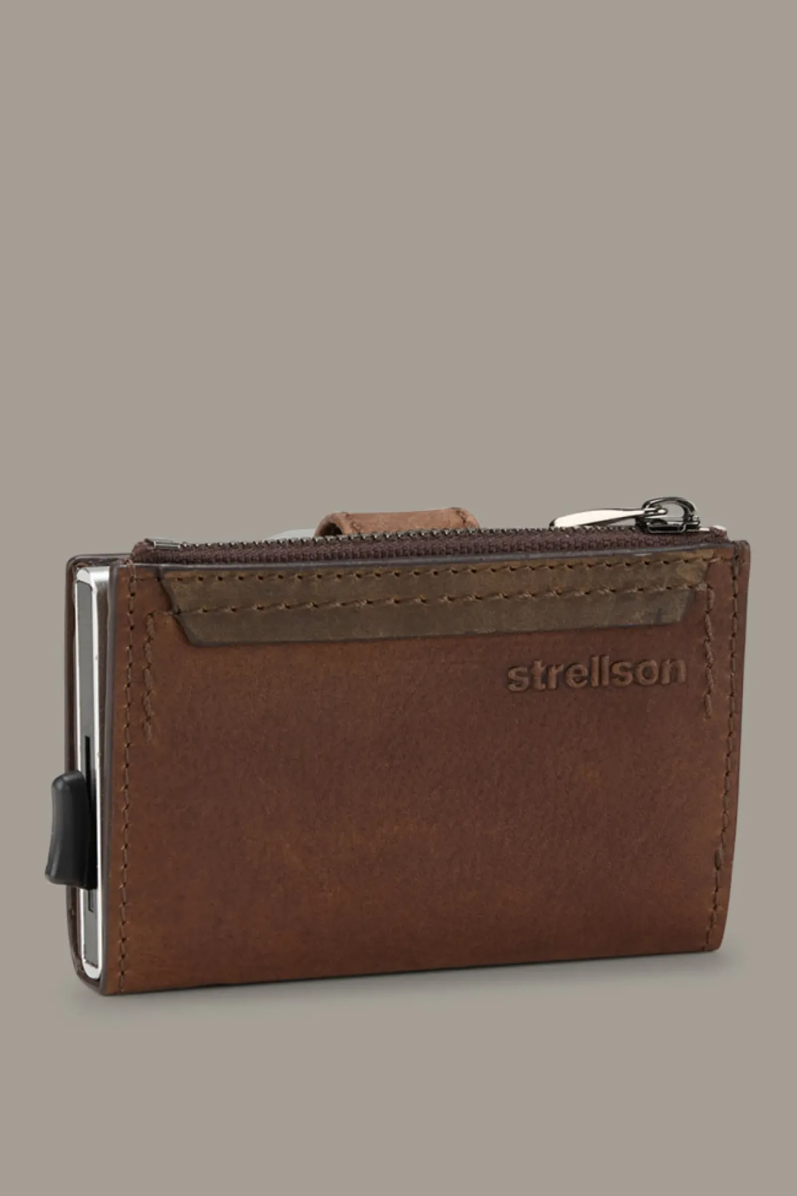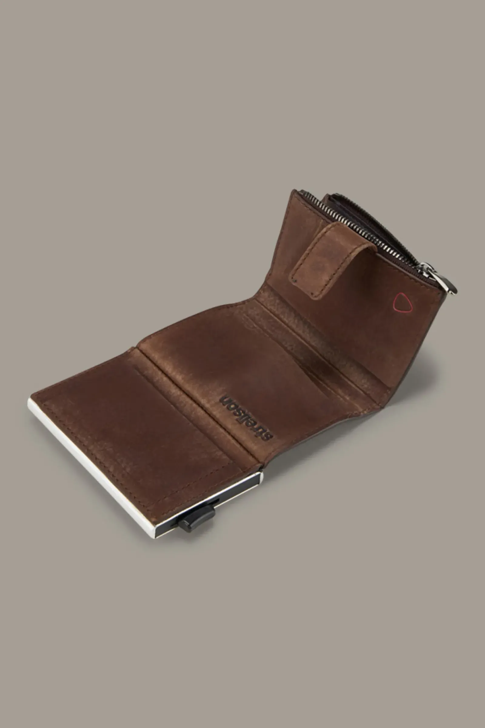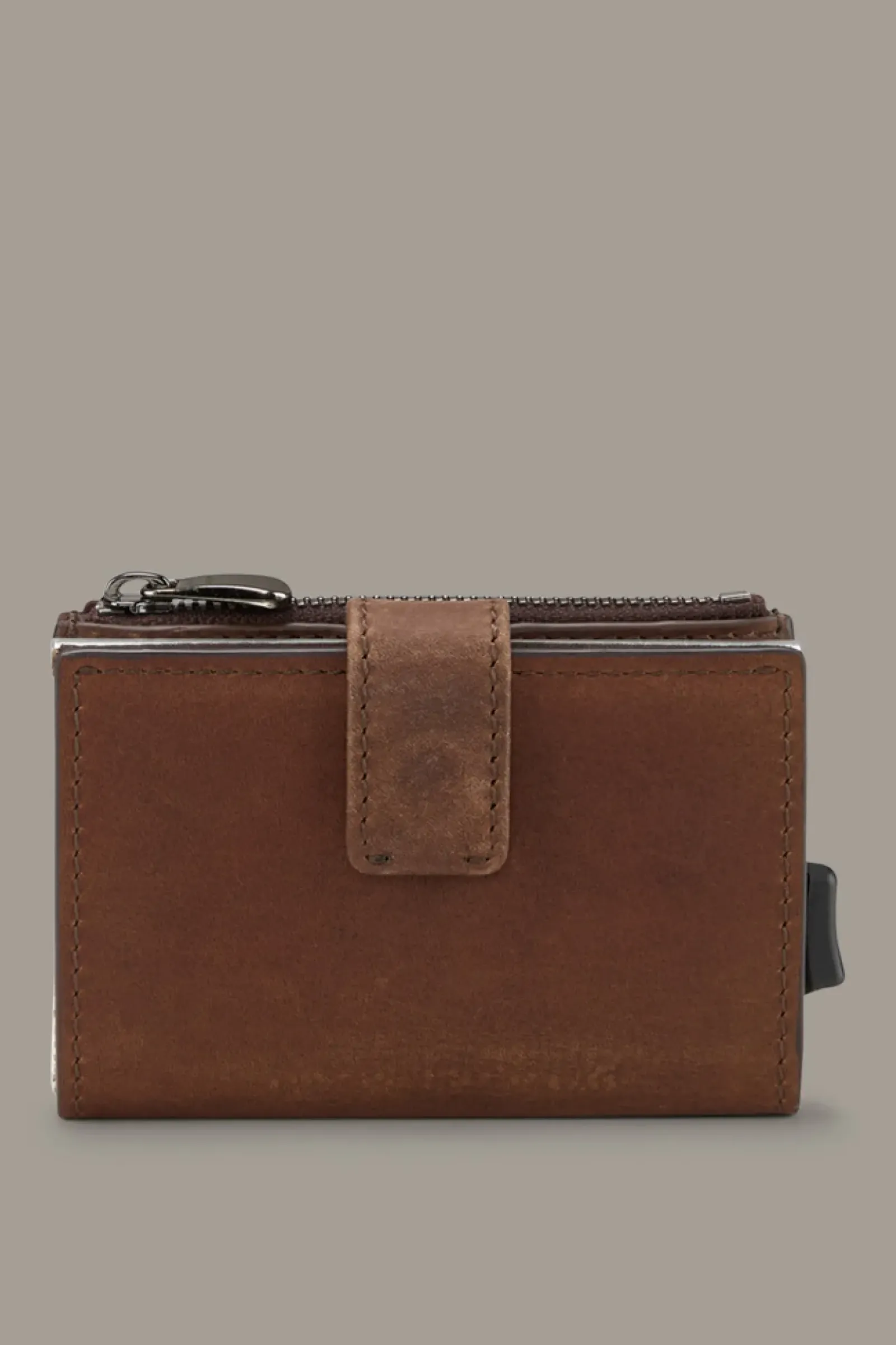 Alles safe verwahrt: Das aufklappbare E-Cage-Kartenetui C-Four Camden überzeugt aus reinem Leder mit Vintage-Finish, ausgestattet mit Aluminium-Case, extra Zip-Münzfach und stilvollem Riegelverschluss. Inklusive RFID Safe-System.