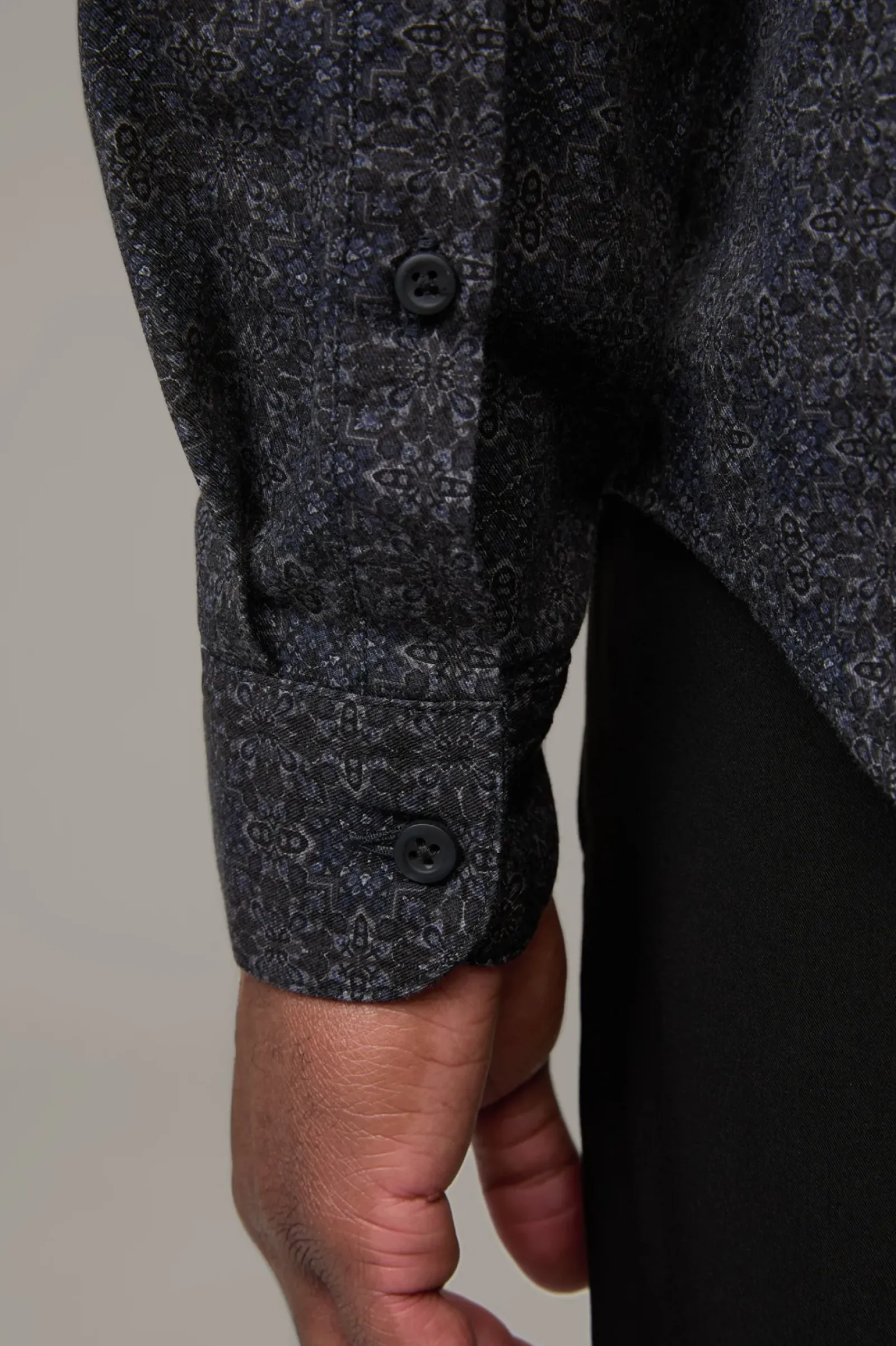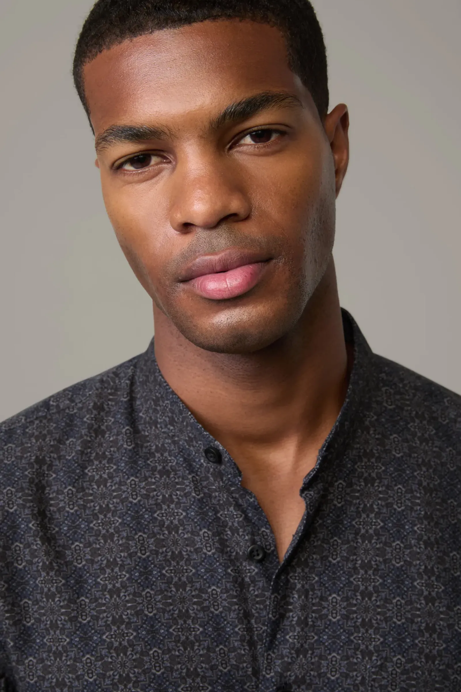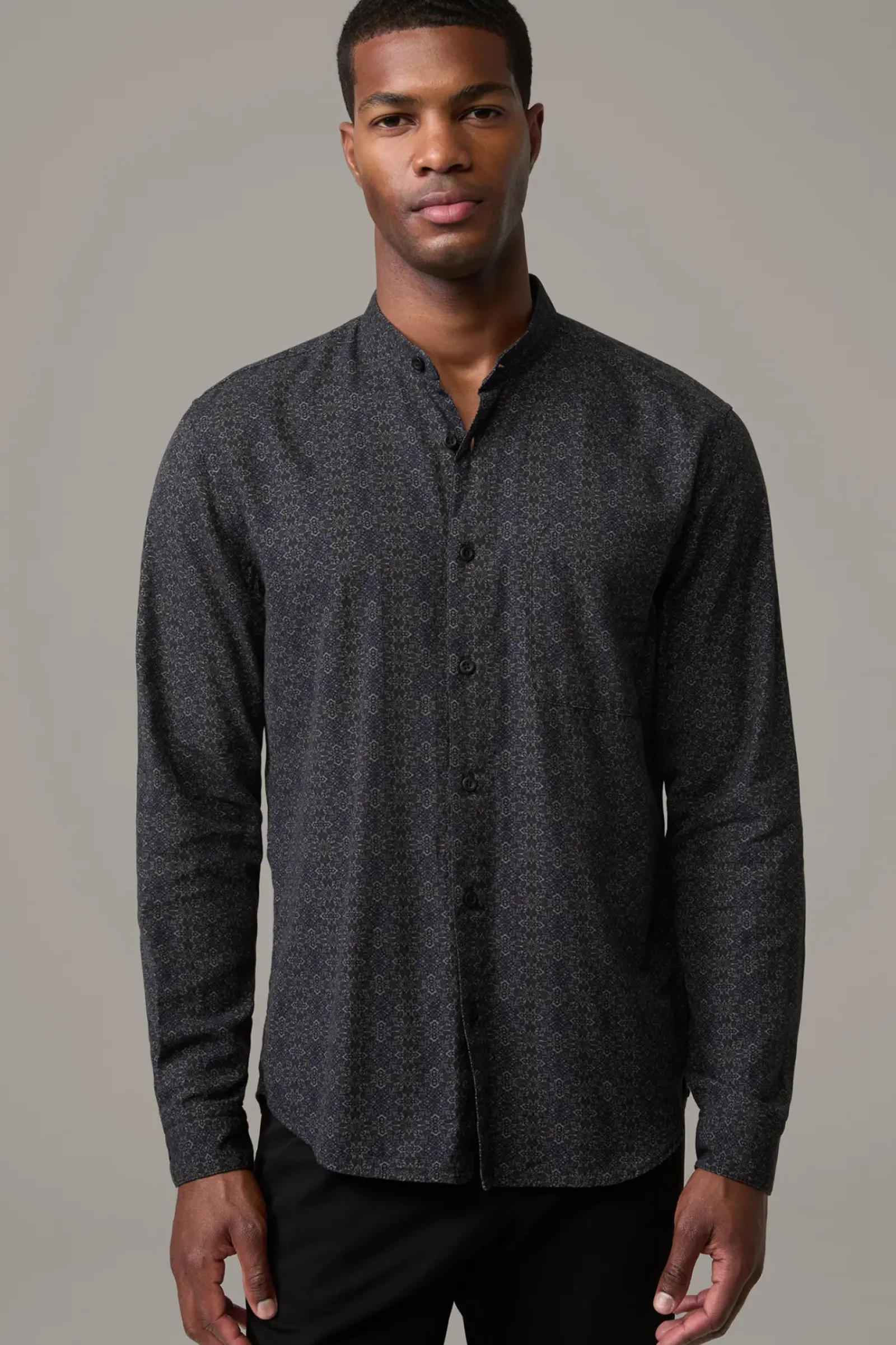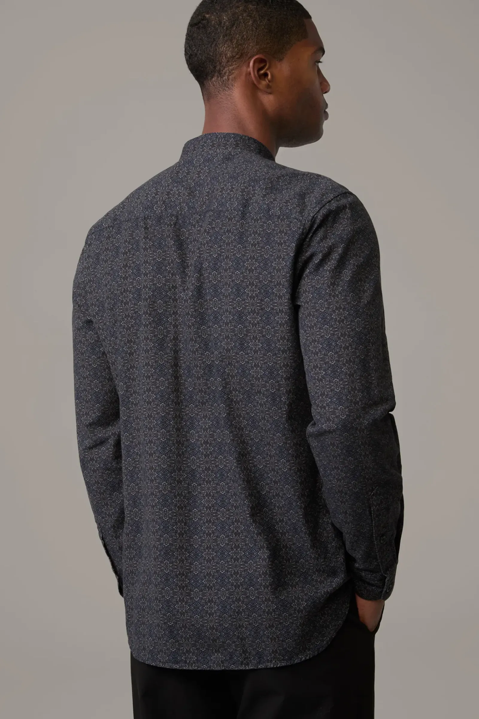 Das Hemd Caydan überzeugt im modernen Allover mit schmalem Stehkragen, Manschettenärmeln und abgerundetem Saum. Aus reinem Cotton.