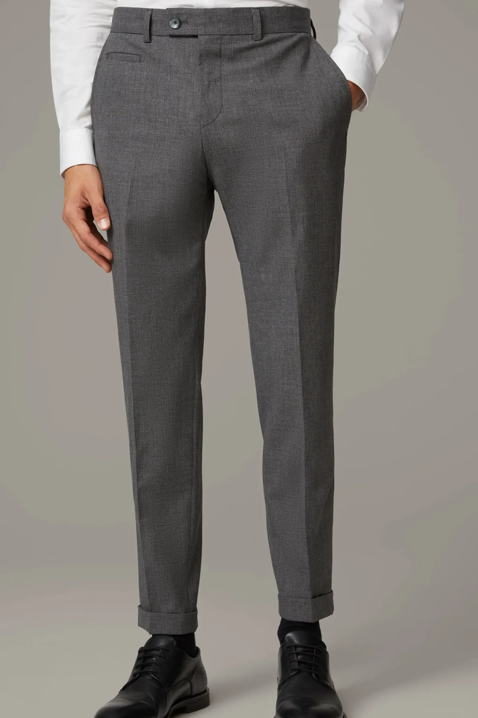 Im relaxten Style präsentiert sich die Anzughose Luc. Klassisches Flair verleihen Bügelfalten Knopfriegel und Taschen-Elemente. Fixierte Umschläge am Hosensaum sorgen für ein urbanes Finish.