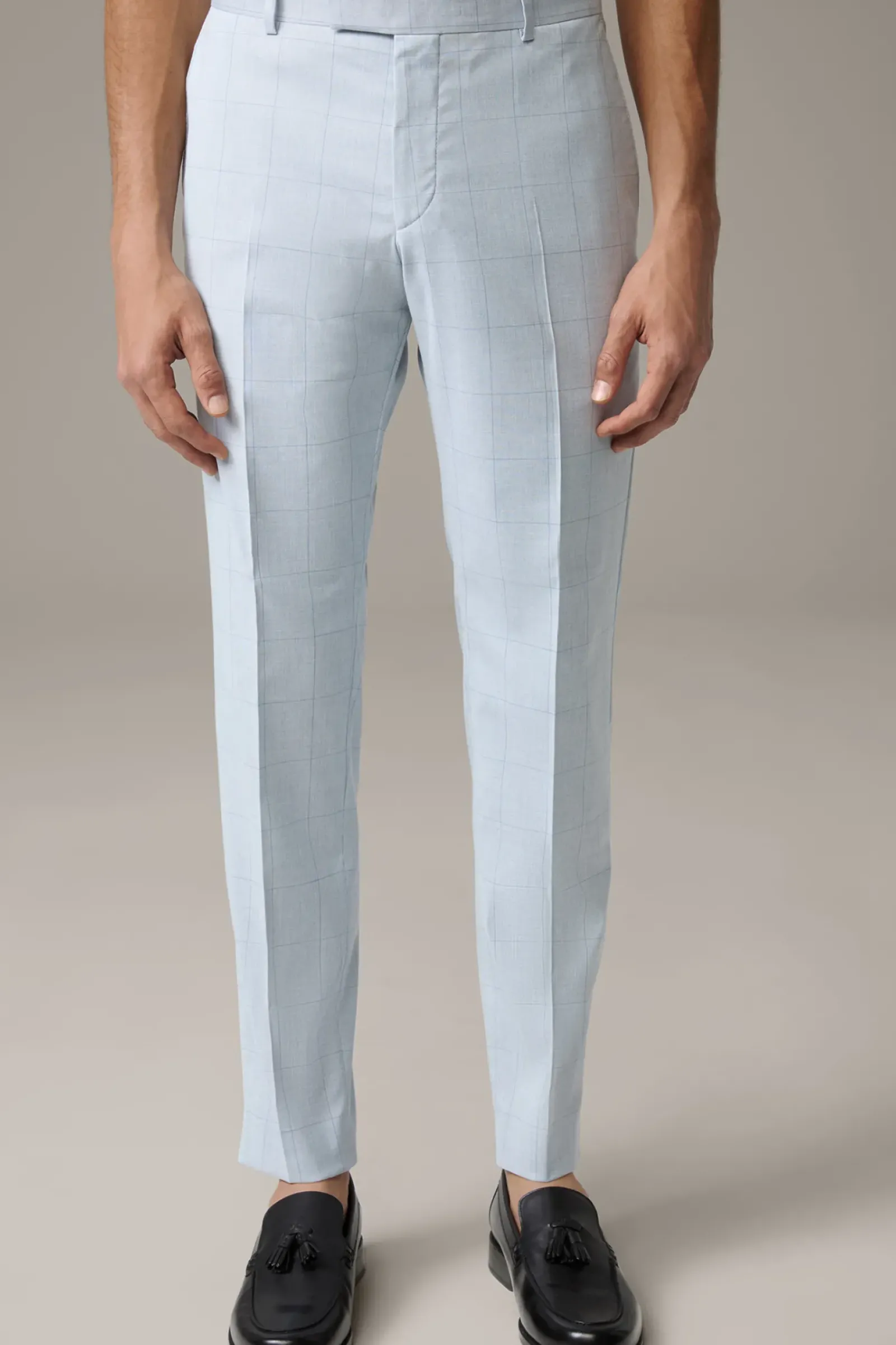 Smarte Ergänzung zum Sakko: die Anzughose Madden in extraschmaler Silhouette im Check-Print mit klassischen Paspelgesäßtaschen, Zip- und Hakenverschluss und Bügelfalten. Viskosemix mit recycelten technischen Fasern.