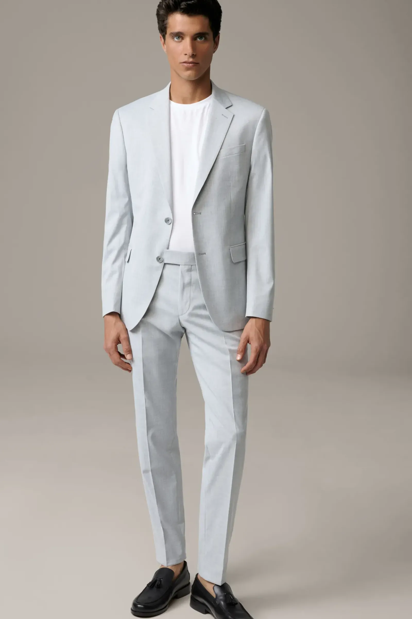 Aus Viskose-Blend in moderner Wool-Optik: Anzughose Melwin aus der flexibel kombinierbaren Baukasten-Serie. Mit verdecktem Zipper, Gürtelschlaufen und Paspelgesäßtaschen.