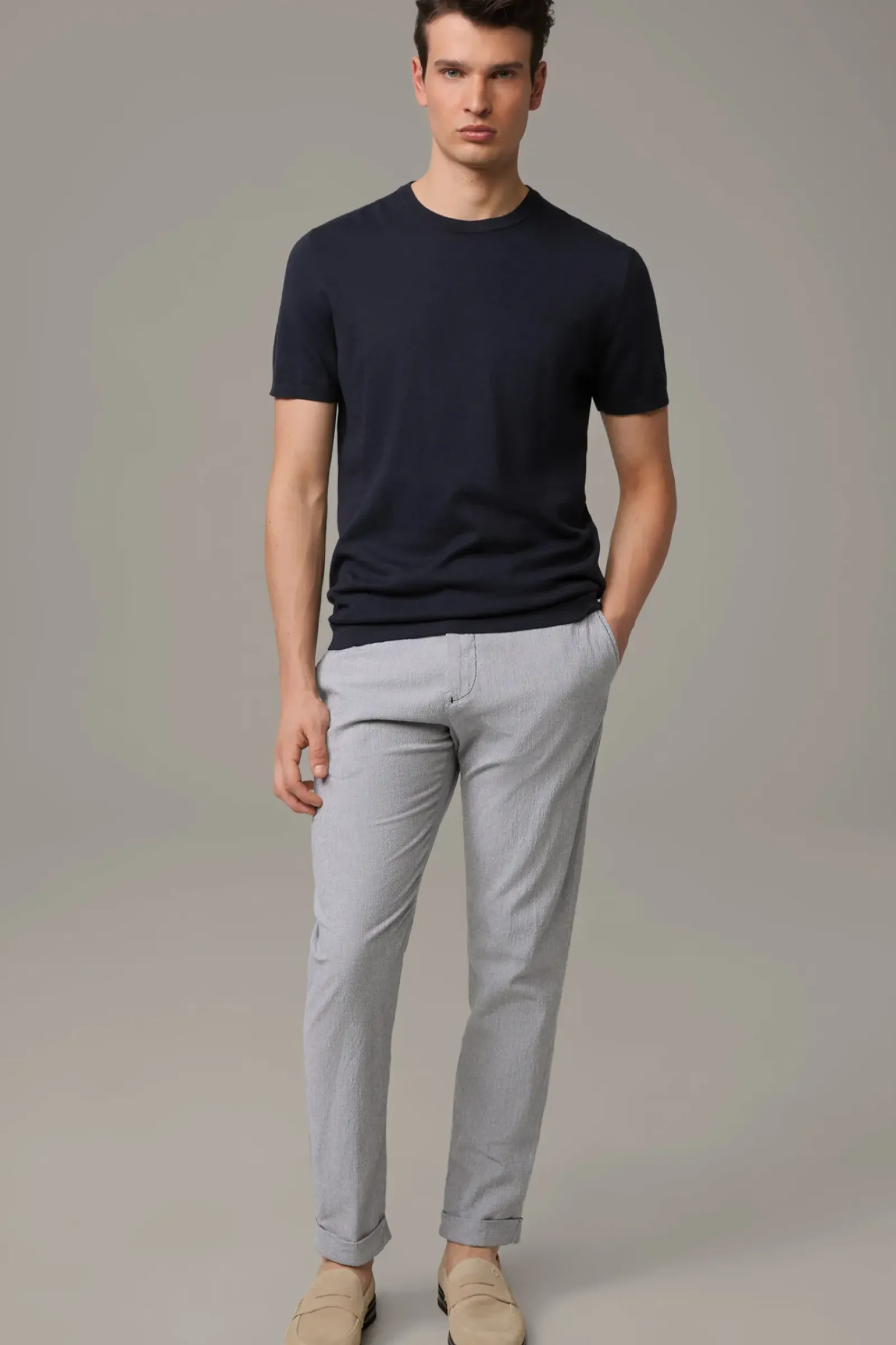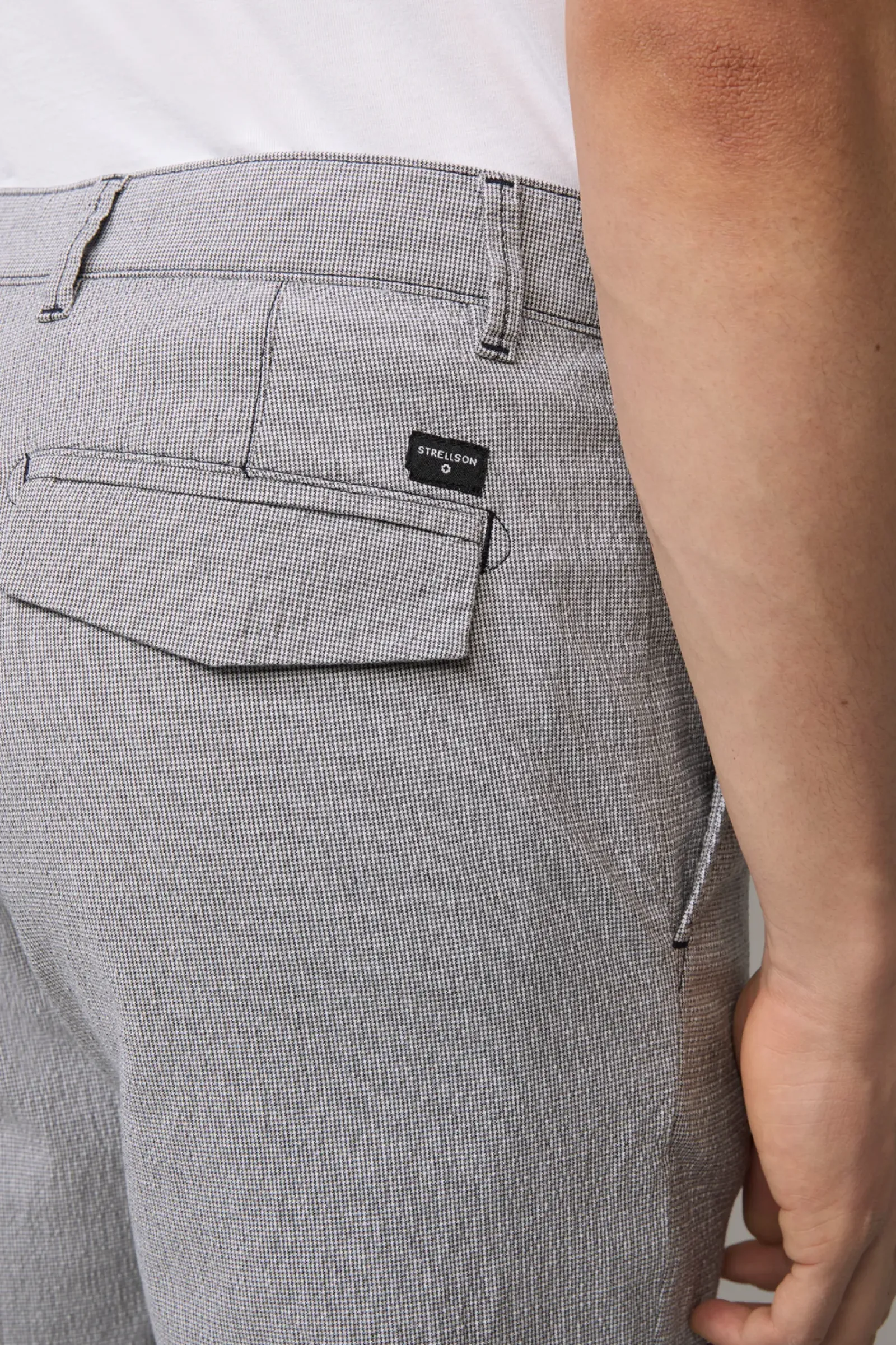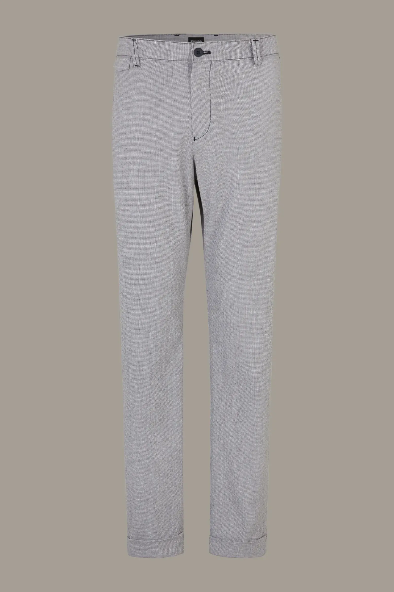 Im strukturierten Minimal-Print mit kontrastiven Nähten überzeugt die Chino Luc mit klassischen Details wie paspelierten Pattengesäßtaschen und fixierten Umschlägen am Hosensaum.