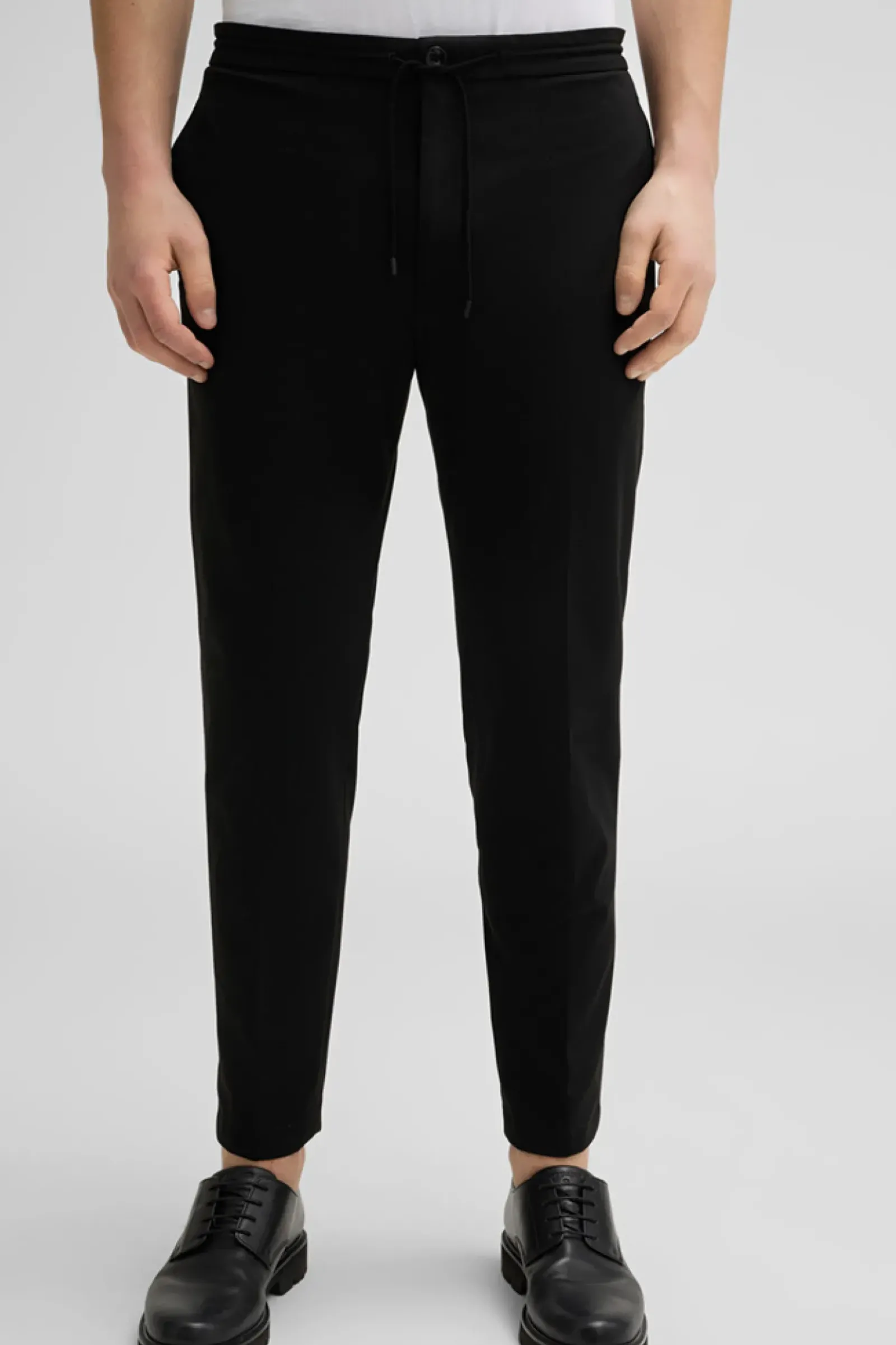 Die Flex Cross Anzughose Saturn überzeugt mit moderner Tech-Qualität, schmaler Silhouette und einem Bund mit lässigem Tunnelzug-Element, ergänzt durch klassische Eingriff- und Gesäßtaschen – passend zum Sakko Arndt.