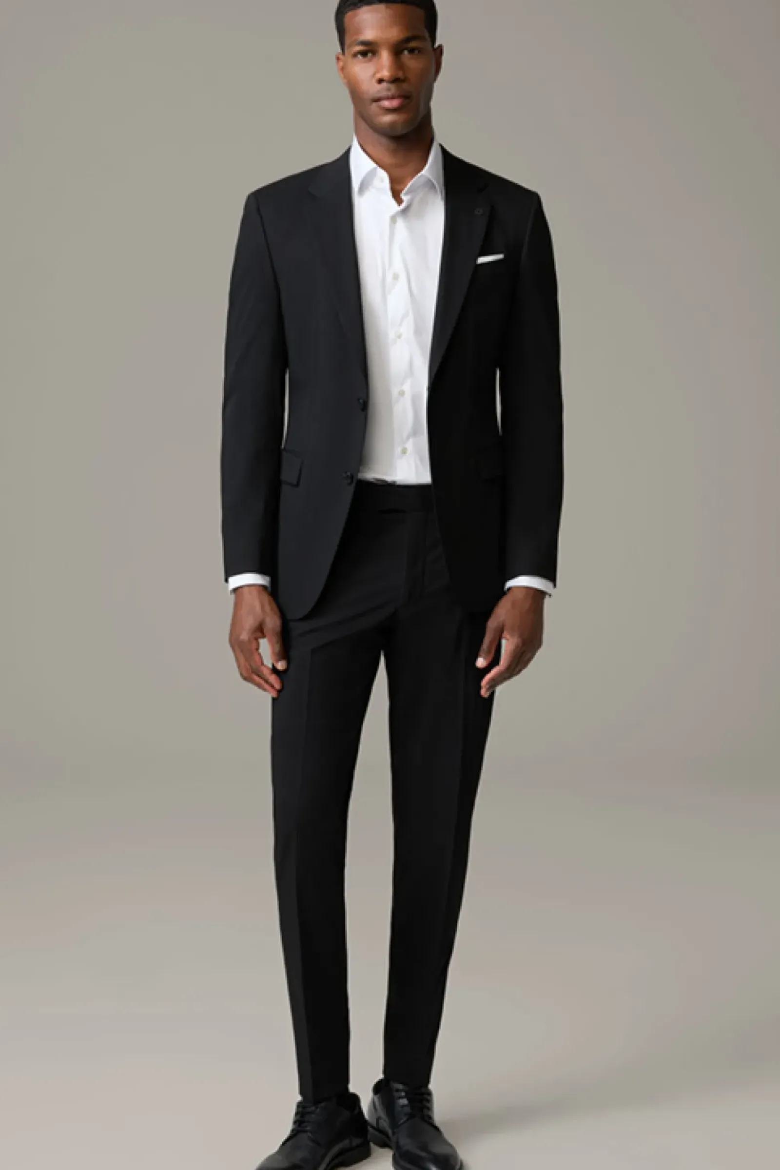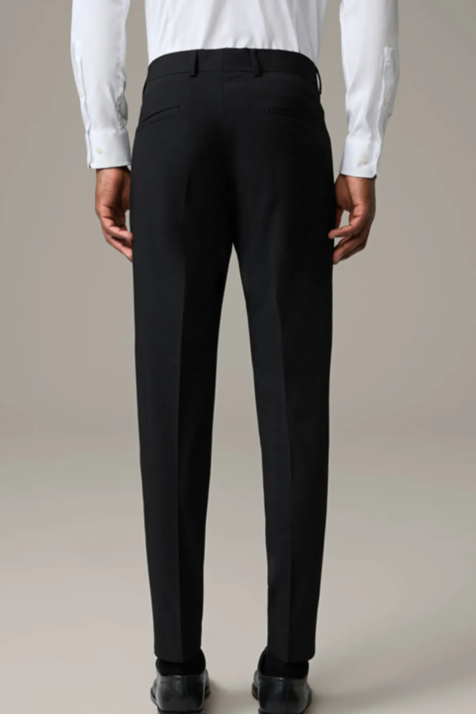 Ein Doppelhaken und Leistengesäßtaschen zeichnen die Anzughose Melwin aus. Mit klassischen Bügelfalten und glattem Kniefutter.
