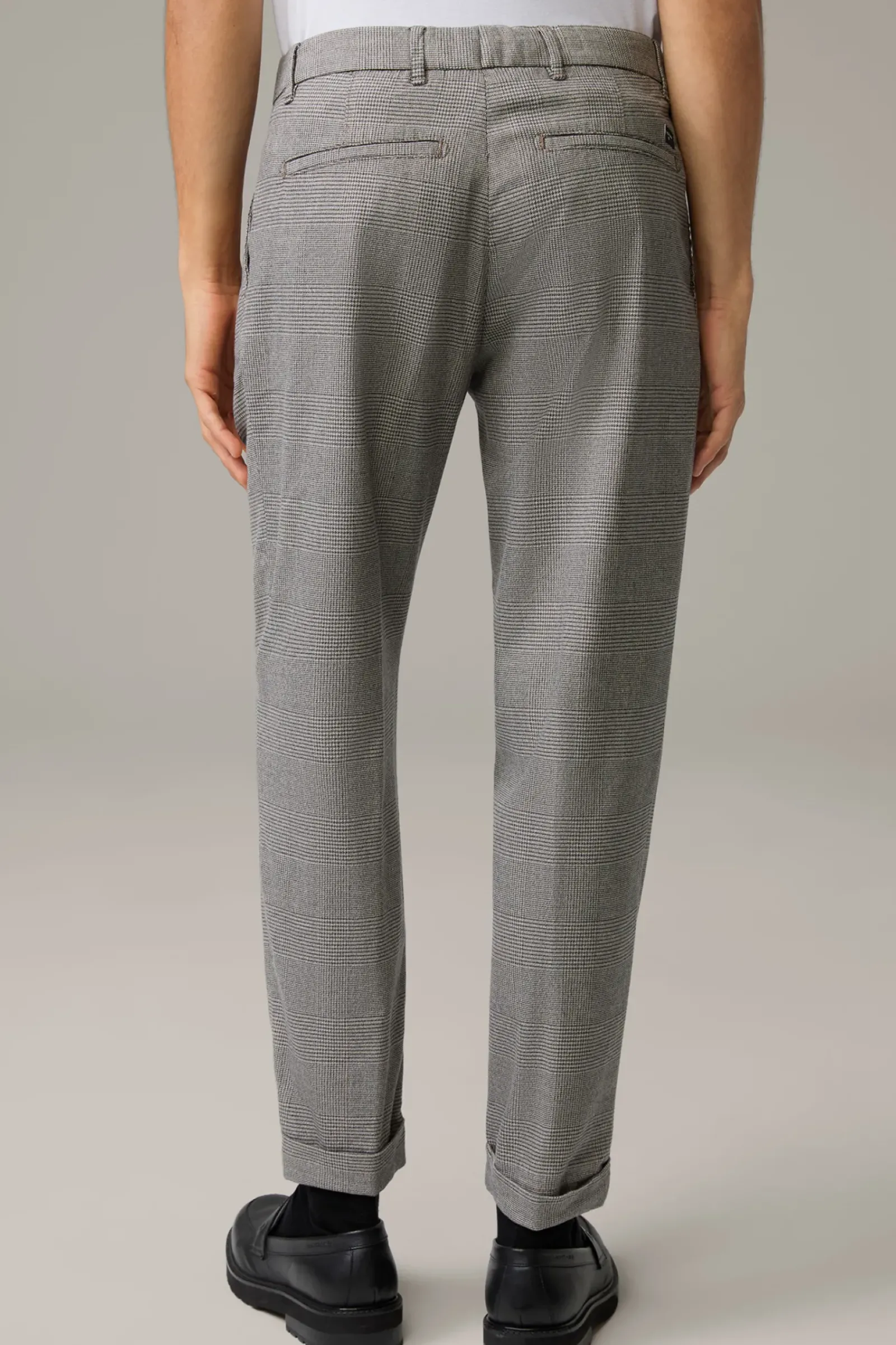 Casual Smart: die Bundfaltenhose Louis aus Cotton-Stretch im Glencheck Look. Die verkürzte Hosensilhouette, der Karabiner mit Logo-Band und fixierte Saumumschläge ergänzen das urbane Design.