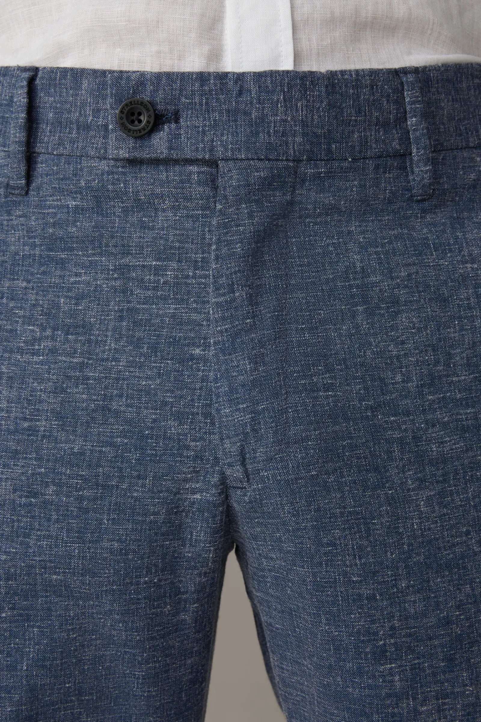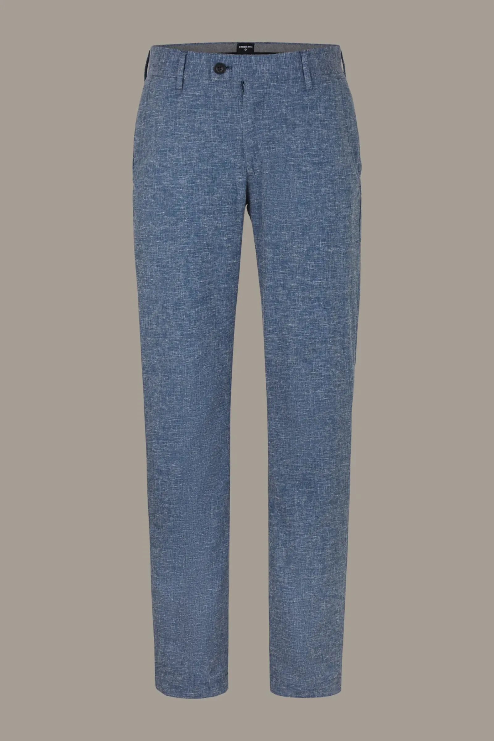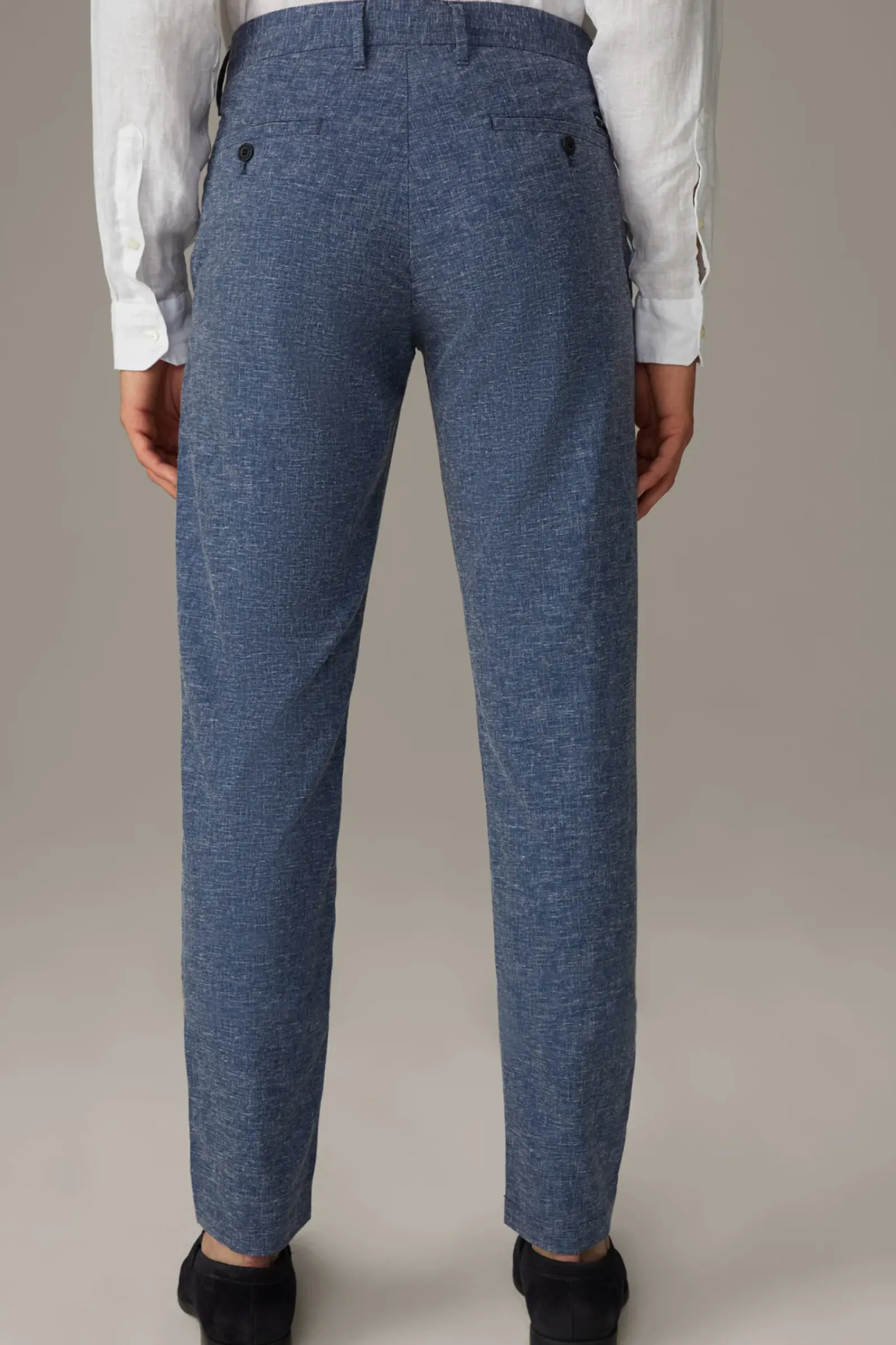 Typisches Flex Cross Piece: Chino Code aus leichtem Leinen-Viskose-Blend in schmaler Passform mit versetzter Knopfschließe, abgeschrägten Seiten- und knöpfbaren Gesäßtaschen.