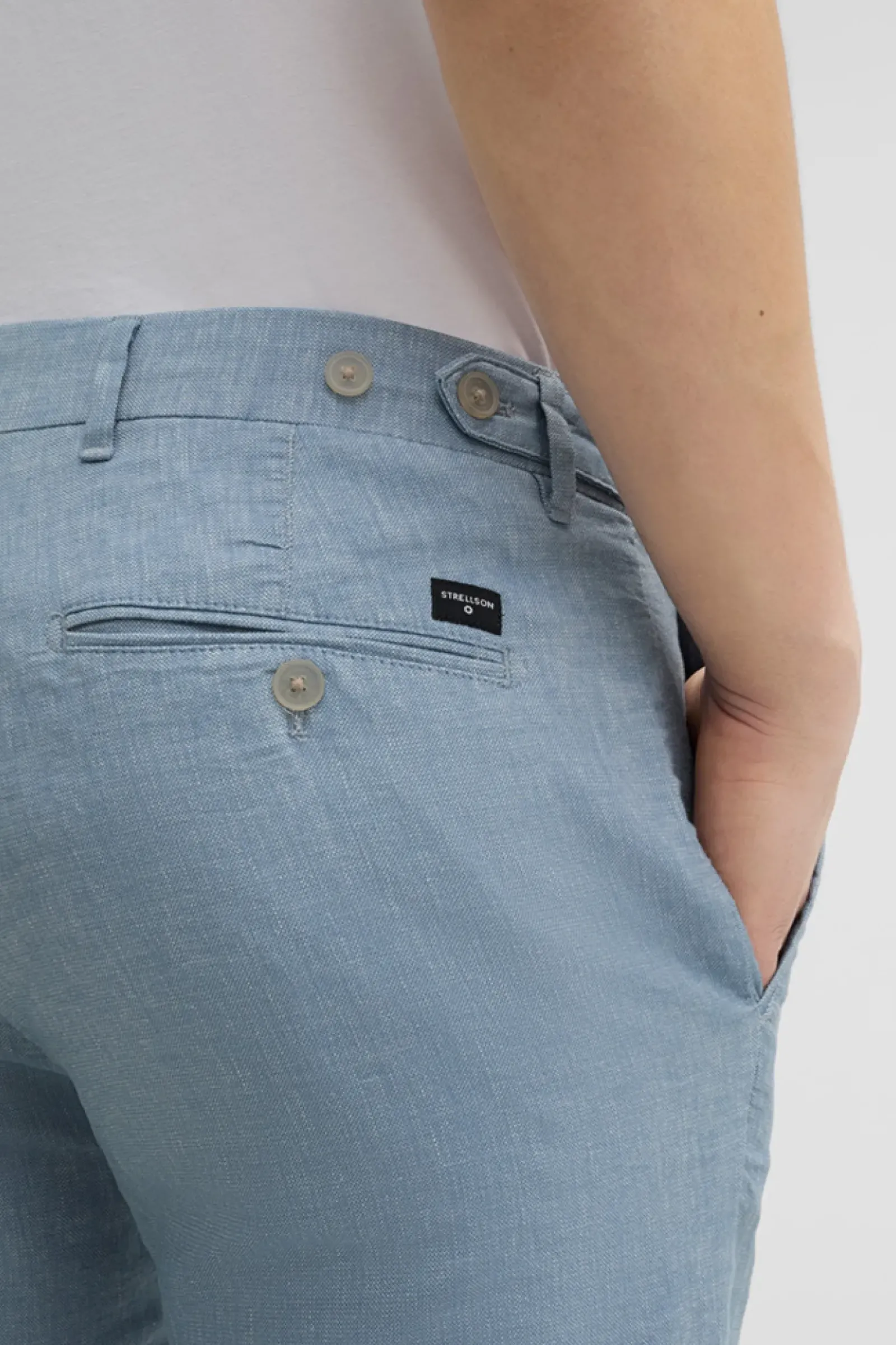 Komfortabler Favorit für den Look: die Chino Rion in stretchiger Baumwoll-Leinen-Mischung mit justierbaren Riegeln am Bund. Paspelierte Gesäßtaschen und feine Signature-Details machen das Flex Cross Piece komplett.