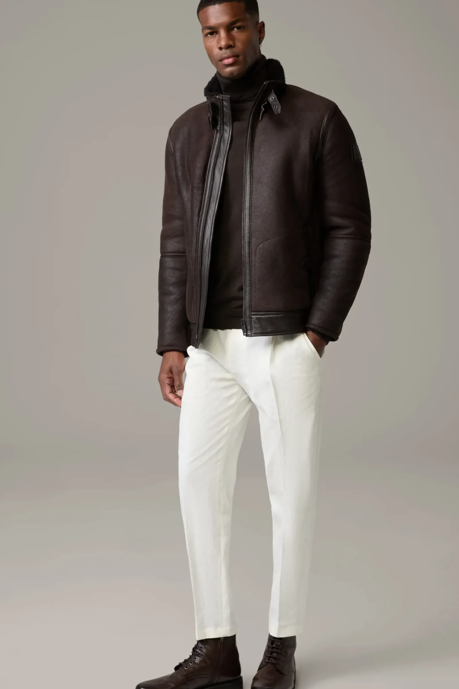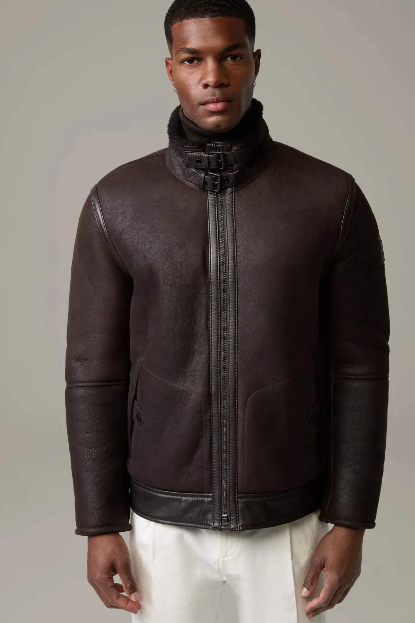 Edles Item aus Shearling im Biker-Stil: die Lederjacke Shelter mit Stehkragen und Riegeldetails. In Doubleface-Qualität.