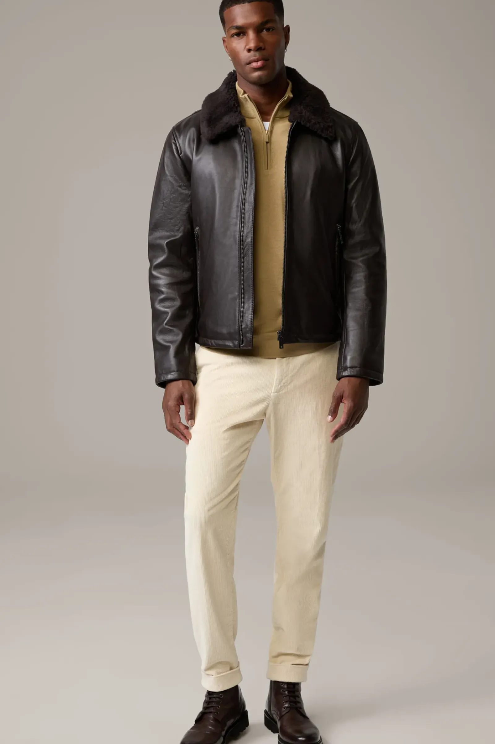 Urbanes It-Piece: die Lederjacke Monty mit einem Umlegekragen aus Lammfell. Zippertaschen und Teilungsnähte prägen den Look. Mit wattiertem Stepp-Futter.