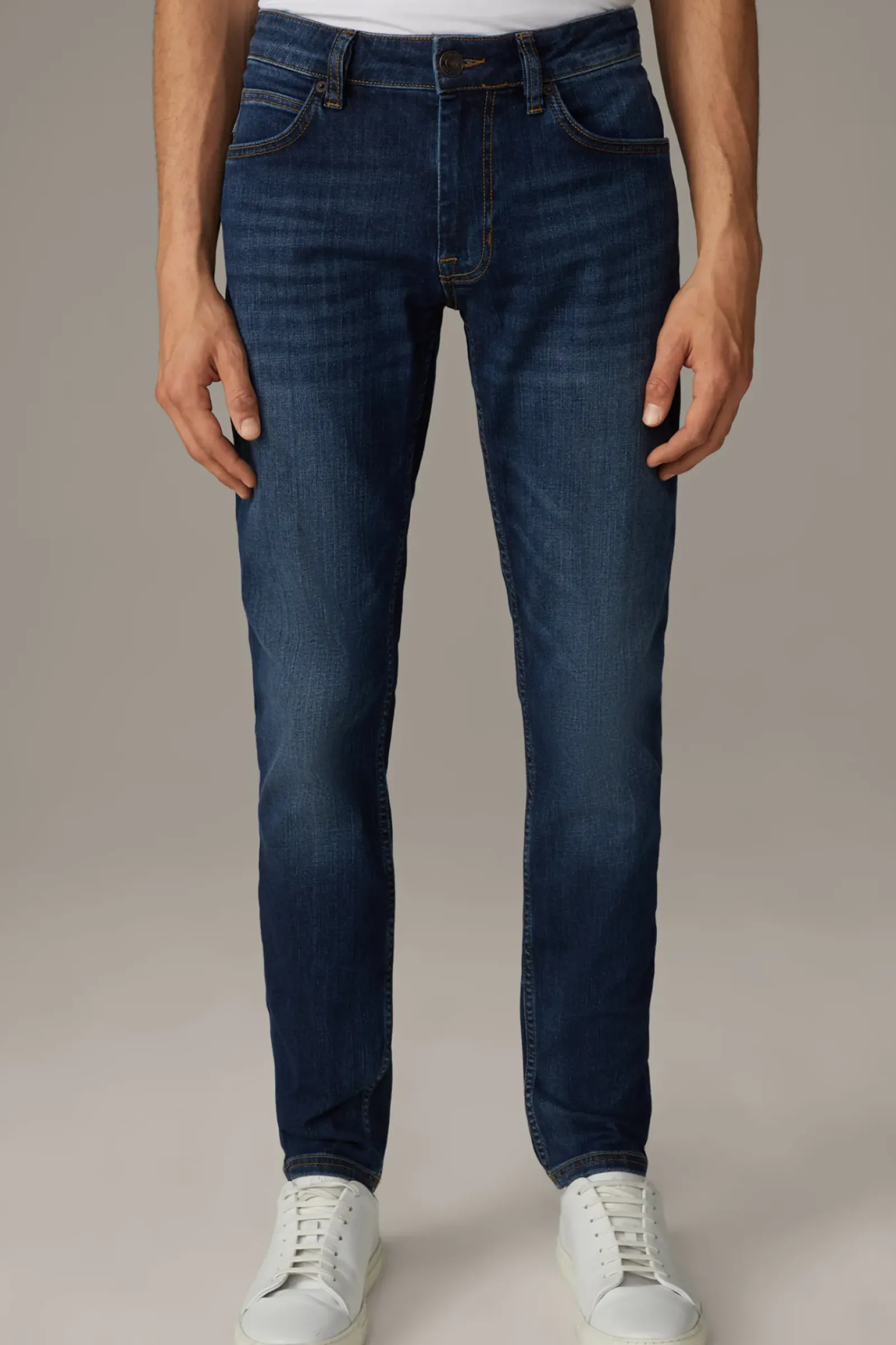 Essential für Daily-Looks: die schmal geschnittene Five-Pocket-Jeans Robin in performancestarker Flex-Cross-Qualität. Kontrastnähte, die Used-Waschung mit Moustache-Falten und Logo-Details prägen das Design.