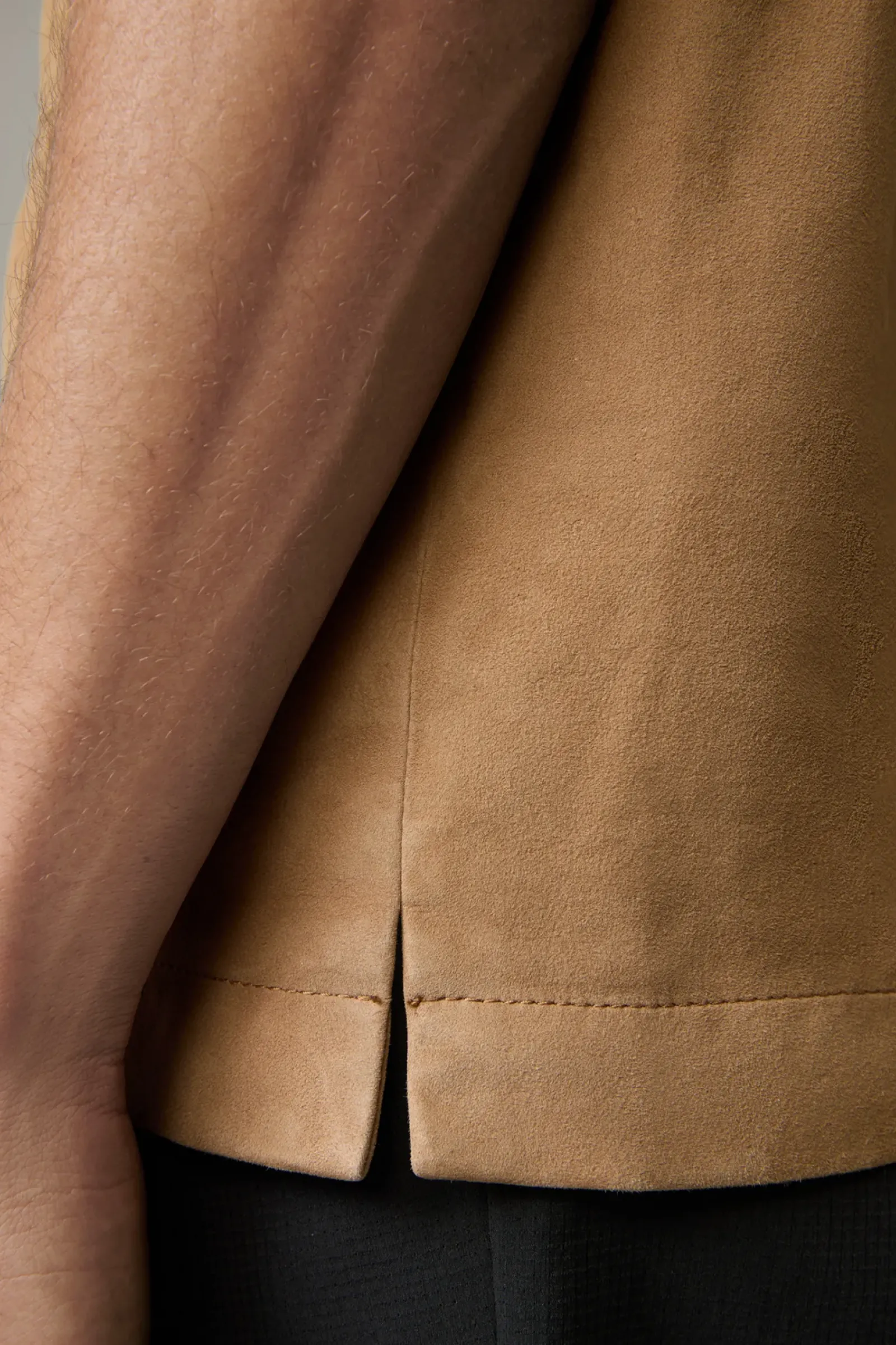 From Spring to Fall: das kurzärmelige Overshirt Indio aus Veloursleder überzeugt als vielseitiges Key Piece. Akzente setzen Seitenschlitze am Saum und die logogeprägte Druckknopfleiste.