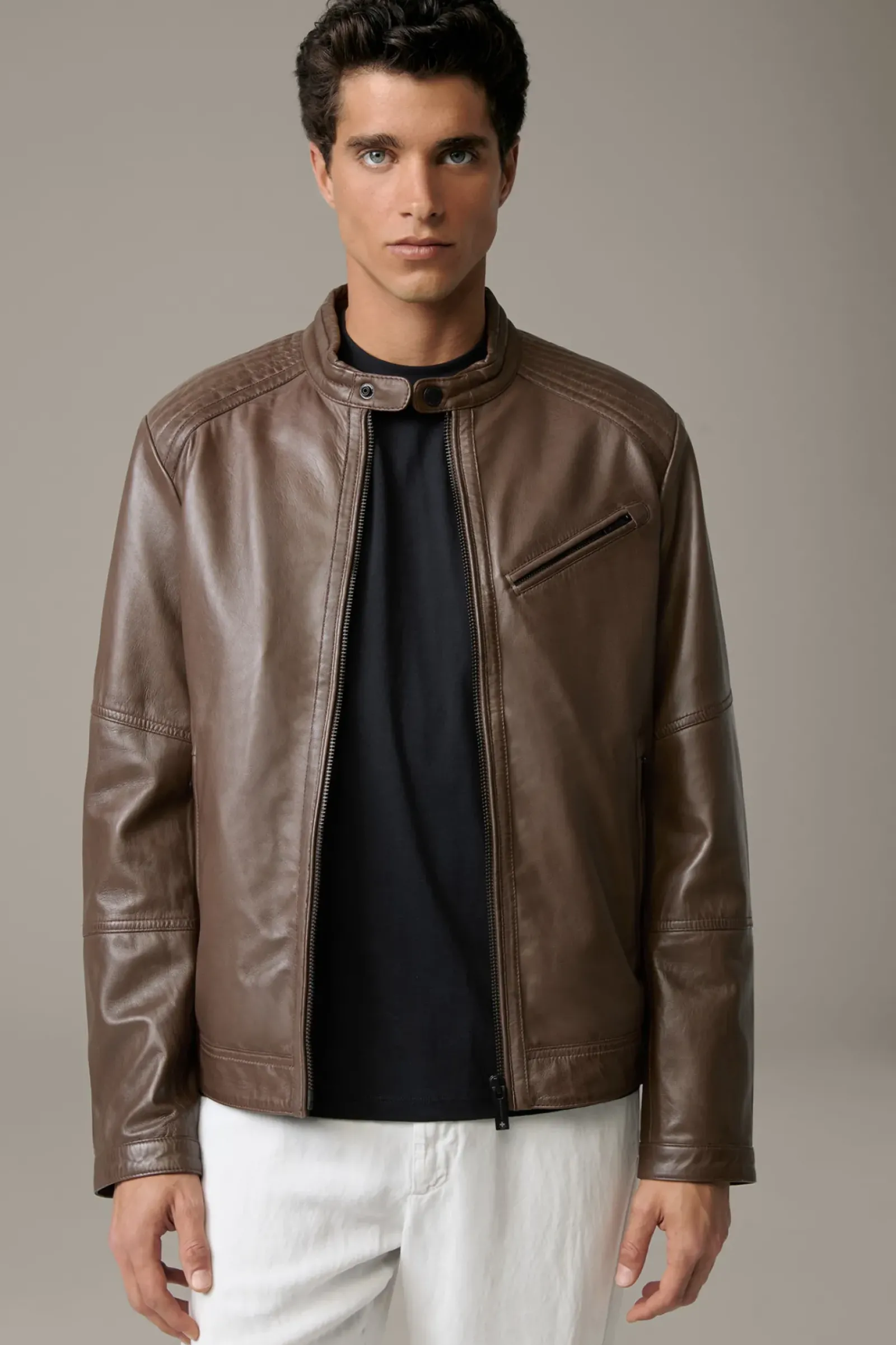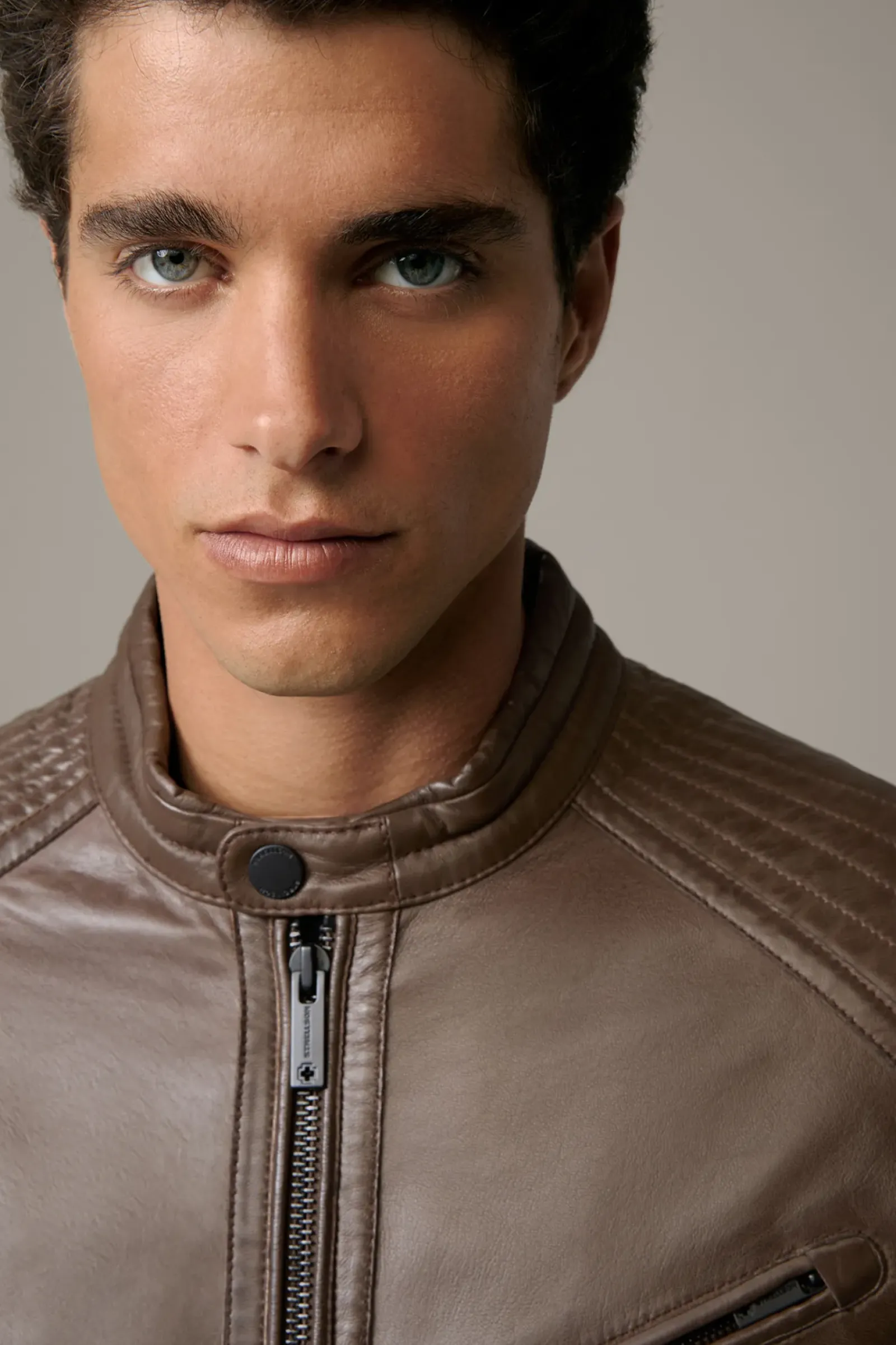Cooles Item im Bikerstil: die Lederjacke Wells mit knöpfbarem Stehkragen, Zippertaschen und gesteppter Schulterpartie. Aus reinem Lammnappa, vollgefüttert.