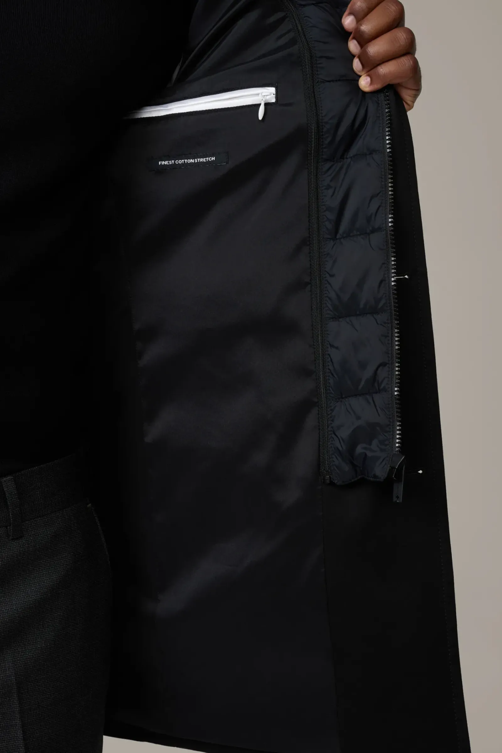 Begeistert als moderner Einreiher mit Stehkragen und abzippbarem Stepp-Inlay. Perforiertes Teilfutter und Bewegungsschlitz sorgen für Komfort.
