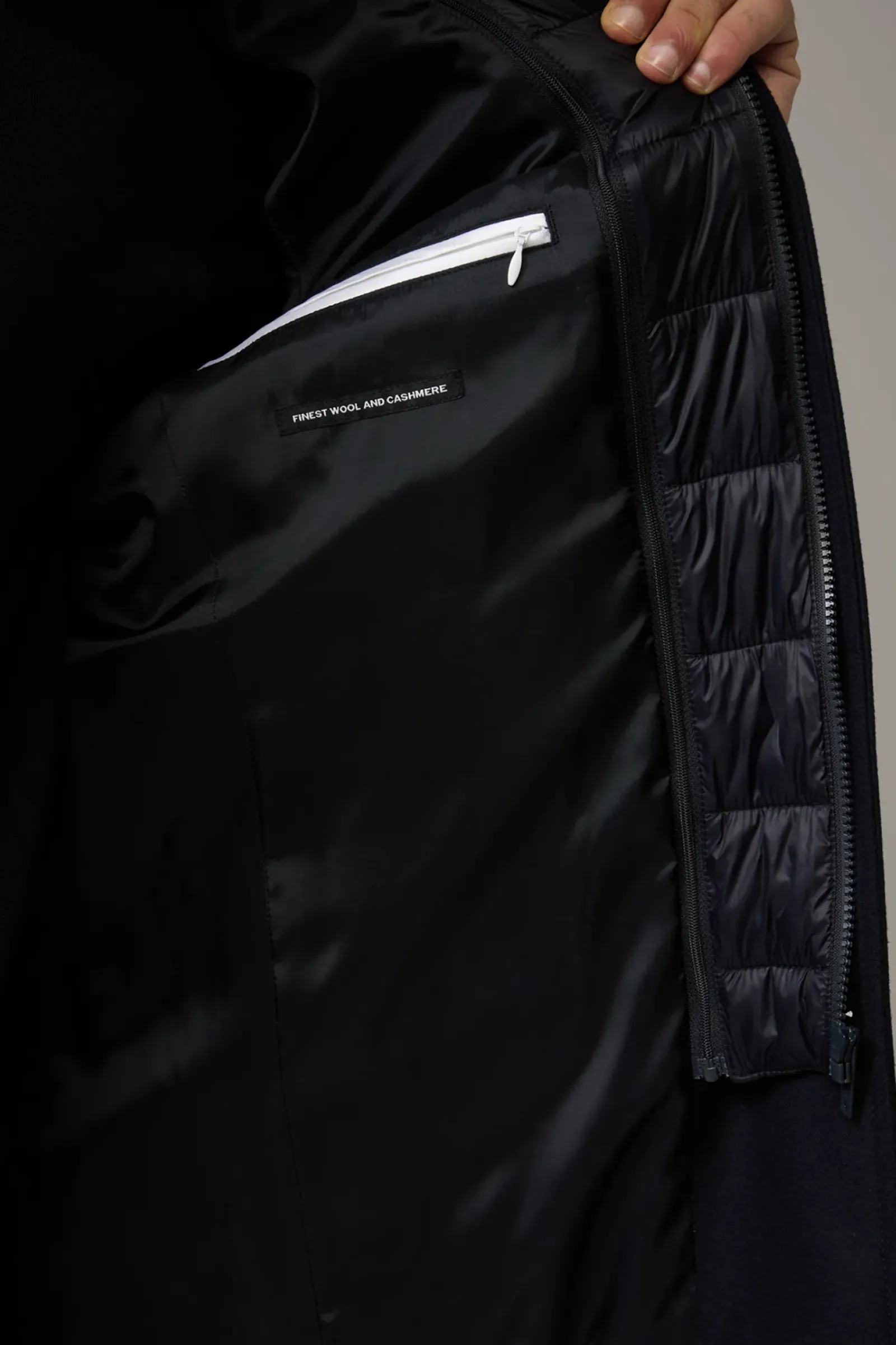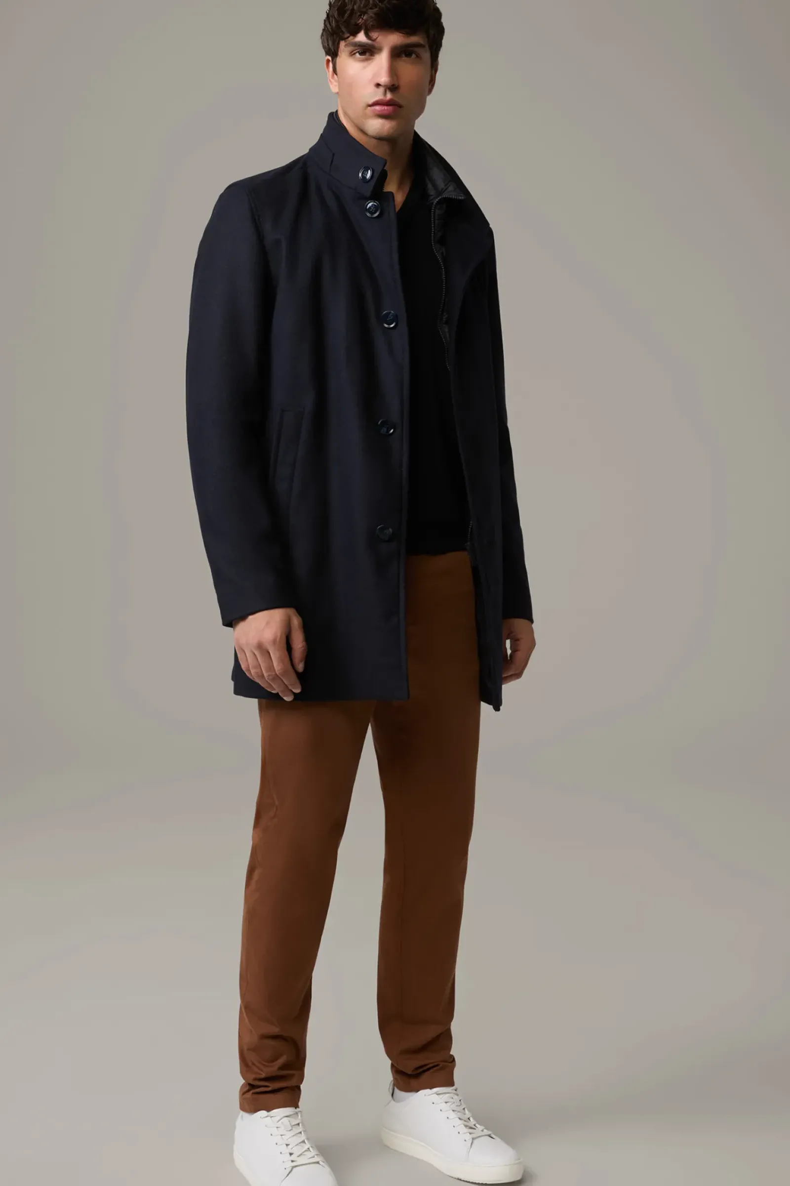 Klassischer Einreiher mit Stehkragen und abzippbarem Stepp-Inlay: der Mantel Finlay im Wollmix mit Cashmere-Anteil. Teilgefüttert.