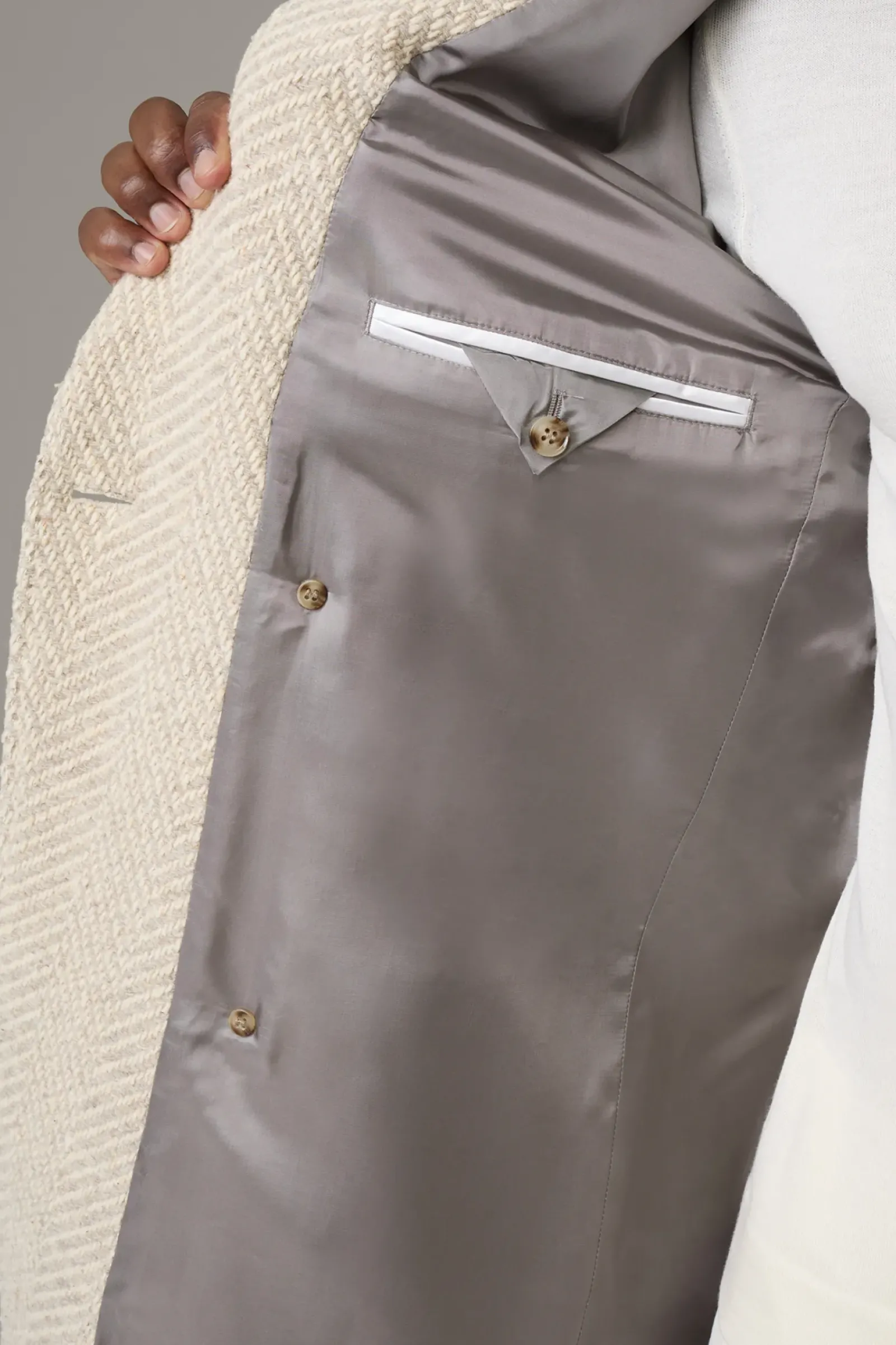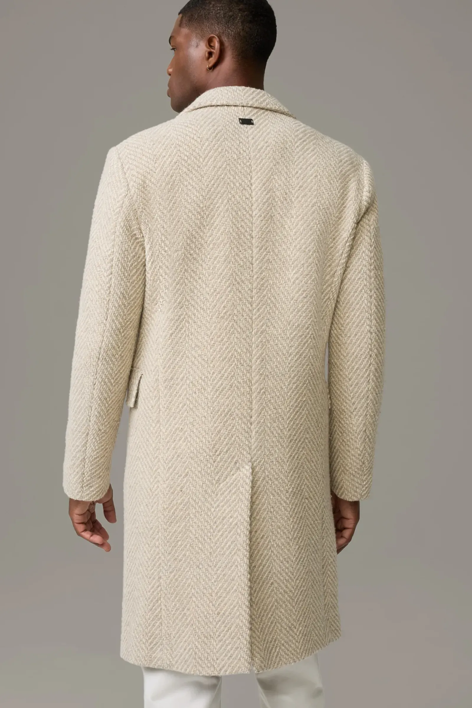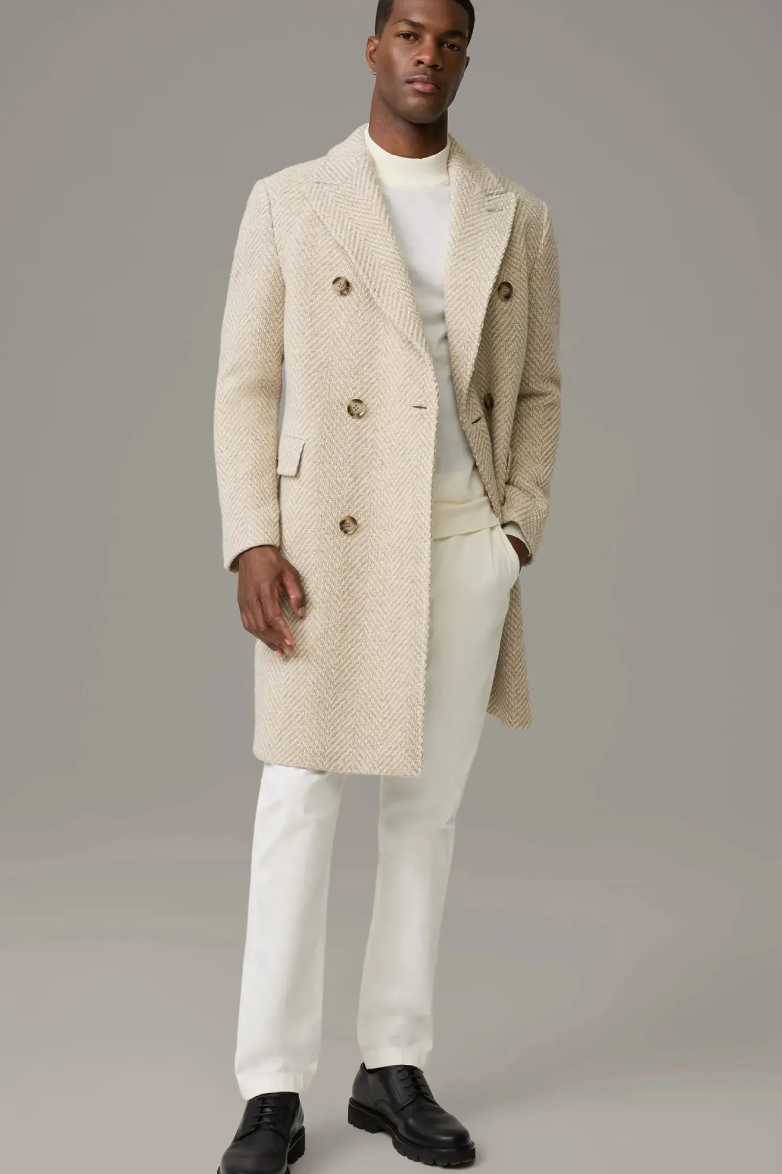Komfortables Piece: der Wollmix-Mantel Park Lane in Strick-Verarbeitung. Doppelreihig mit Pattentaschen, Reverskragen und Bewegungsschlitz. Italienische Weberei Nova Fides.