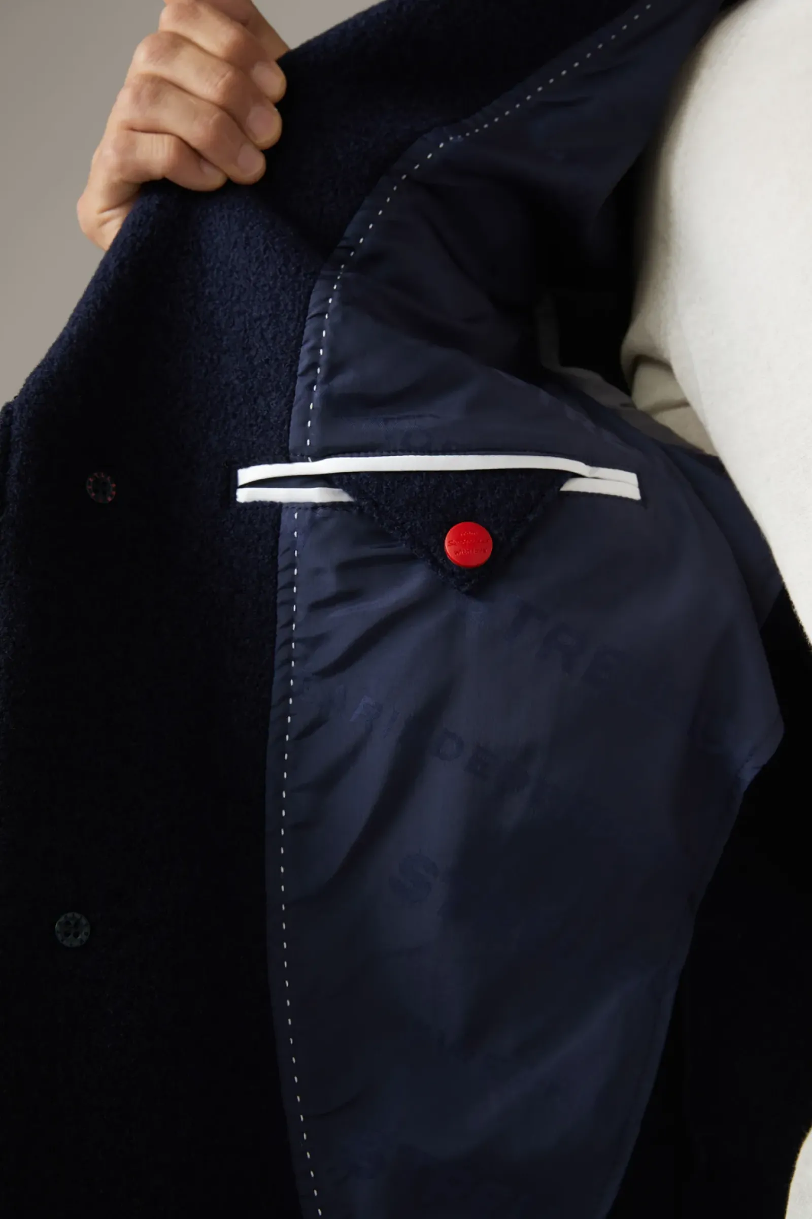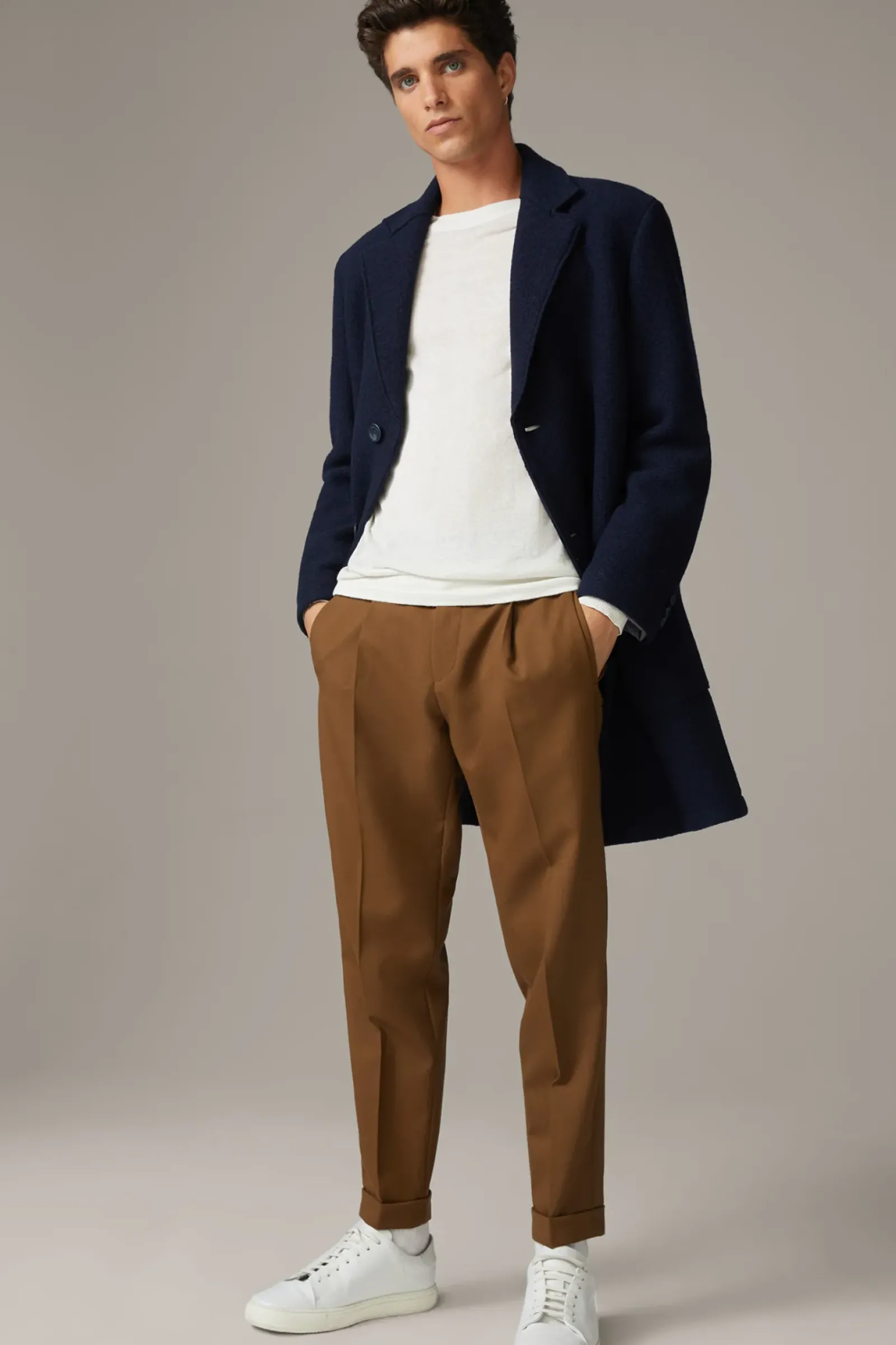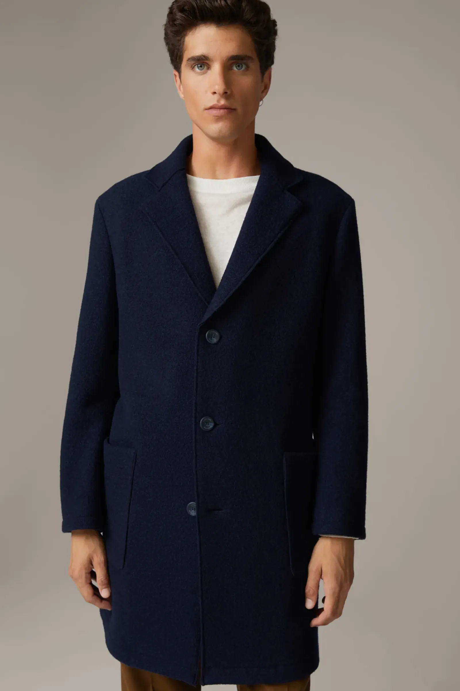 Stilvolles Piece: der Mantel Adria überzeugt mit klassischem Reverskragen und Pattentaschen. Akzente bieten Zierknöpfe an den Ärmelabschlüssen und eine dezente Logoplakette. Aus reiner Schurwolle.