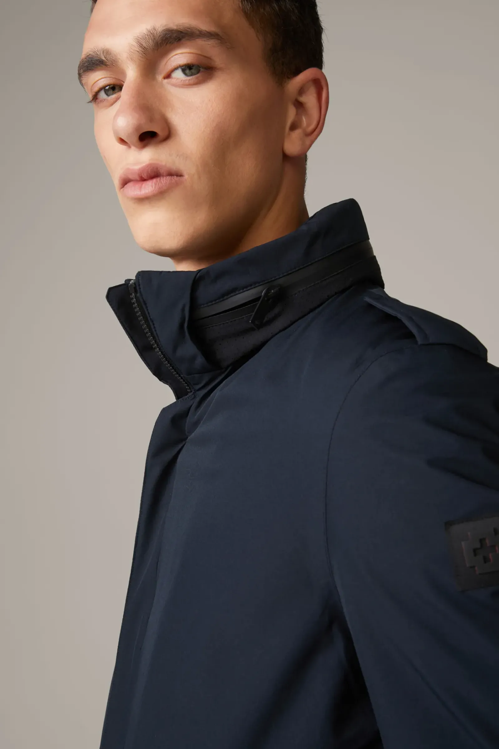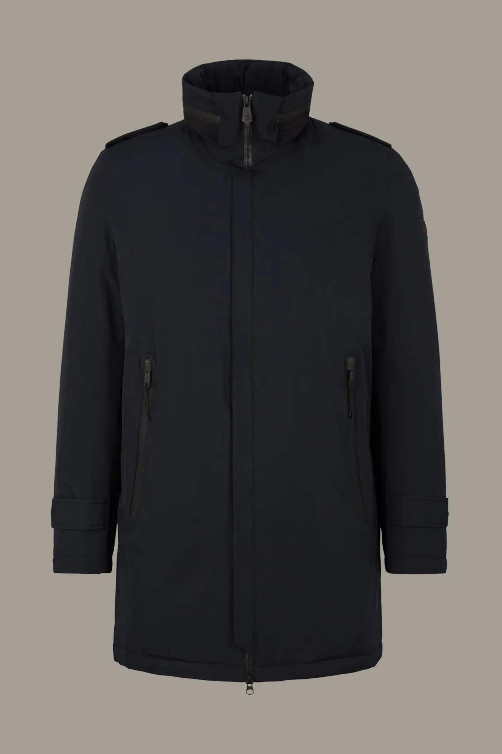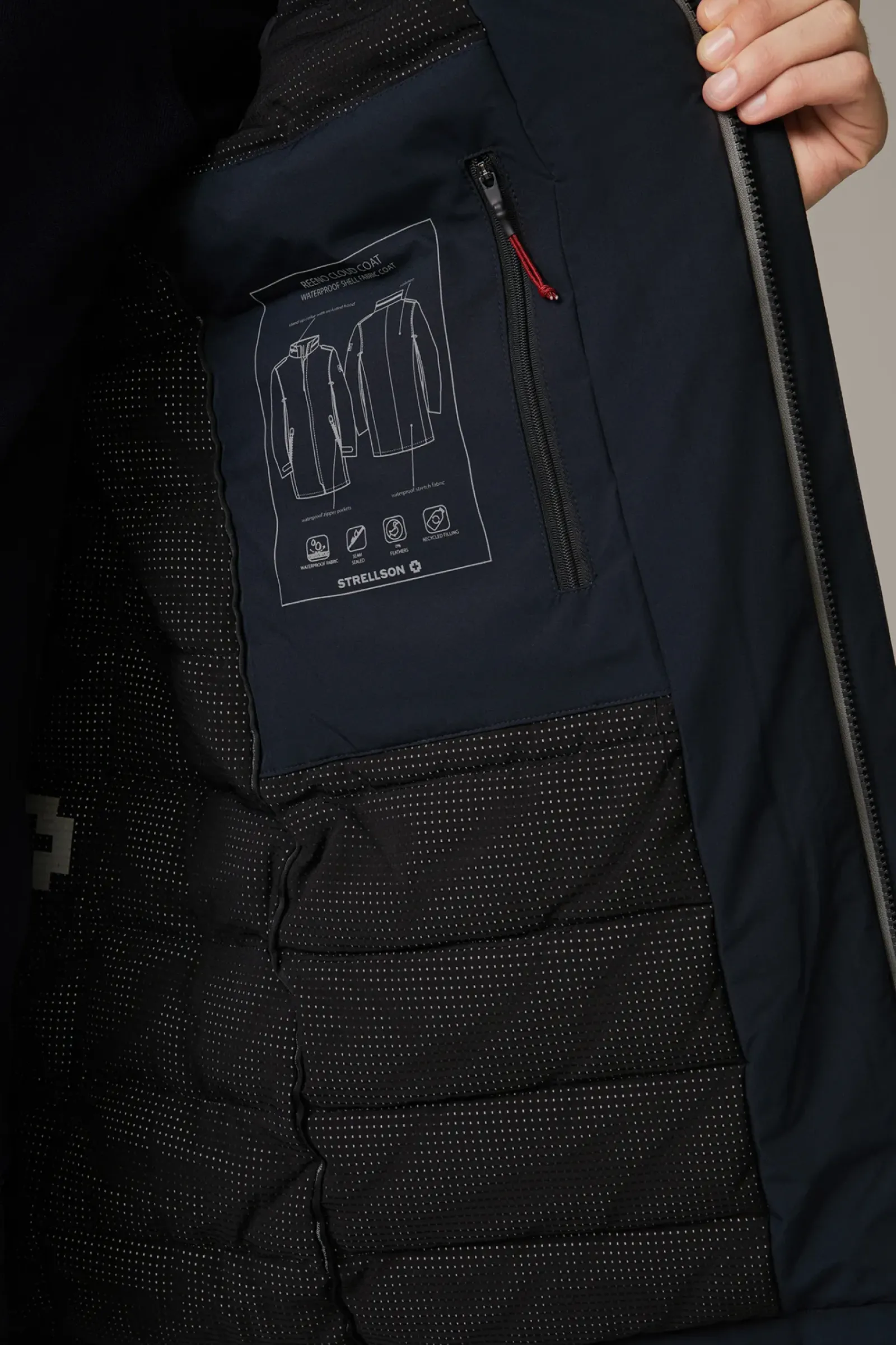 Der Kurzmantel Rene Cloud Coat begeistert in wasserfester Verarbeitung mit versiegelten Nähten und recycelter Füllung. Als innovatives Feature begeistert die versteckte Kapuze im Stehkragen.