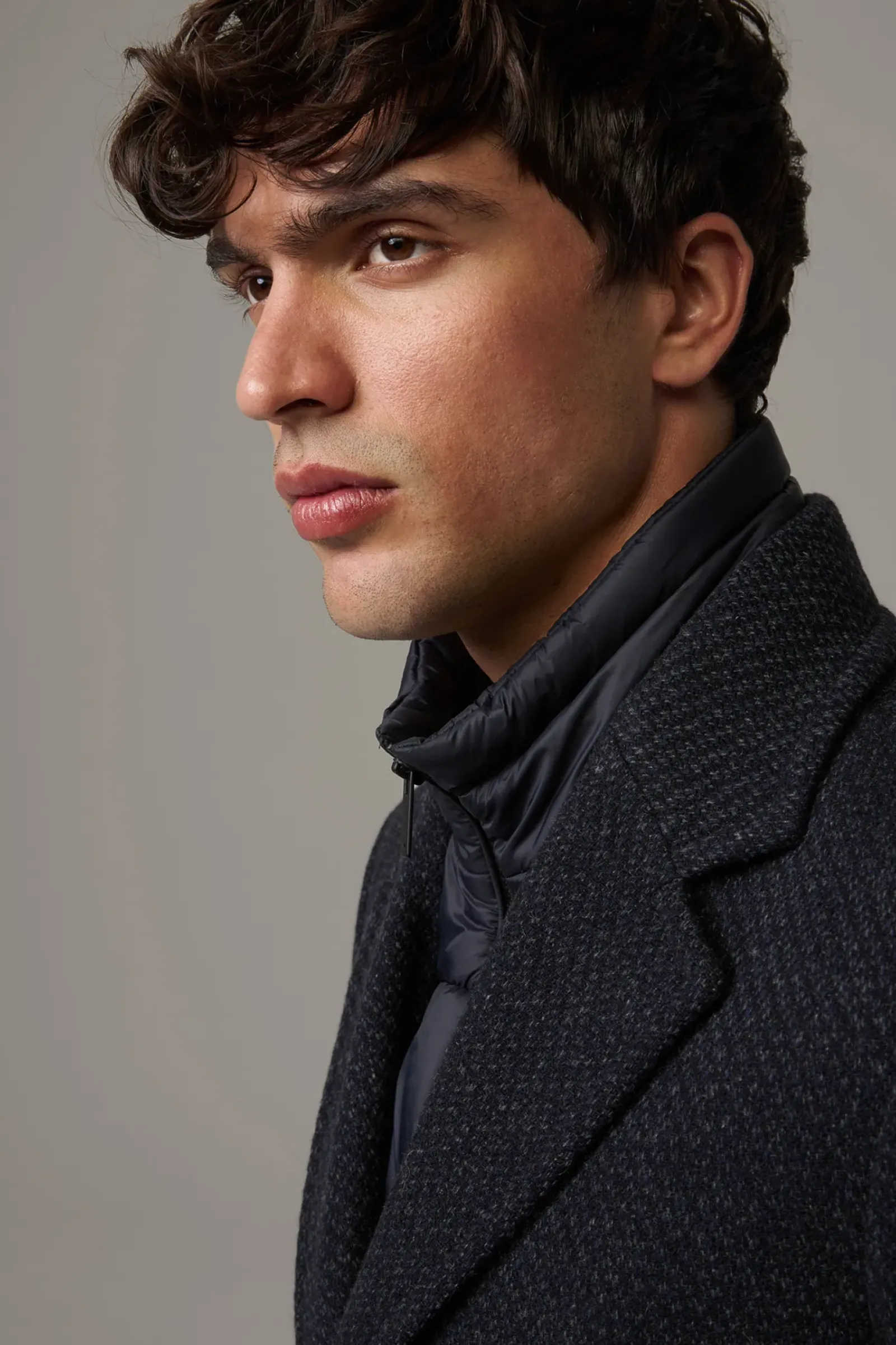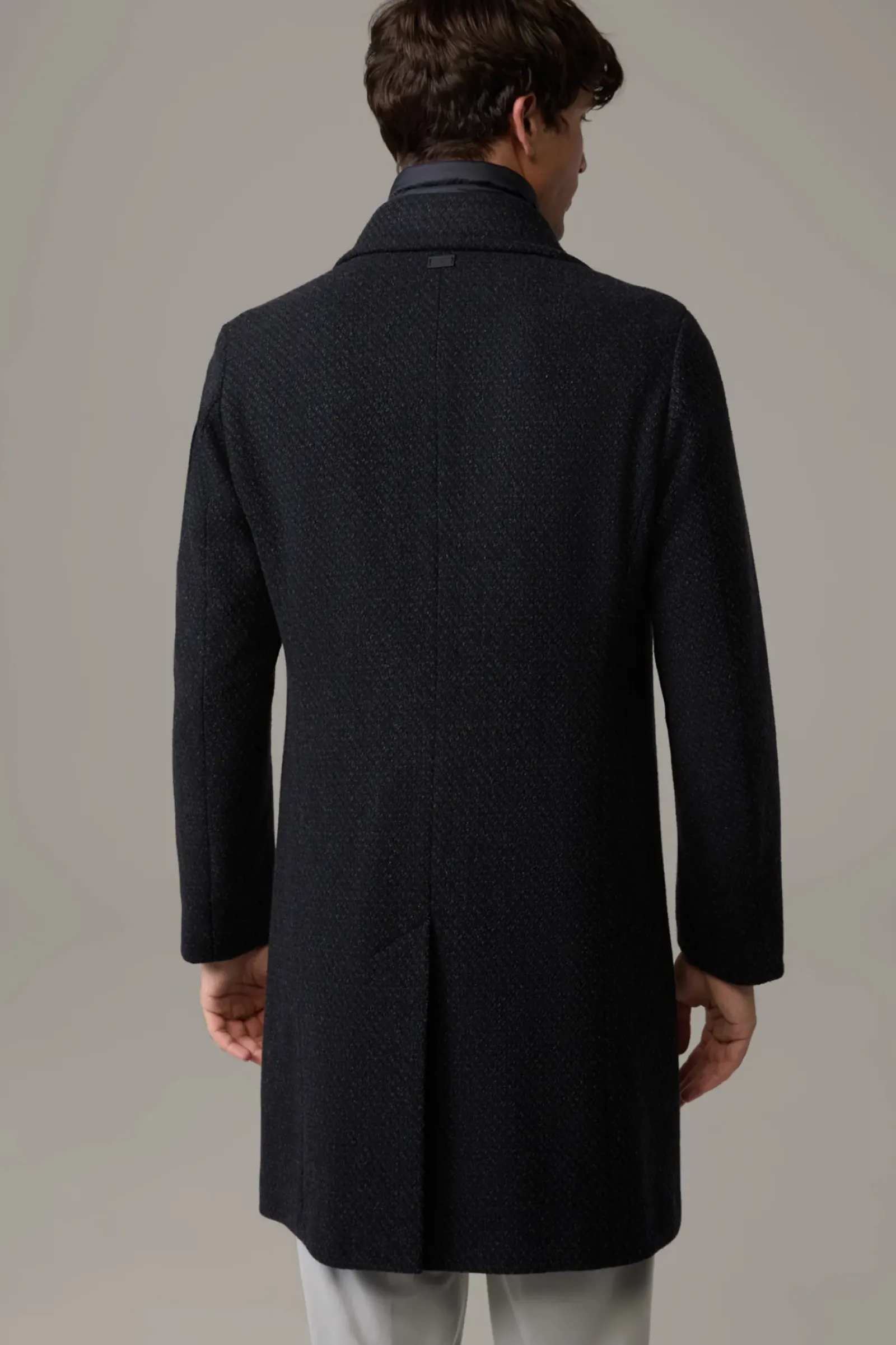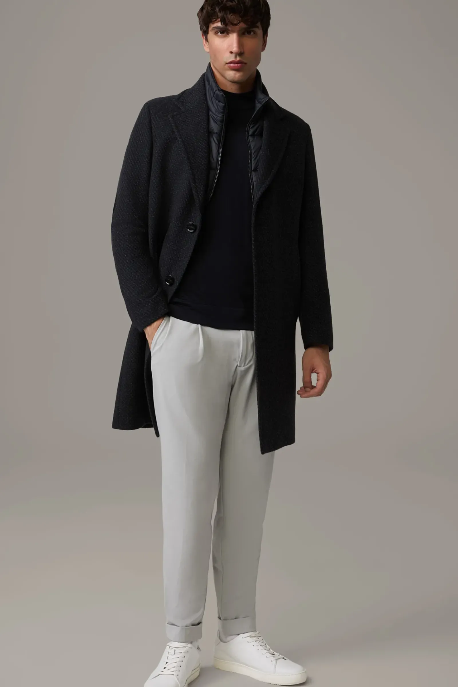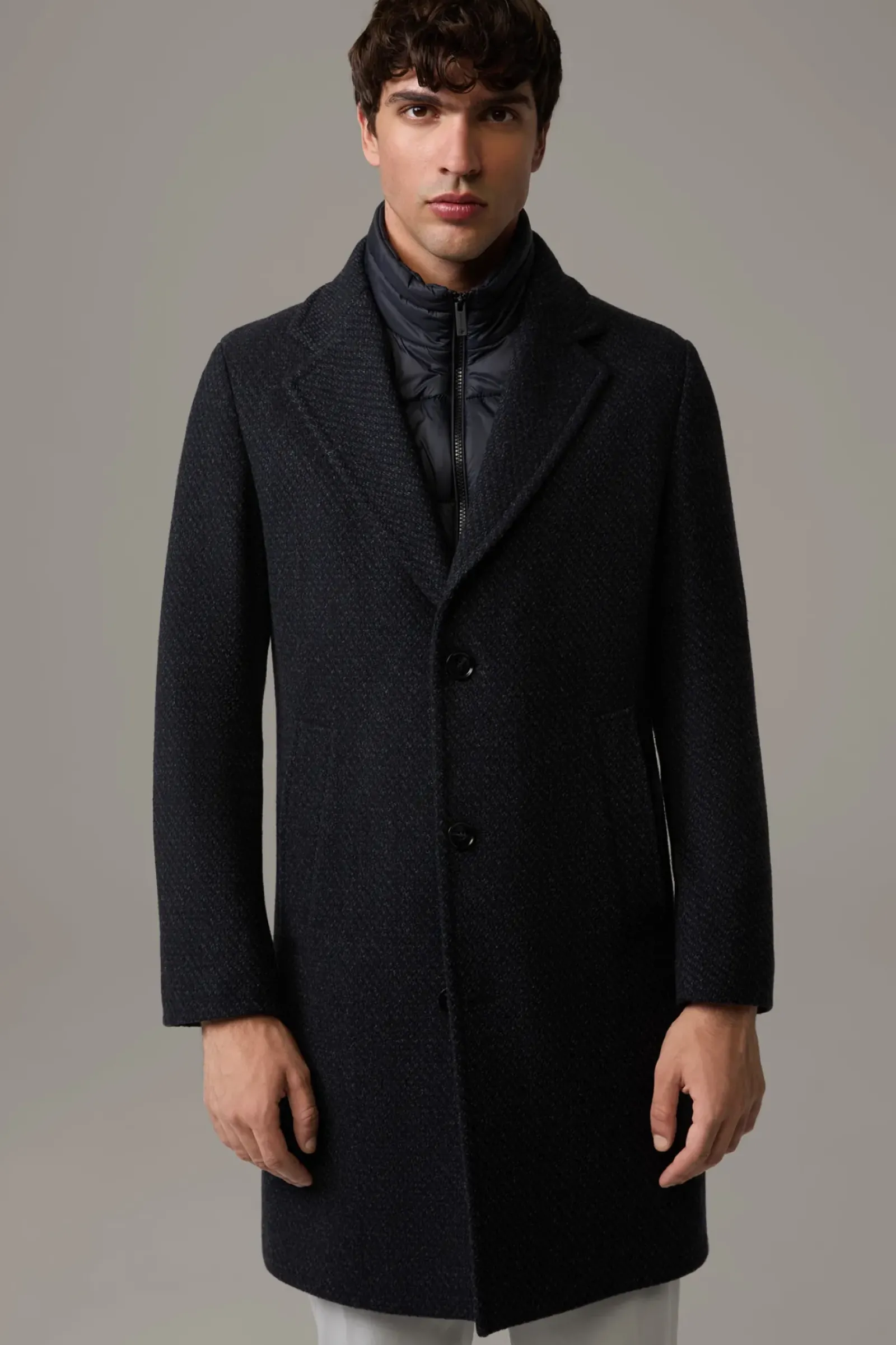 Mit abzippbarem Stepp-Inlay begeistert der Mantel Baronz im italienischen Wollmix. Leistentaschen, Reverskragen und Melange-Knöpfe ergänzen das Design.