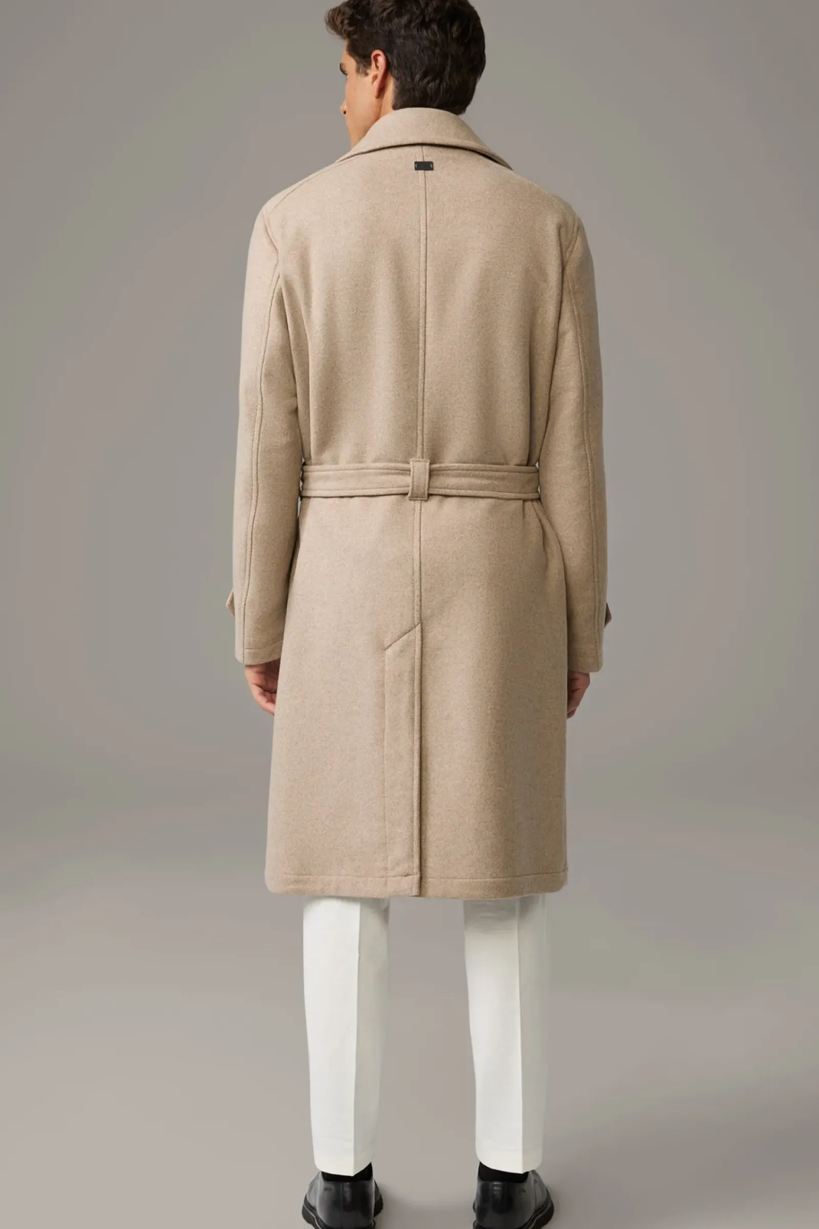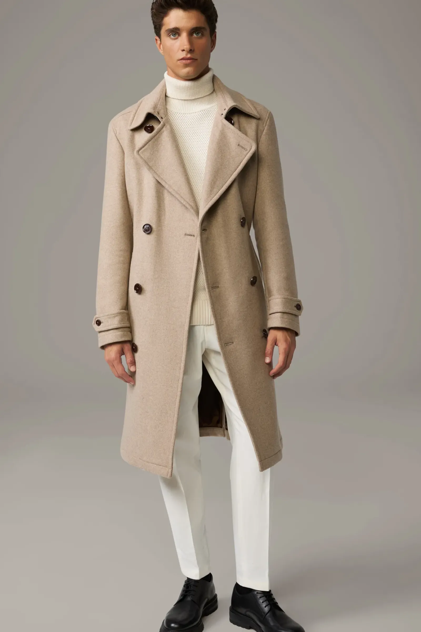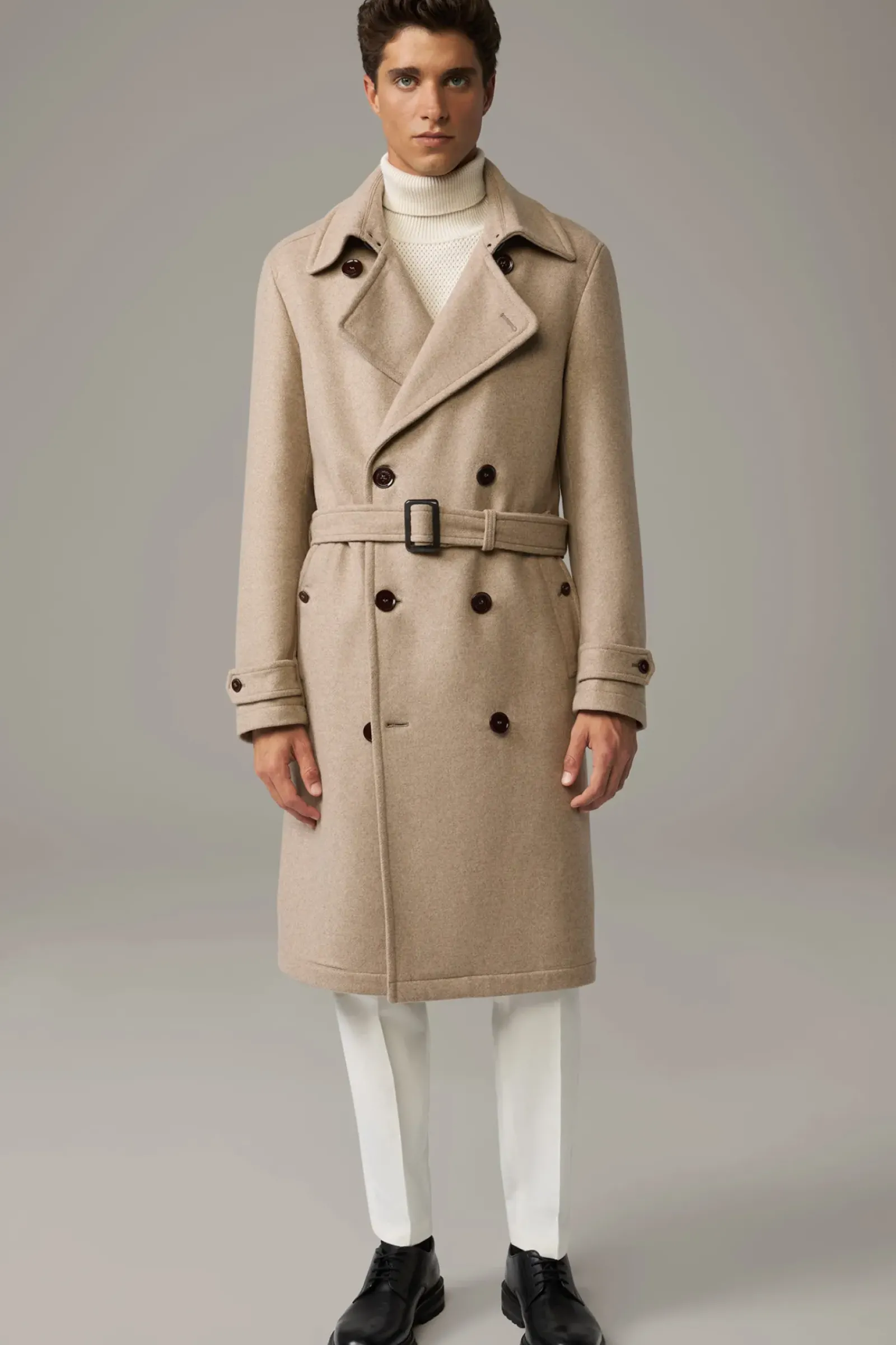Smarter Look: The Trench Coat im Doppelreiher-Design mit modernem Reverskragen, Riegeldetails und tonigem Gürtel. Aus Wollmix.