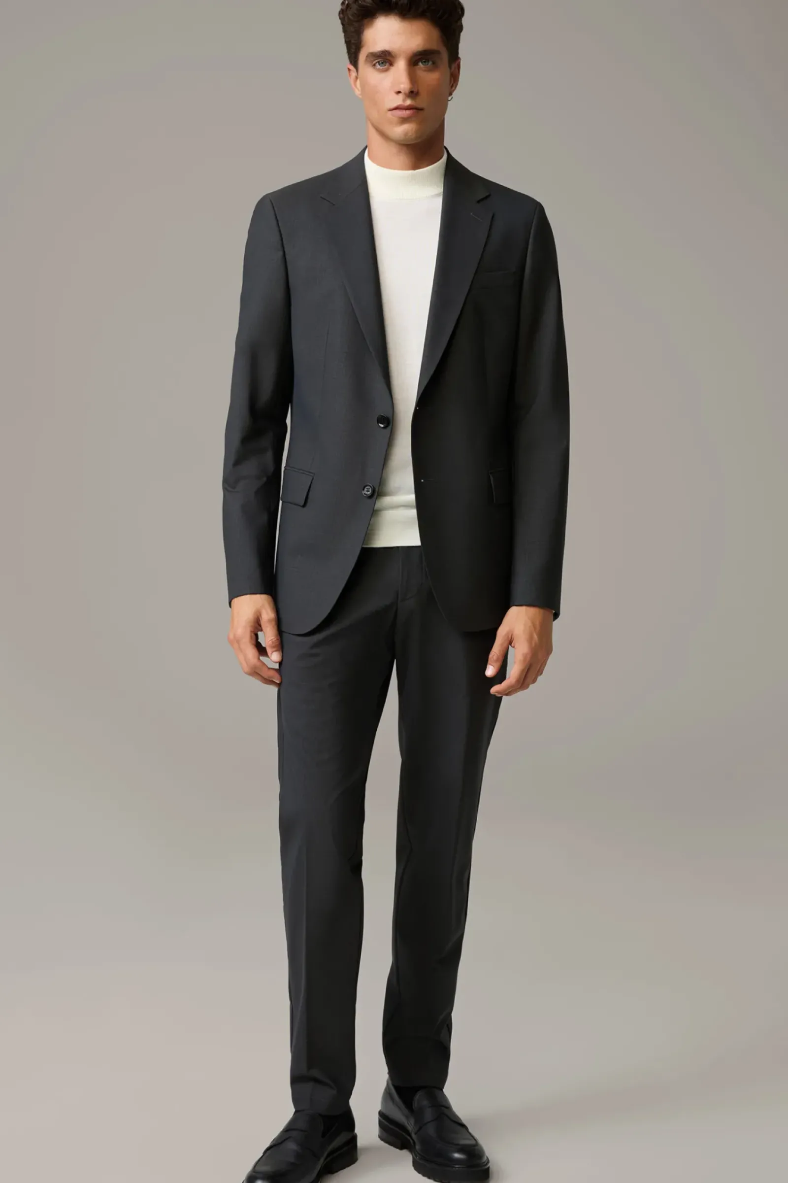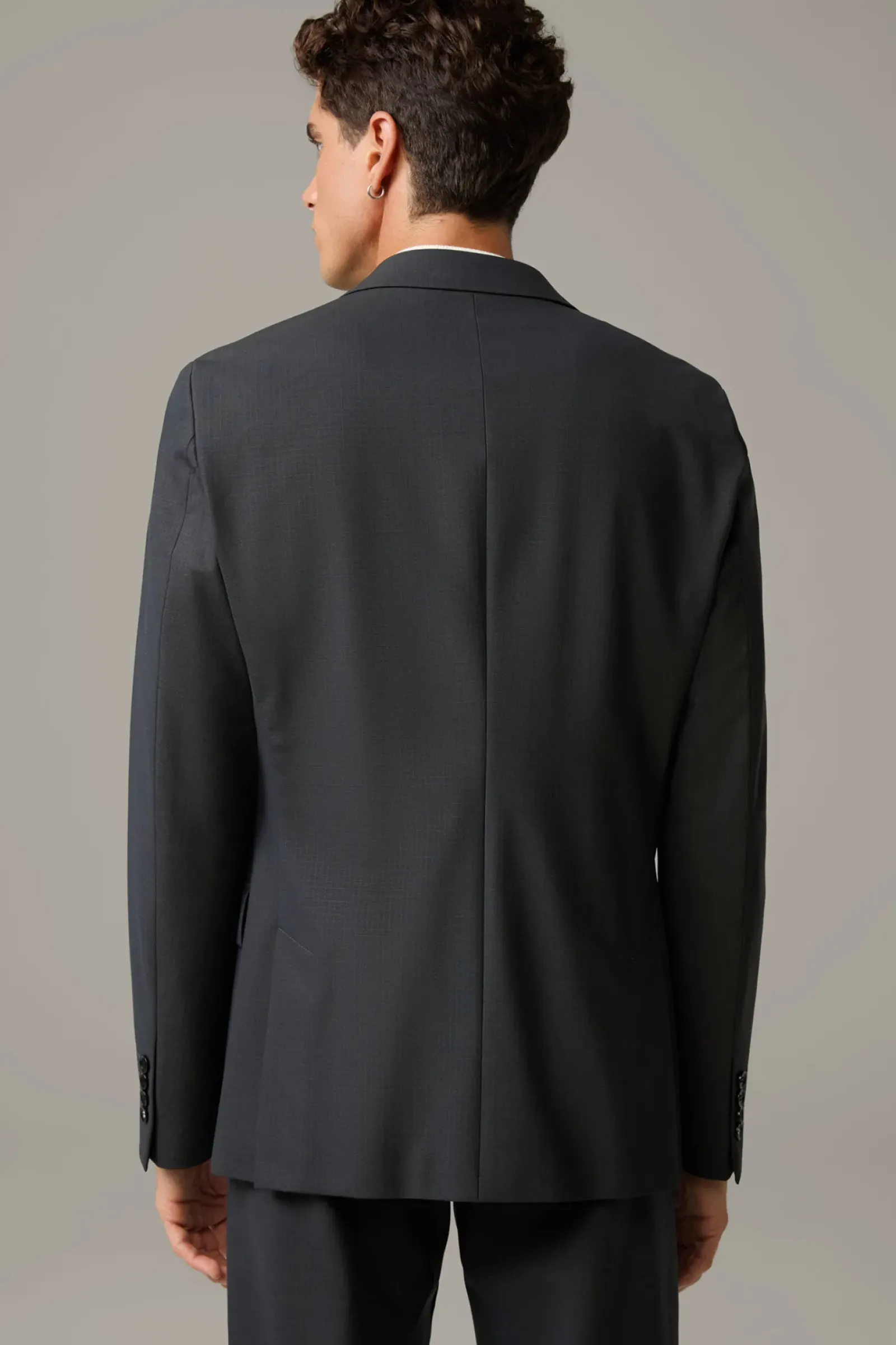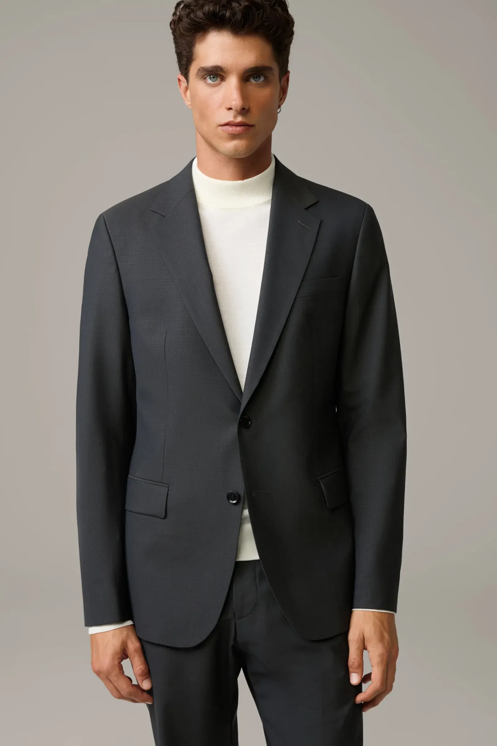 Aus komfortablem Schurwoll-Stretch in extraschmaler Silhouette: das Sakko Caidan im Einreiher-Design mit paspelierten Pattentaschen und Bewegungsschlitzen. Fließendes Futter mit AMF-Stitching.