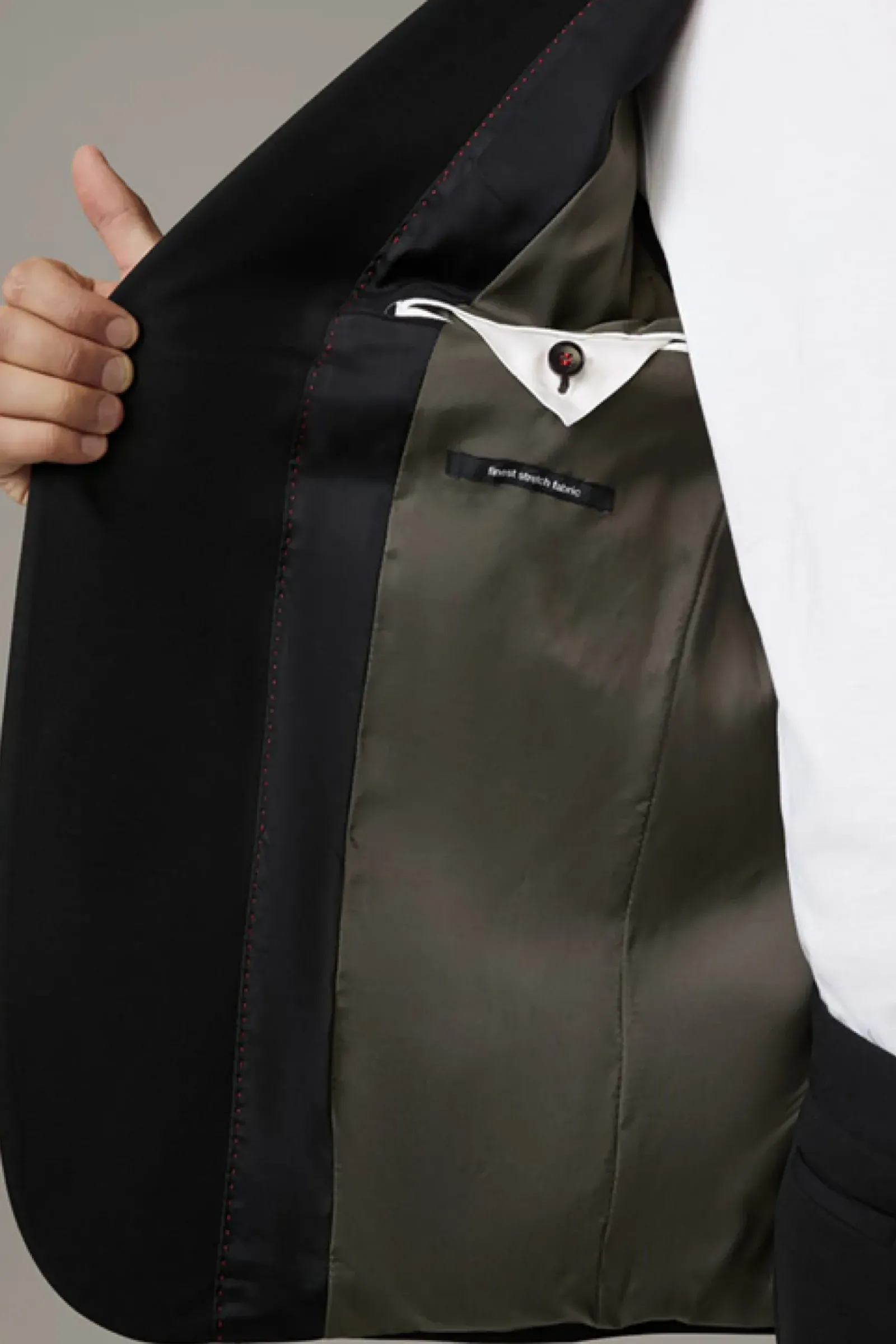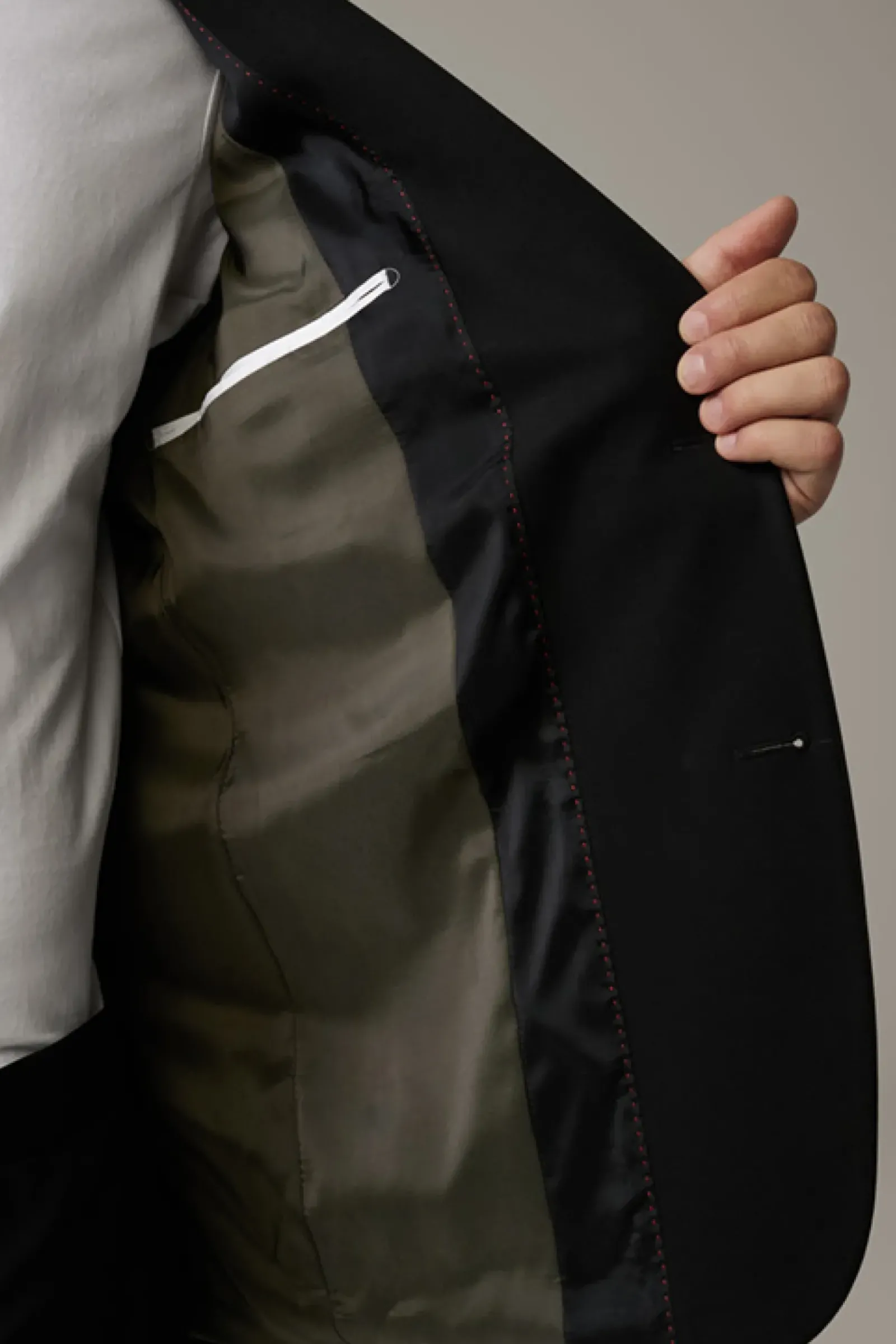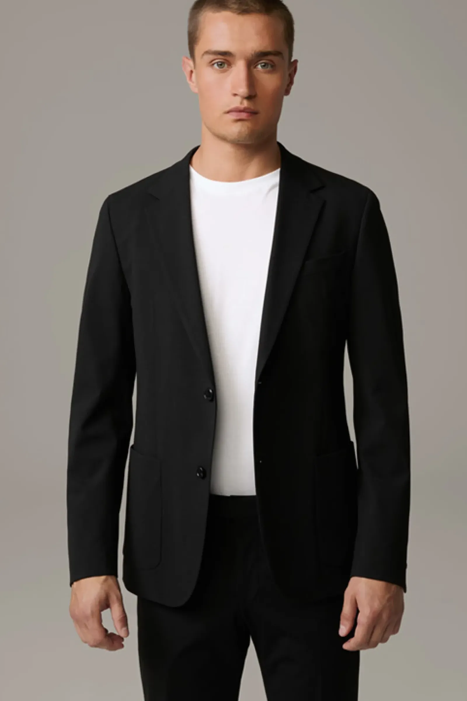Die luxuriöse Jersey-Stretch-Qualität zeichnet das Sakko Arndt der Serie Flex Cross als variables Dresscode-Essential aus, akzentuiert mit modernen Eingrifftaschen – passend zur schmalenHose Saturn.