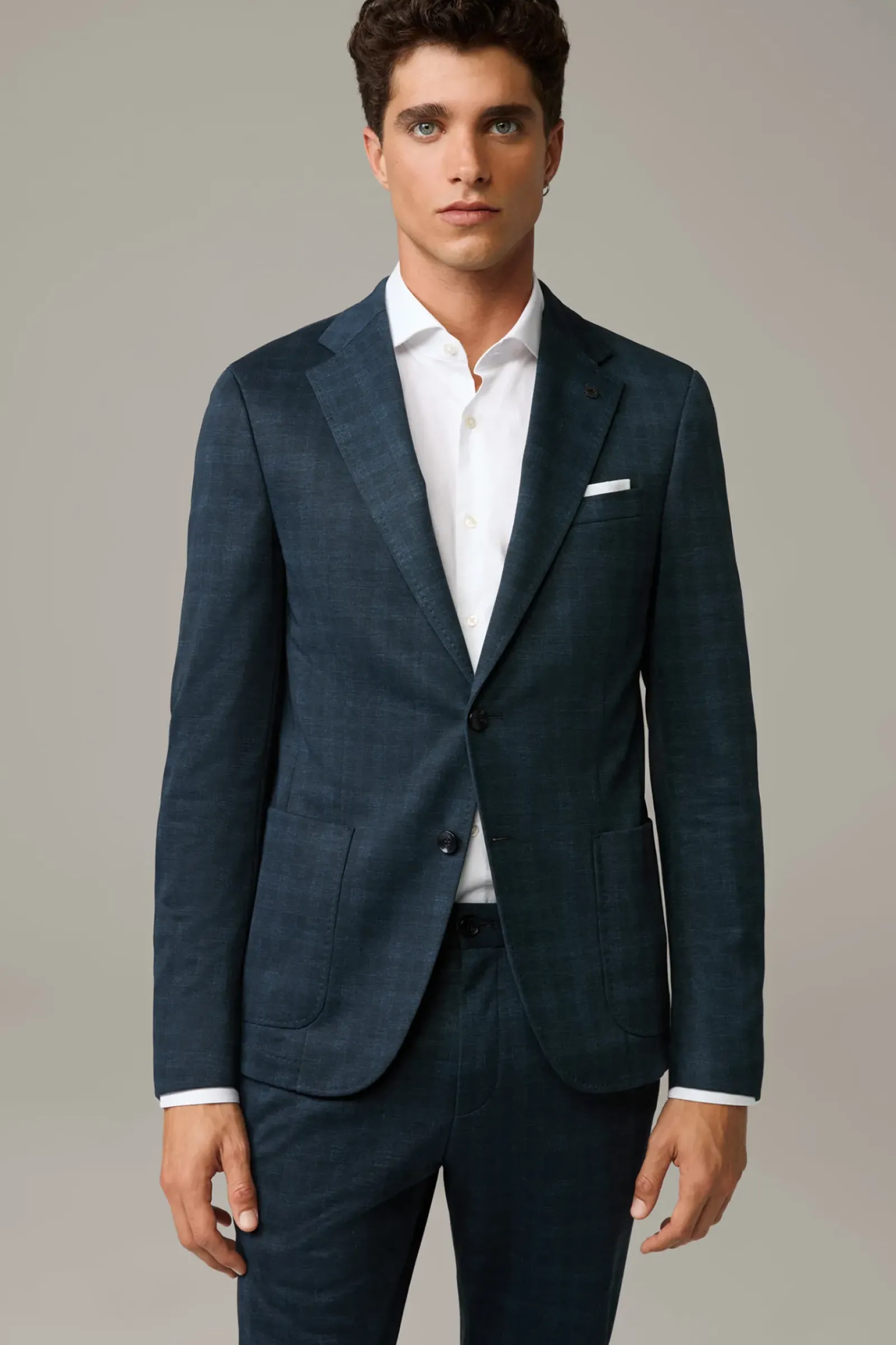 Lässig und smart zugleich: das Sakko Acon aus Leinen-Stretch. Den modernen Look ergänzen der Reverskragen, aufgesetzte Taschen und Bewegungsschlitze im Duo-Design.