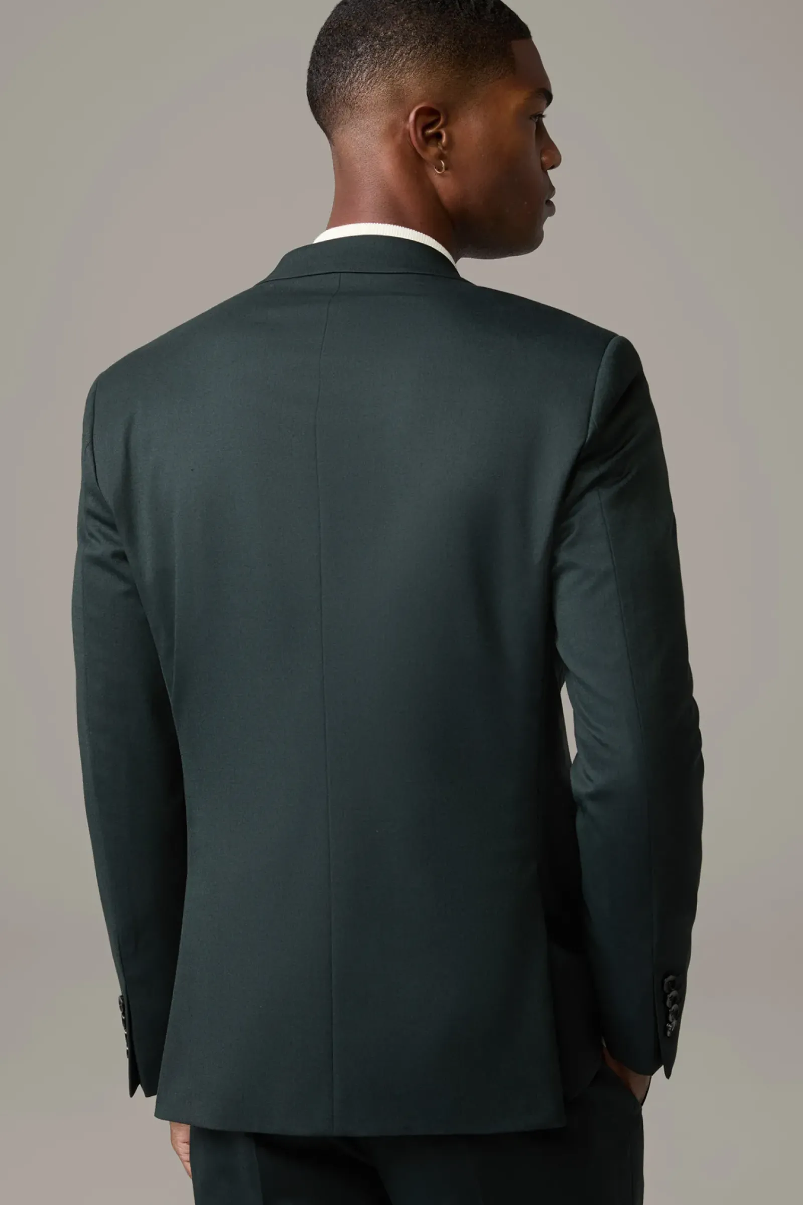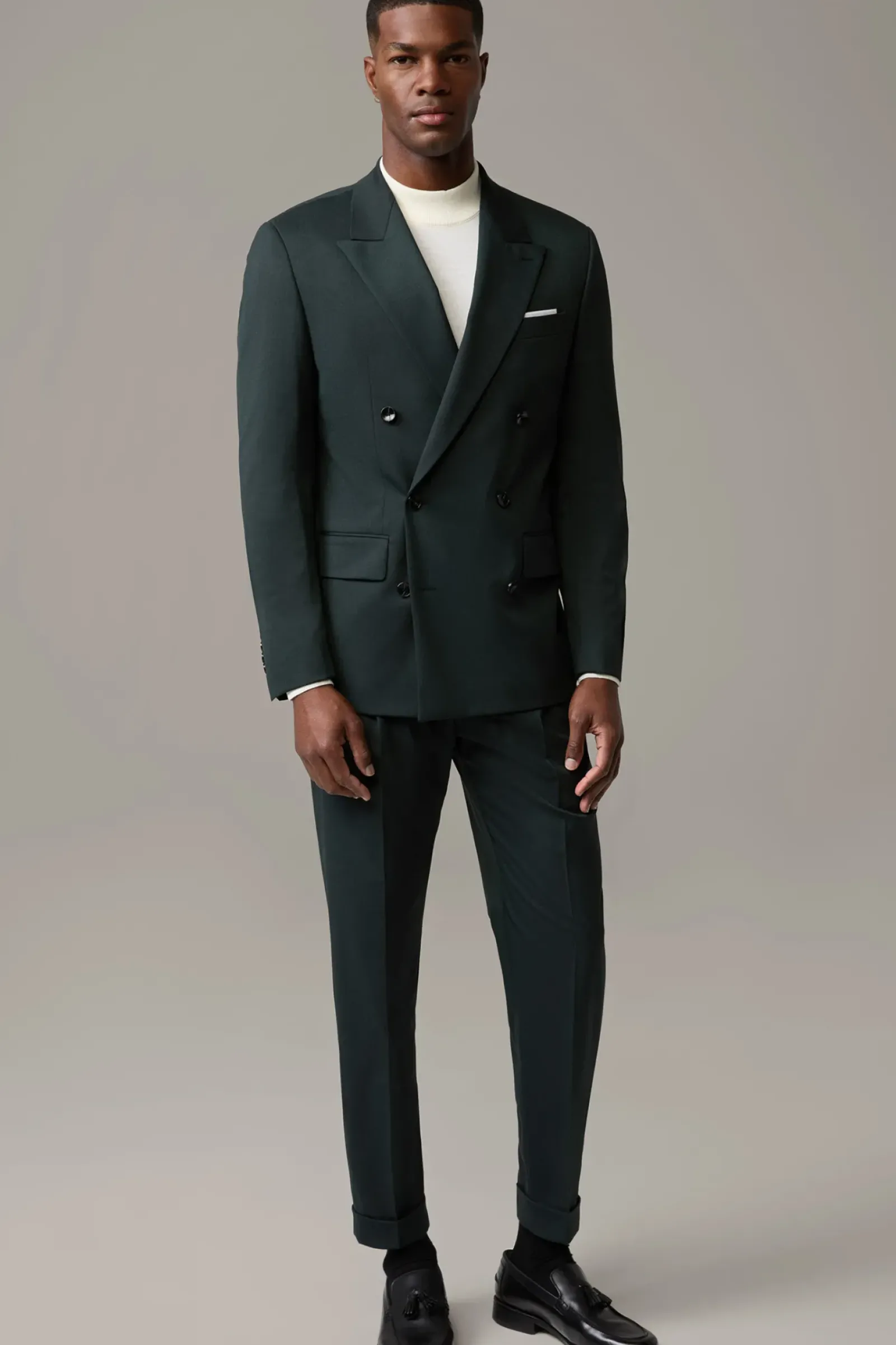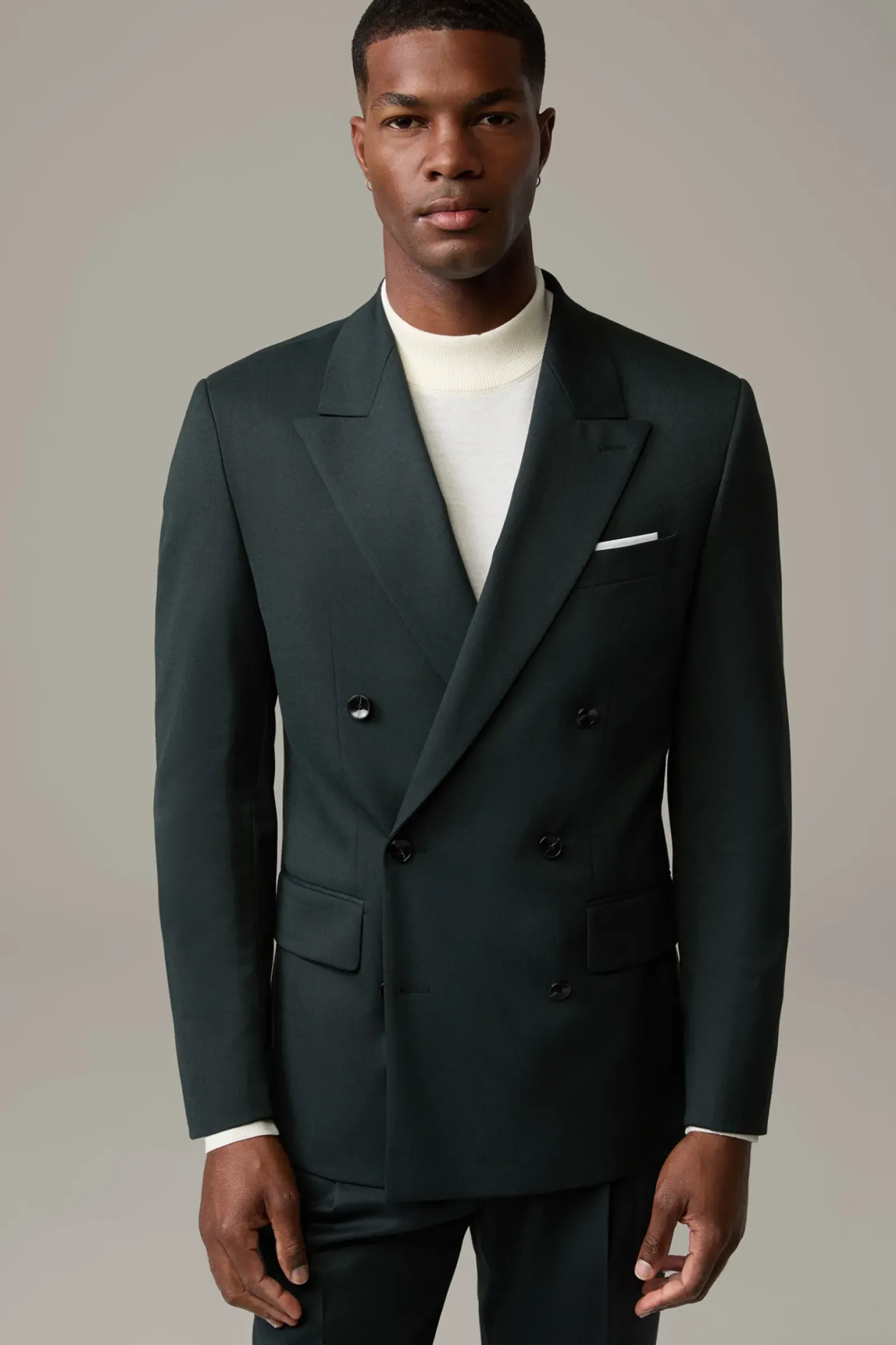 Edler Style für feine Anlässe: der Doppelreiher mit steigendem Revers, paspelierten Pattentaschen und glattem Futter. Stretchiger Wollmix.