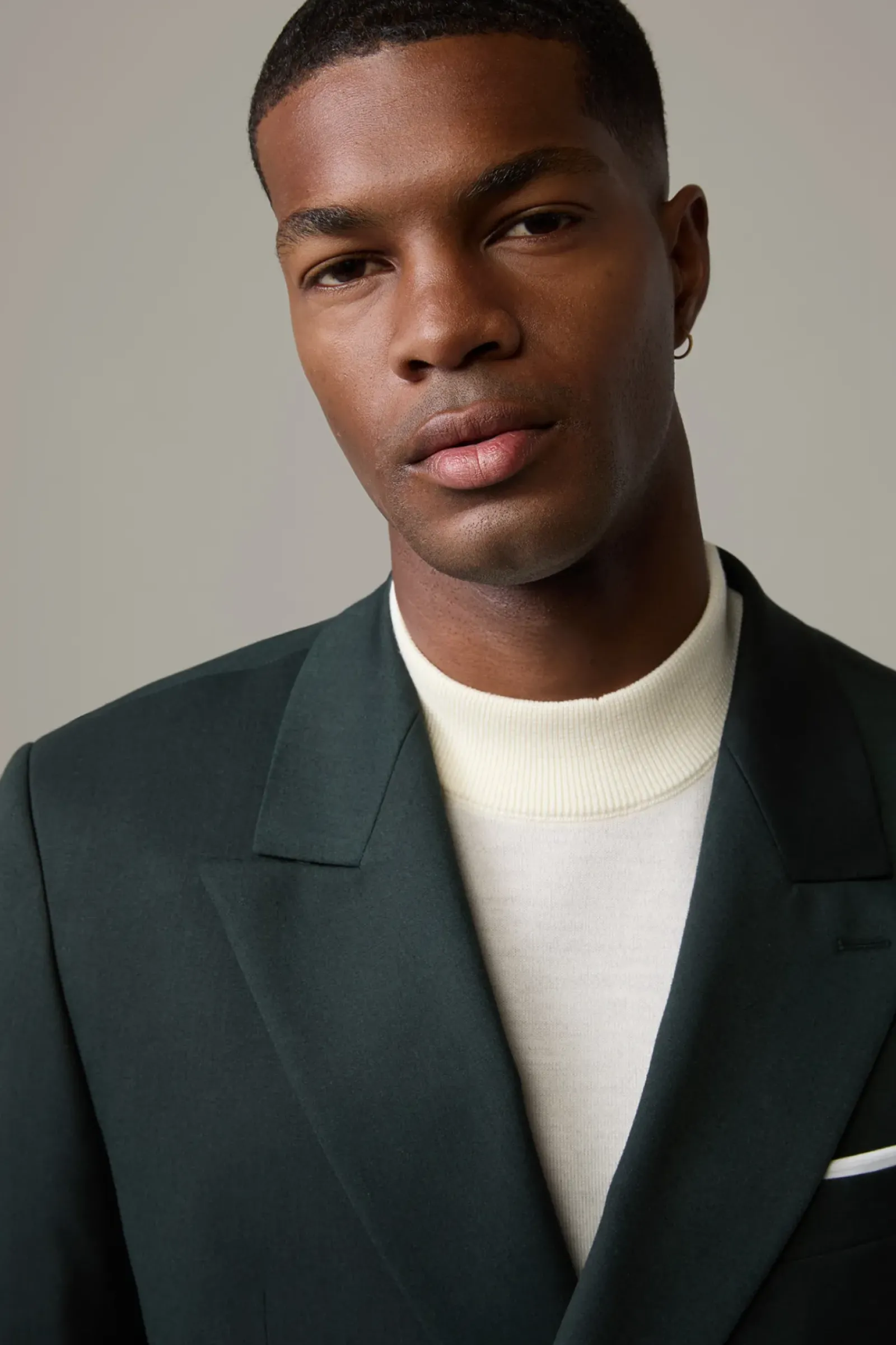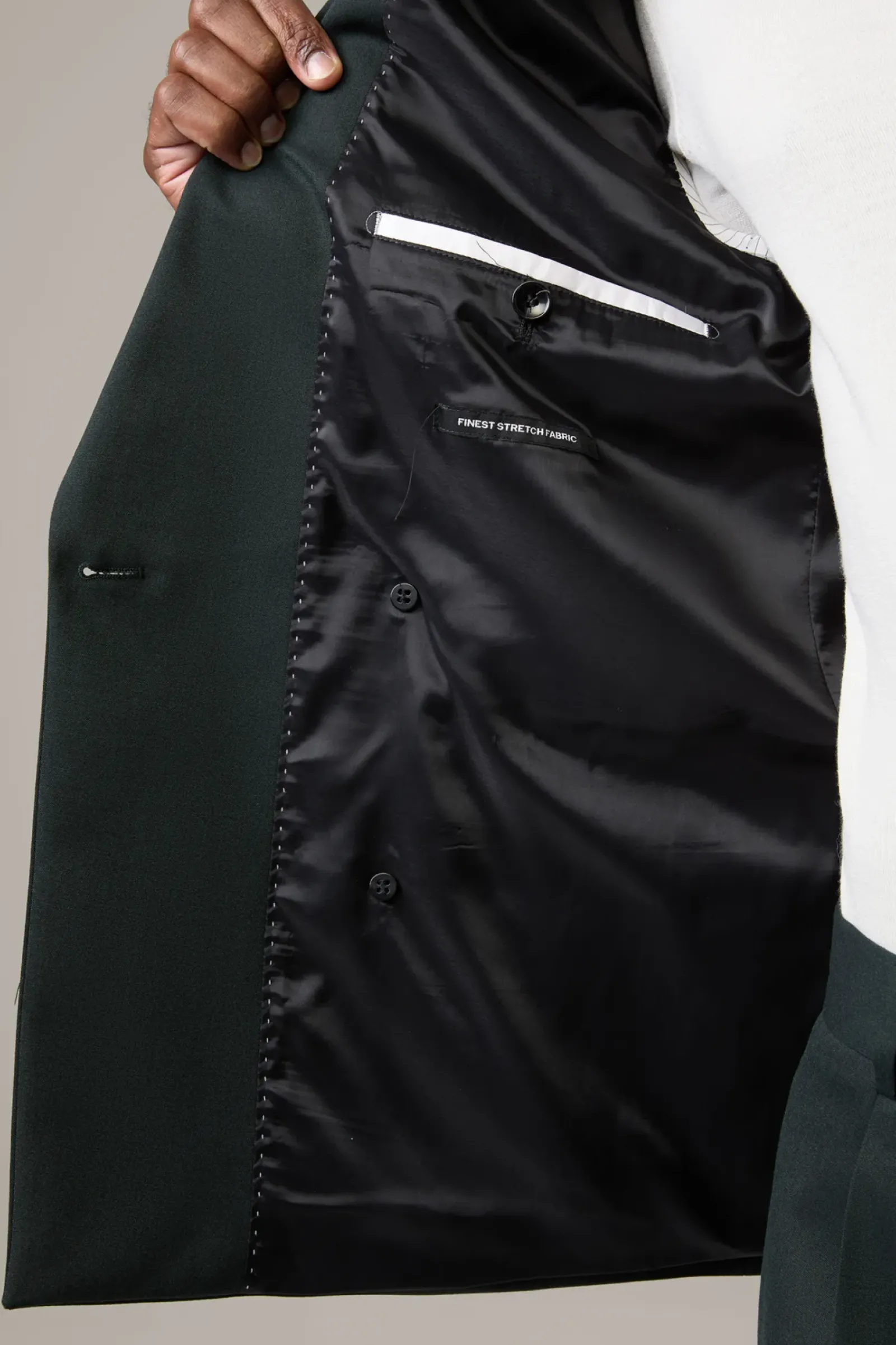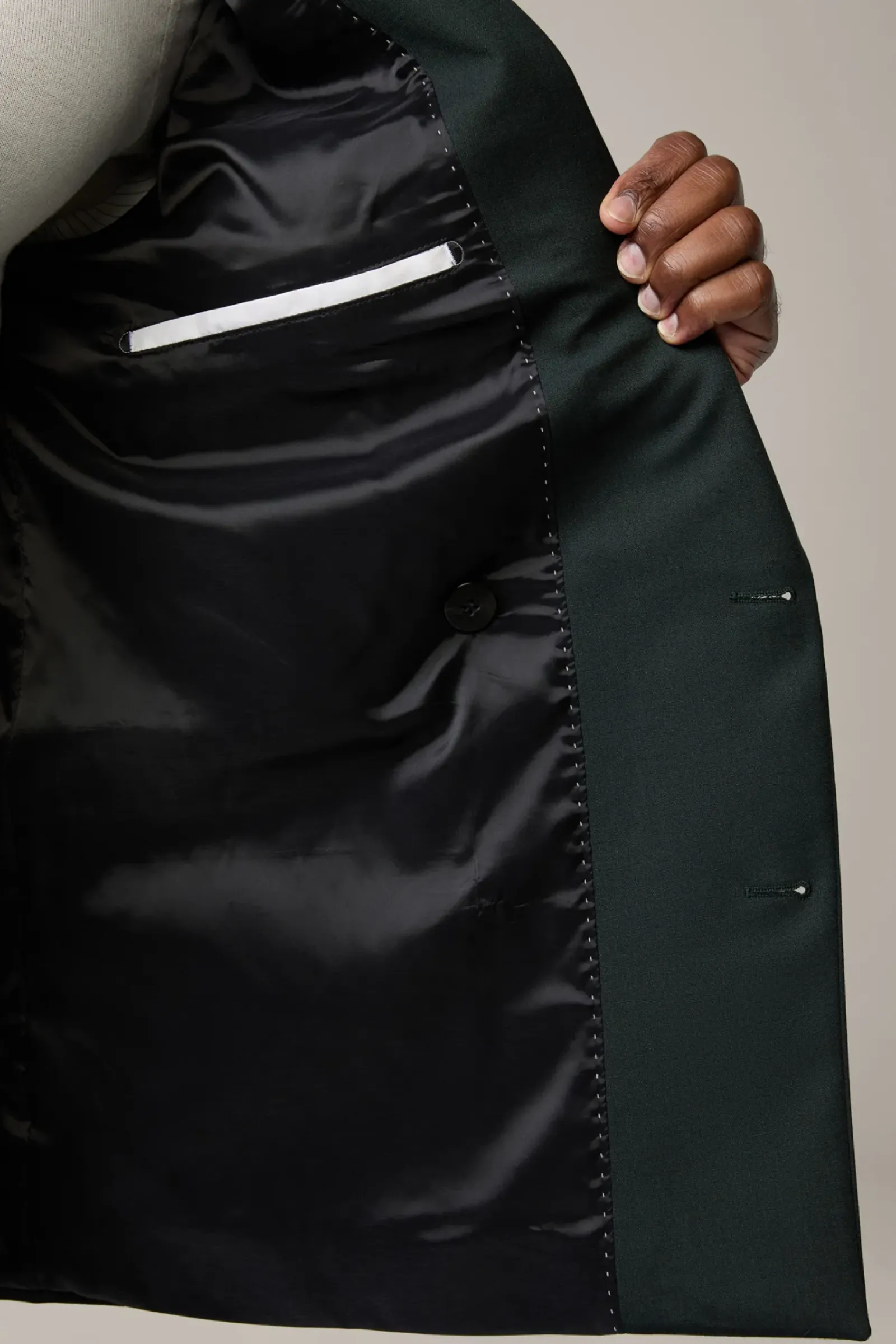 Edler Style für feine Anlässe: der Doppelreiher mit steigendem Revers, paspelierten Pattentaschen und glattem Futter. Stretchiger Wollmix.