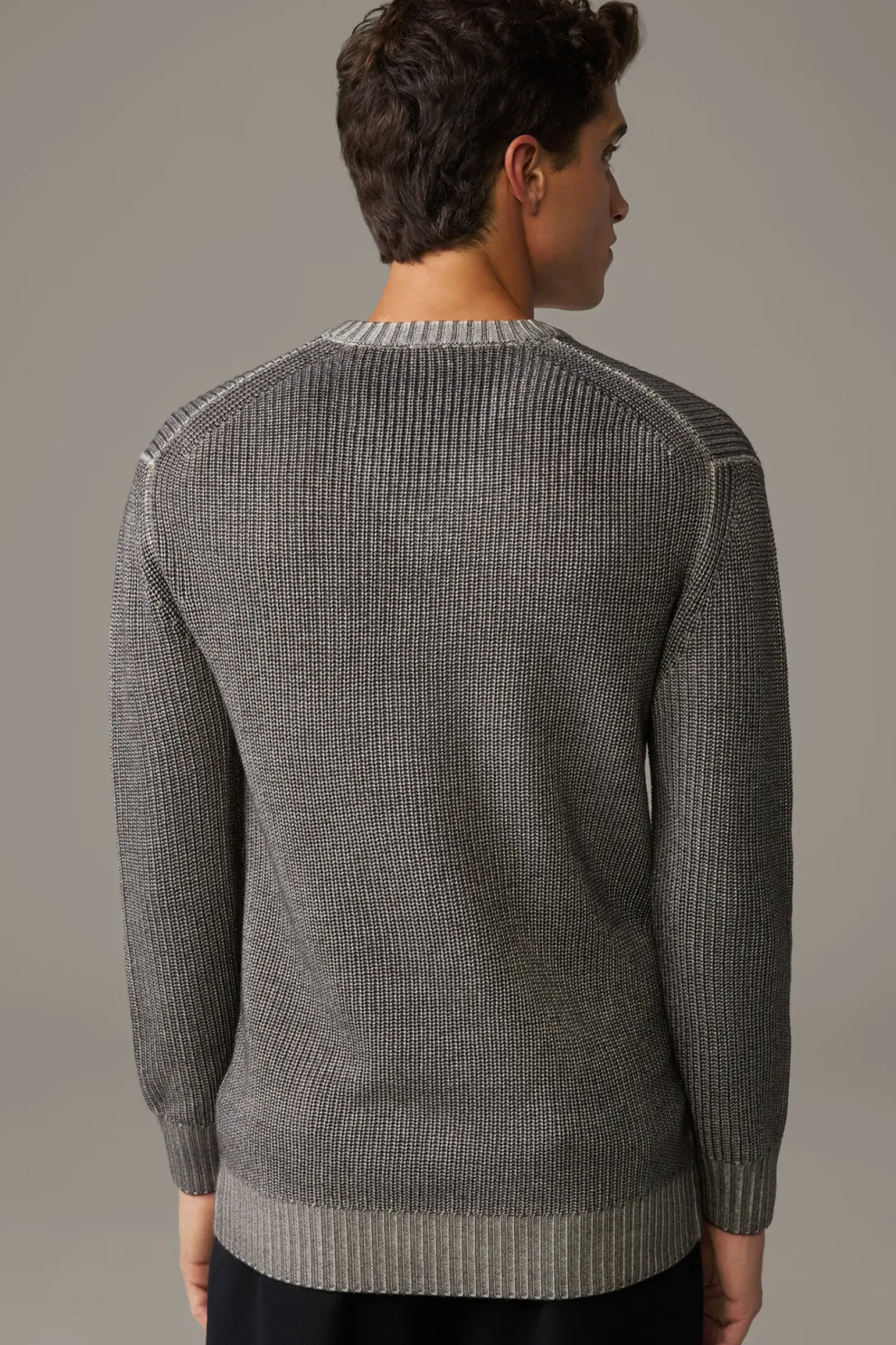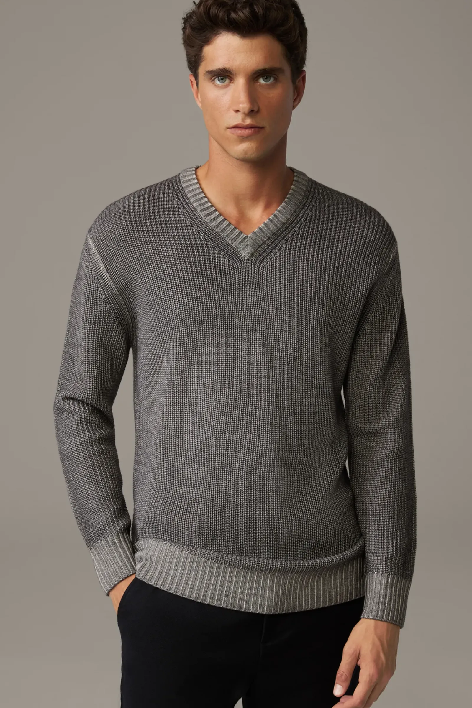In Rippe gestrickt und aus reiner Schurwolle präsentiert sich der Pullover Leon als komfortables Piece – ergänzt durch V-Ausschnitt und Rippbündchen.