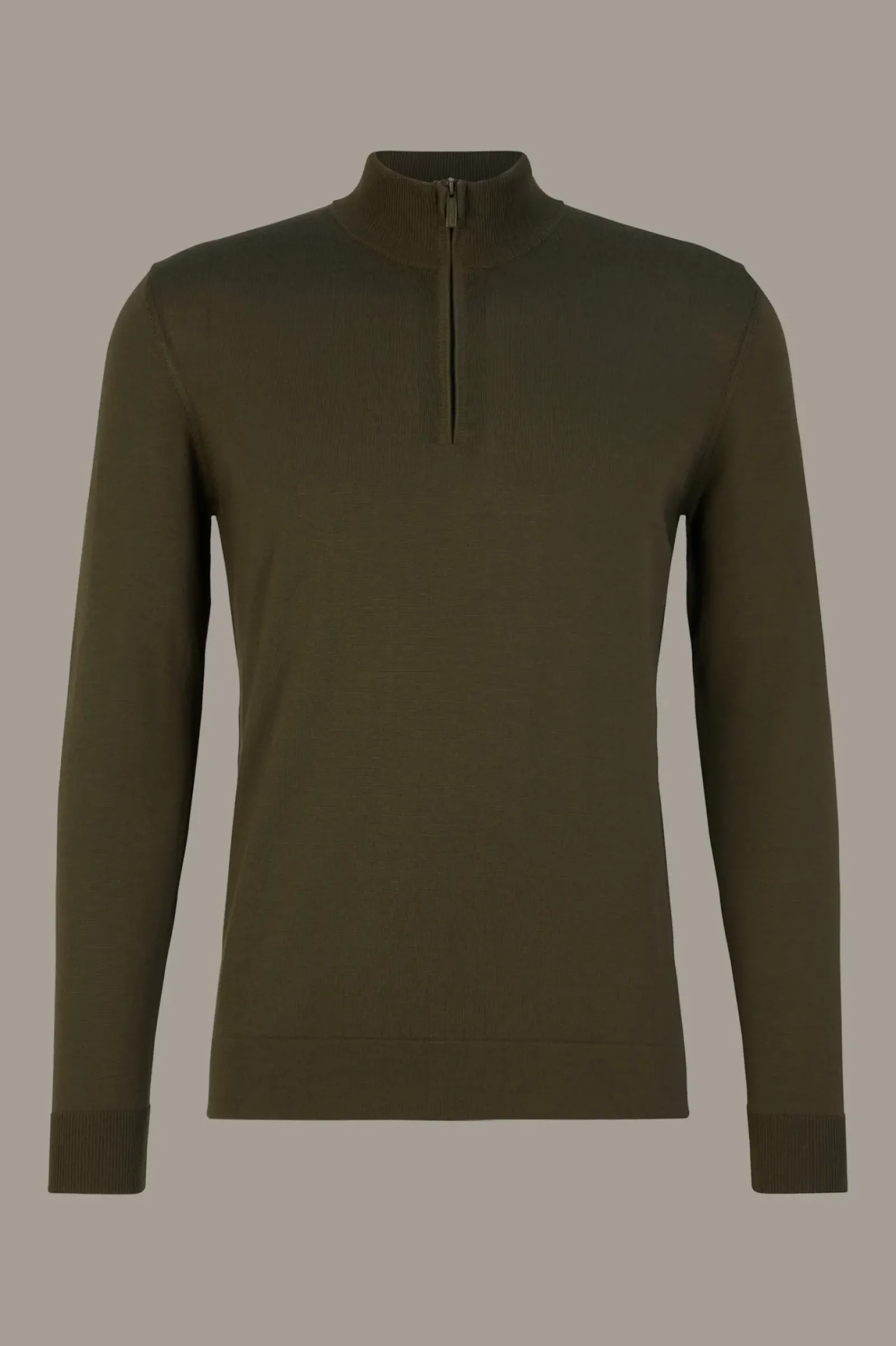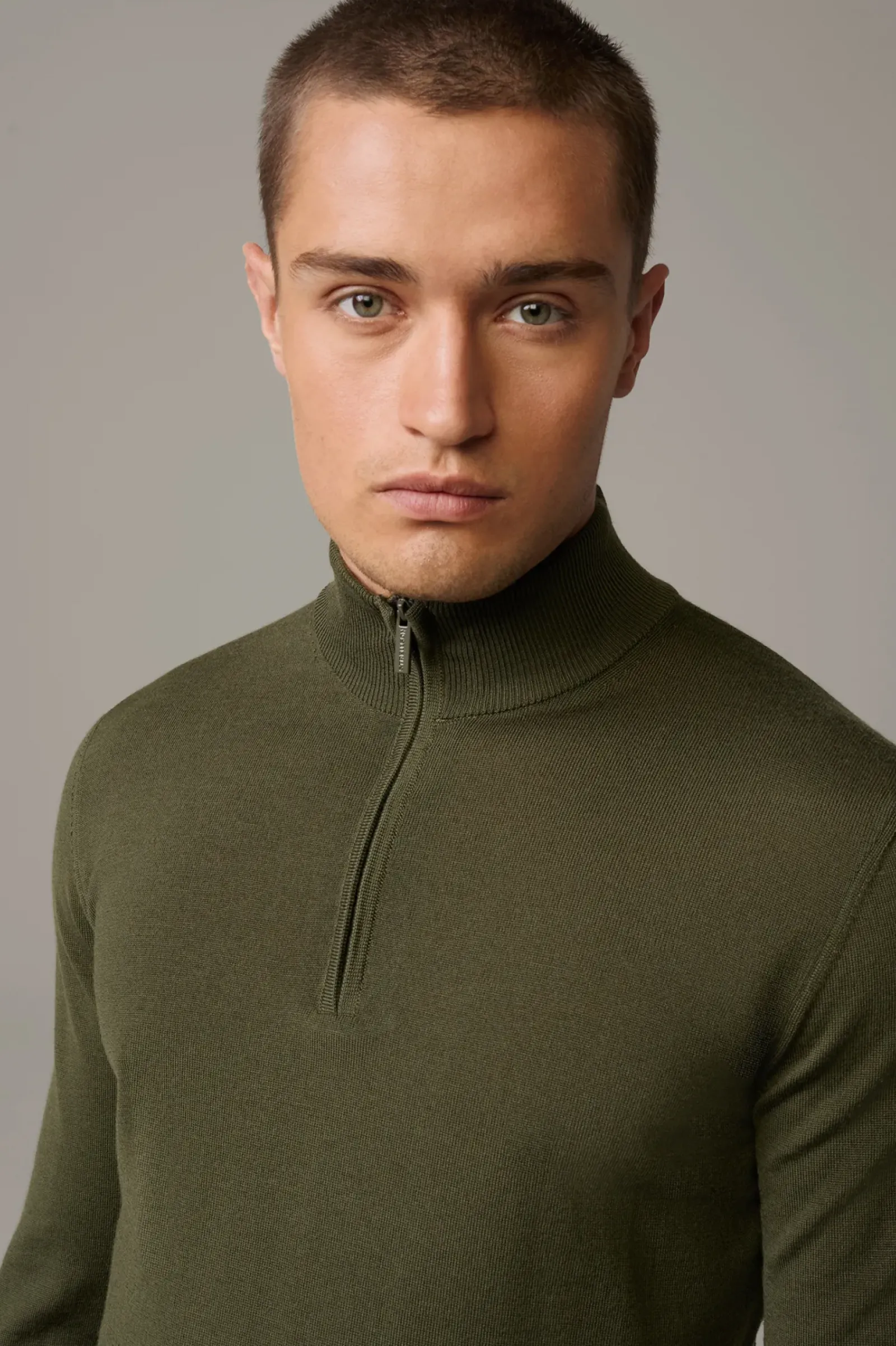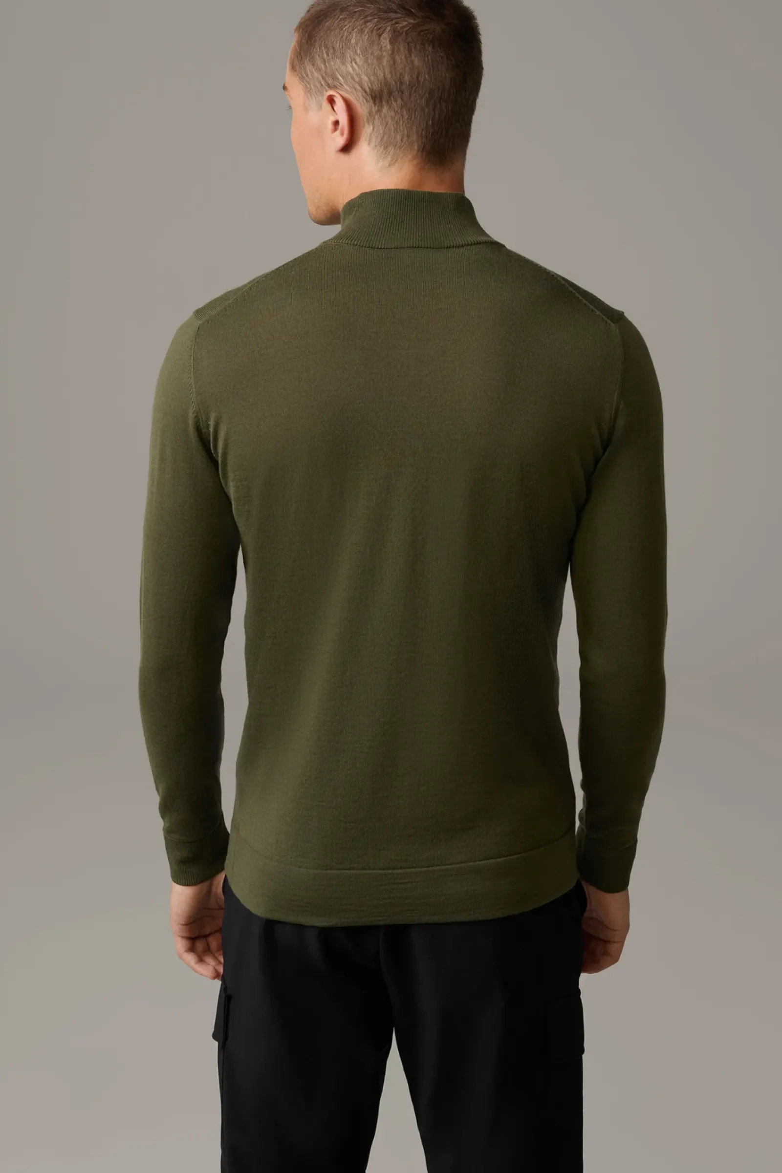 Komfortabler Klassiker: der Pullover Marek mit Troyerkragen. Rippbündchen und Ziernähte ergänzen das Design. Aus reiner Schurwolle.