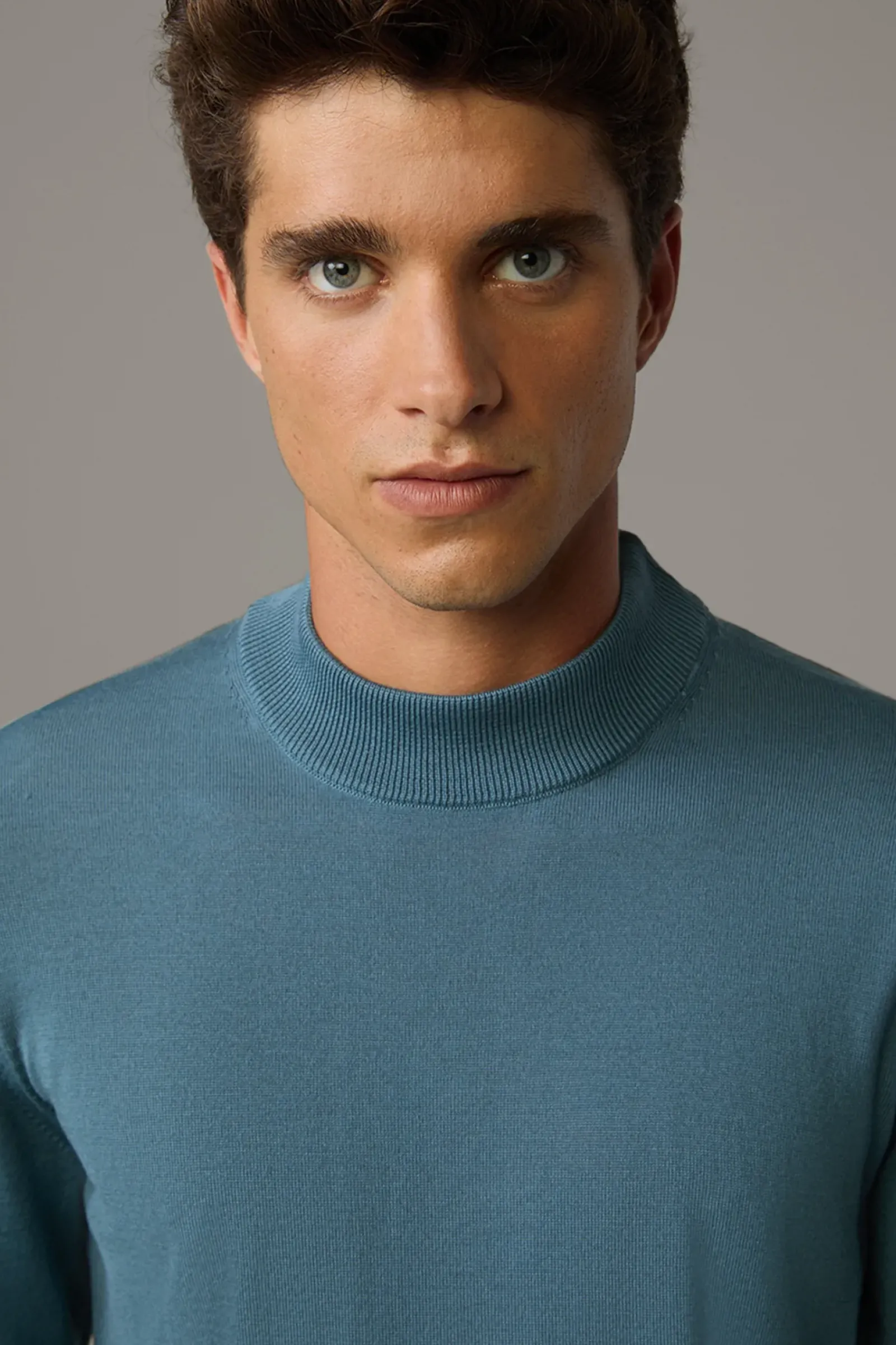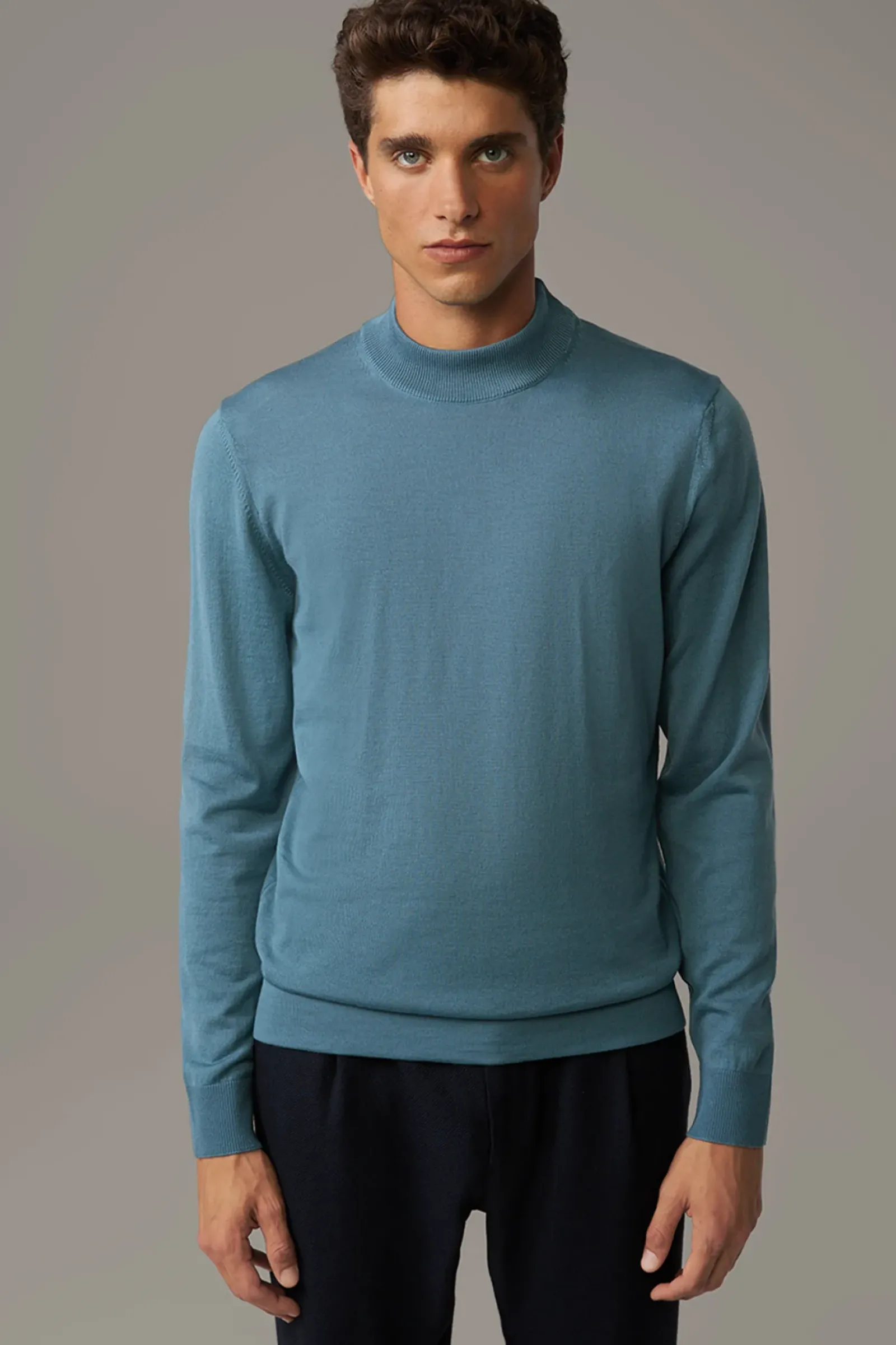 Stilvoller Allrounder: der Pullover Marek mit Stehkragen und Rippbündchen. Weiche Schurwoll-Qualität mit feinen Ziernähten.