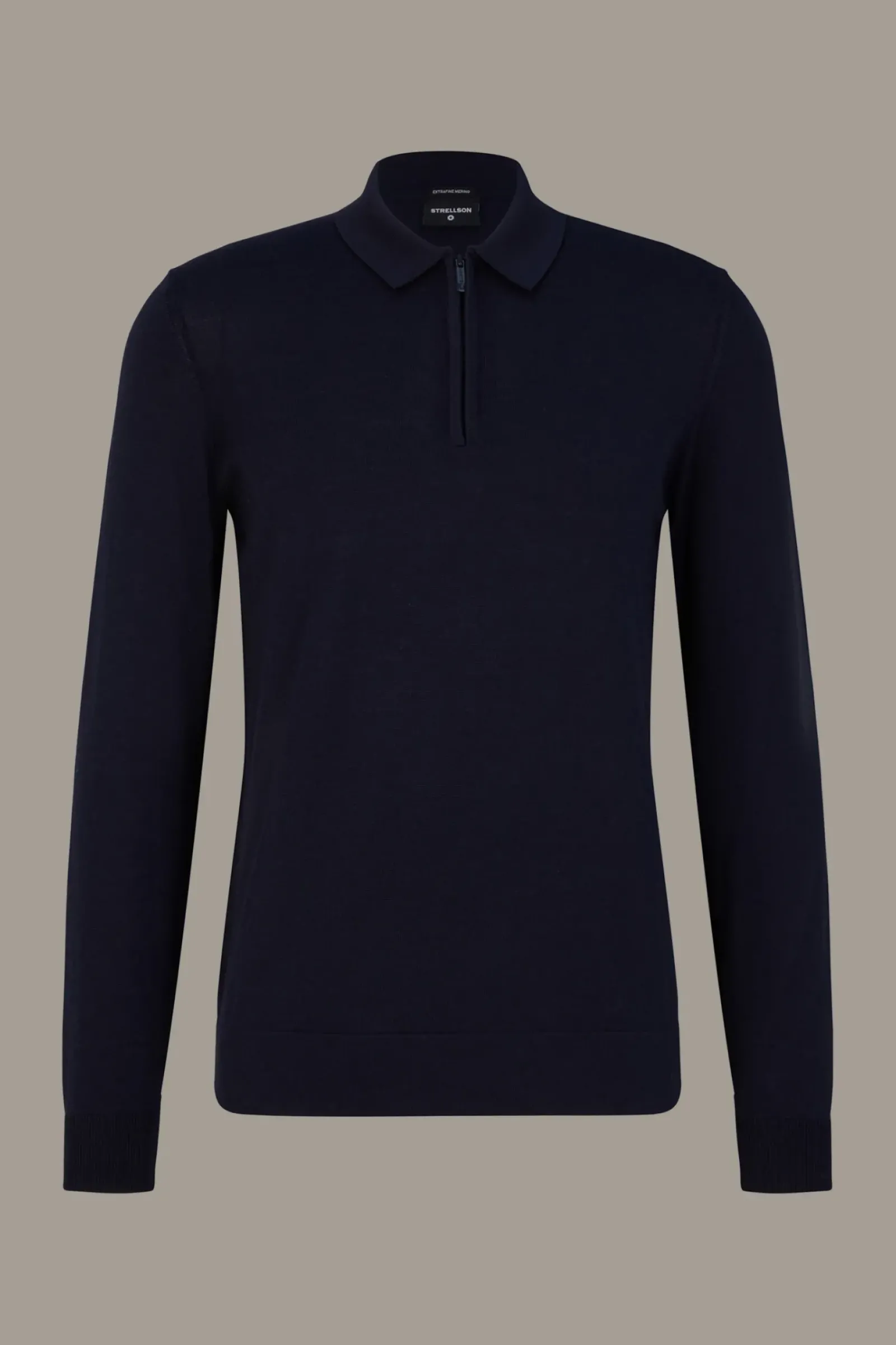 Überzeugt als komfortables Basic-Piece: der Pullover Marek mit Polokragen und kurzem Logo-Zipper. Aus reiner Schurwolle.