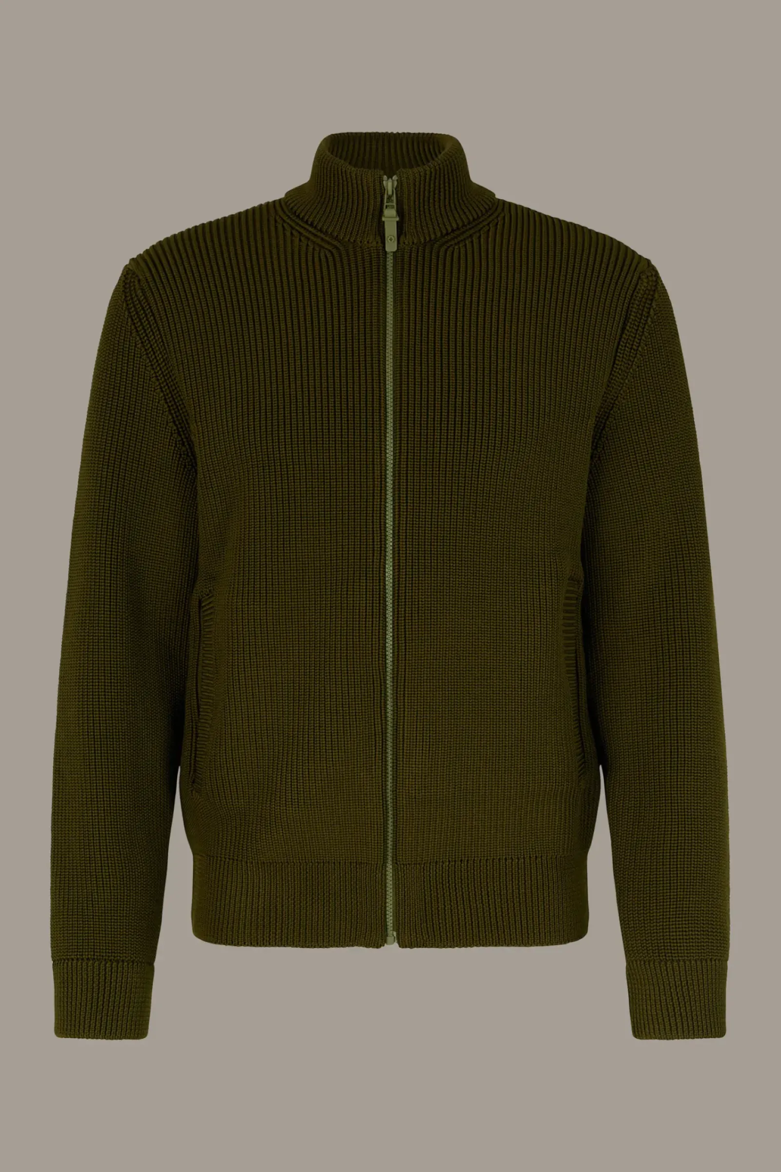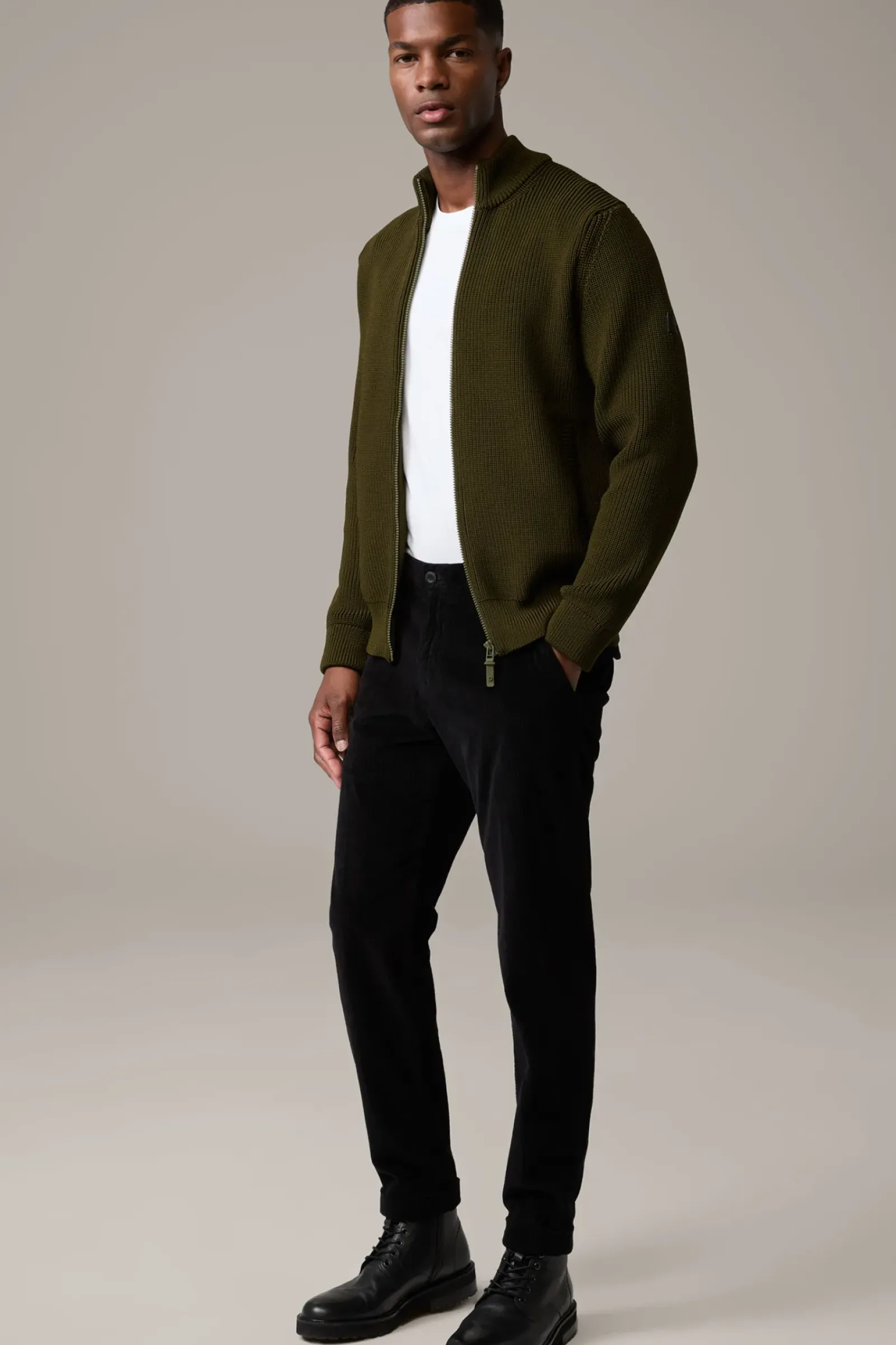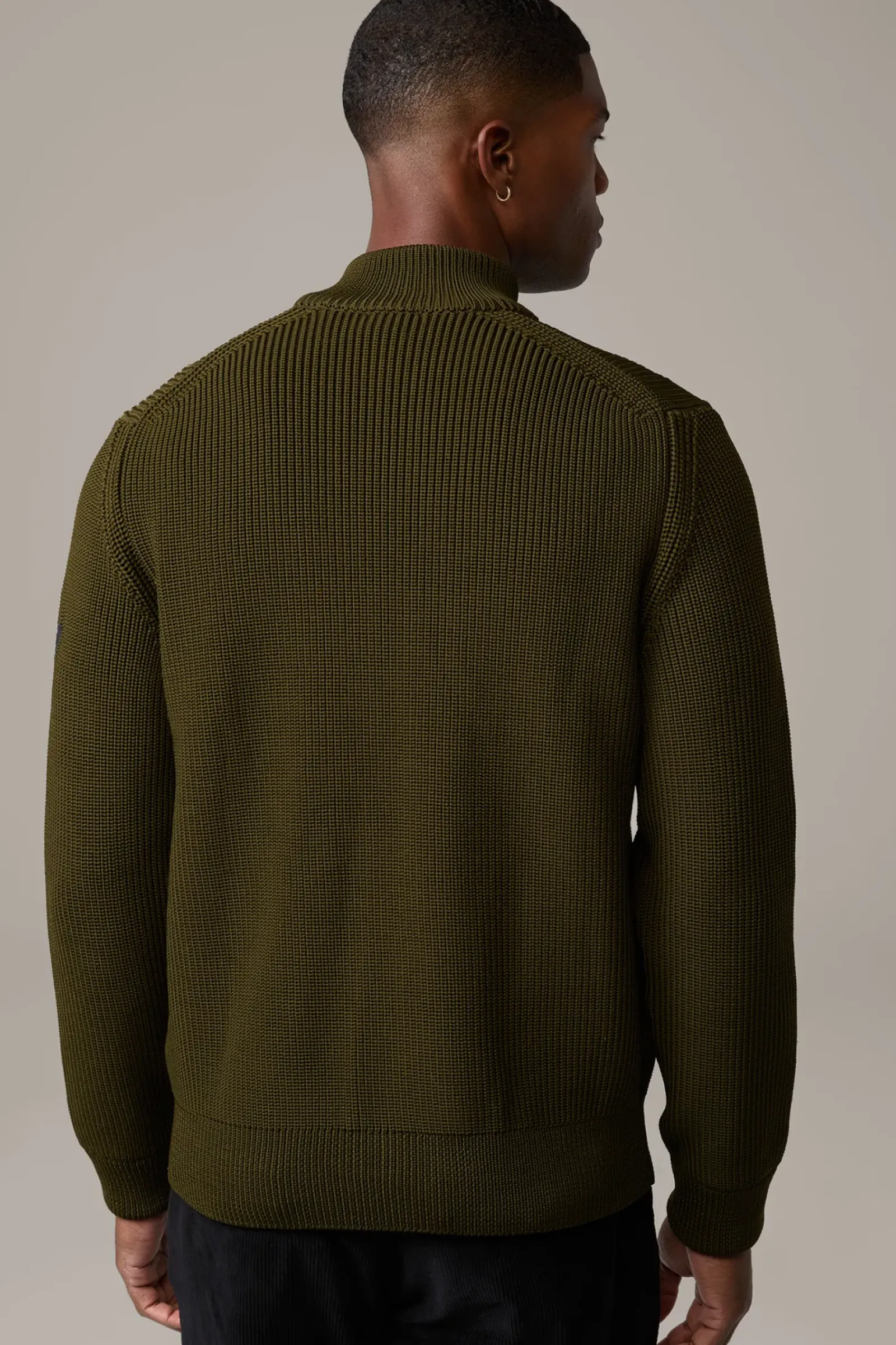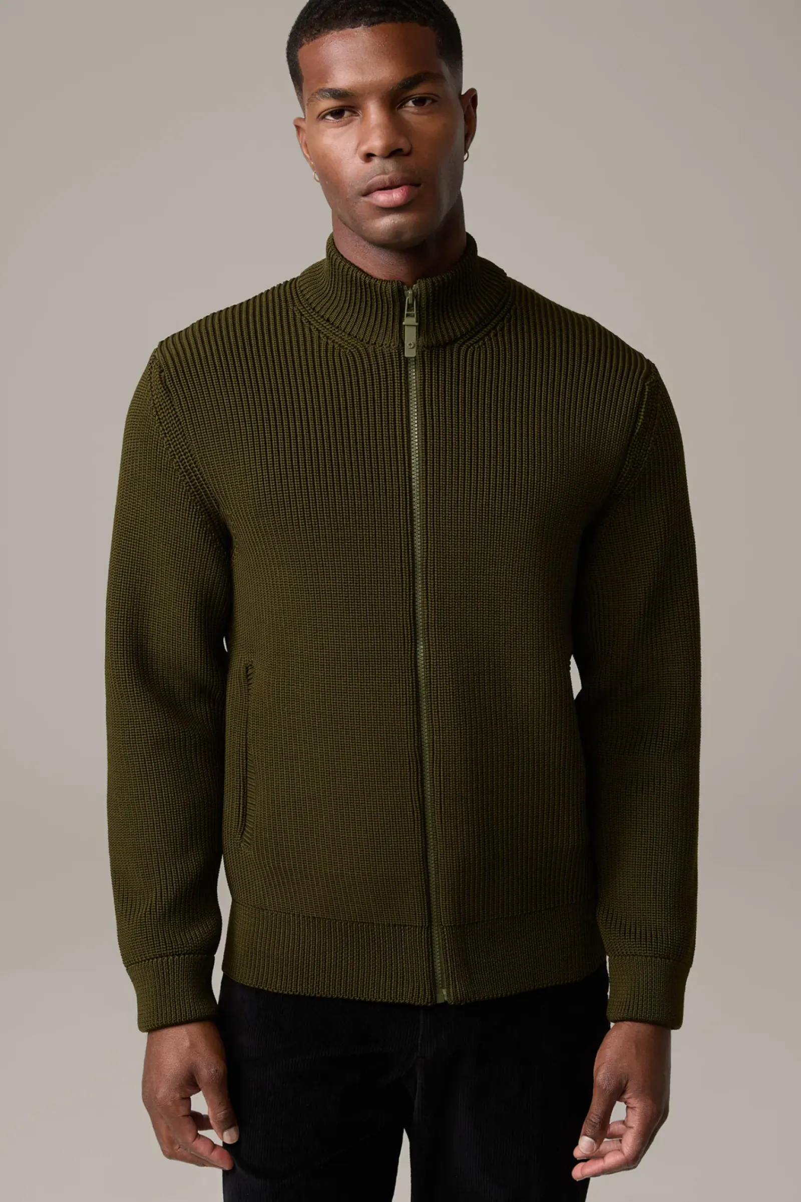 Begeistert als modernes Style-Update: die Strickjacke Victor mit geripptem Stehkragen, durchgehendem Zipper und Leistentaschen. Mit Rubber-Logo-Flag.