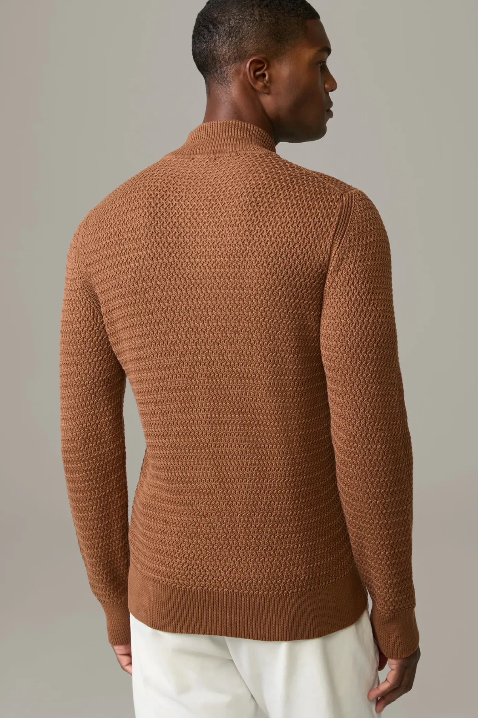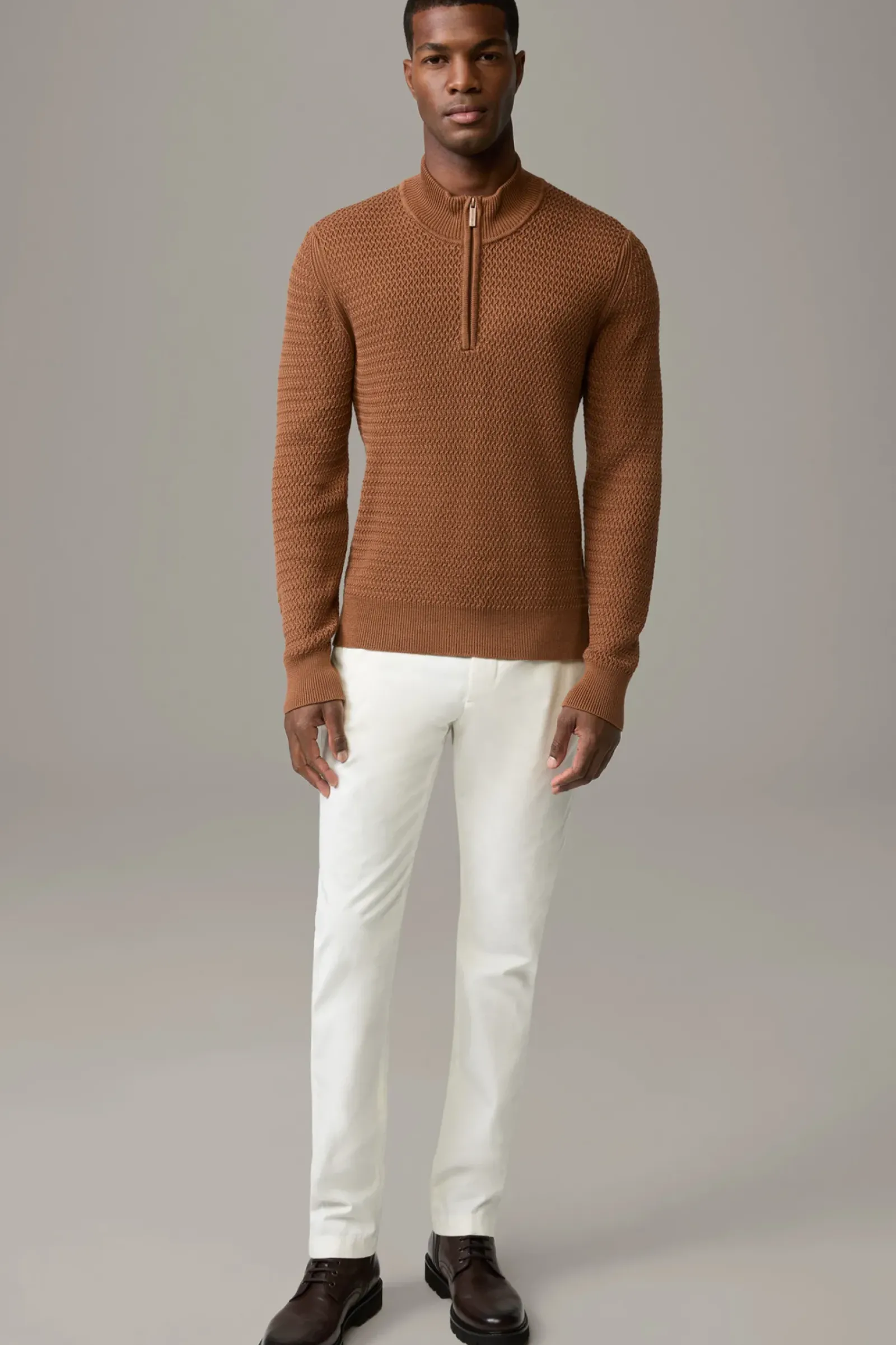 Komfortabler Klassiker: der Troyer Adrian mit Stehkragen und kurzem Zipper. Rippbündchen und Ziernähte ergänzen das Design. Aus reinem Cotton.