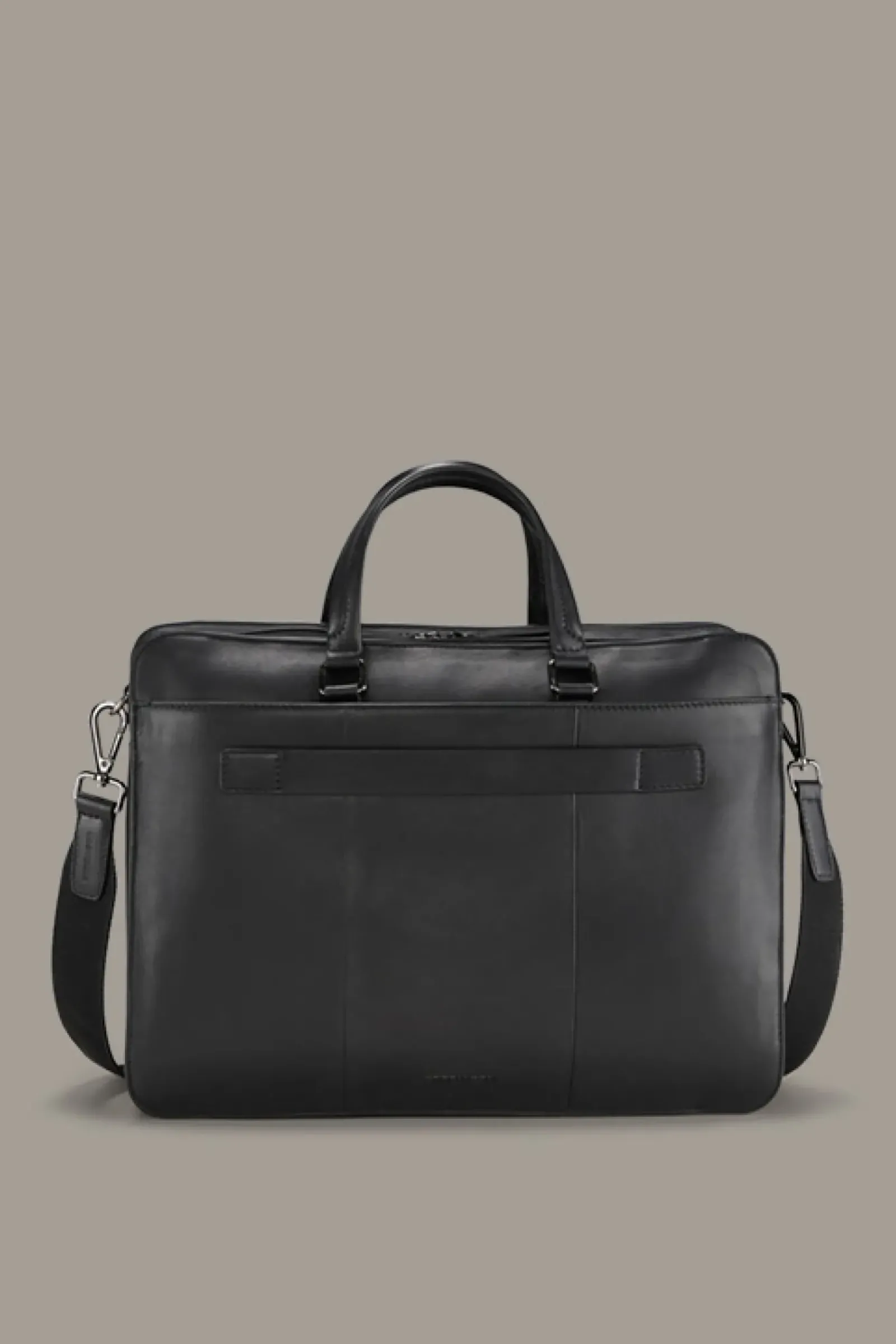 Business Essential: die Briefbag Hoxton Charles mit Duo-Hauptfächern, Zwei-Wege-Zippern und Logo-Anhängern. Das Leder im glatten Look prägt das urbane Design, während diverse Fächer und eine rückseitige Trolley-Schlaufe für Komfort sorgen.