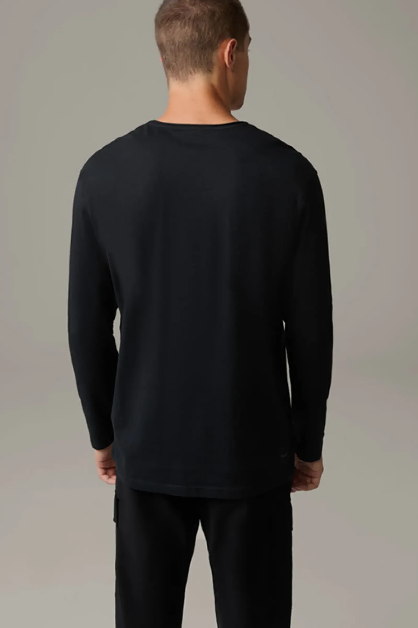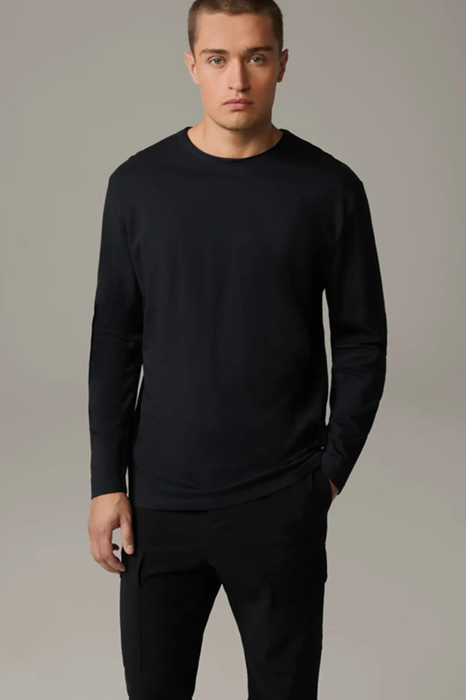 Perfektes Layering-Match: das Longsleeve Tyler aus Compact Cotton mit Rollsaumkante am Rundhalsausschnitt, ergänzt durch ein rückseitiges Rubber-Patch.