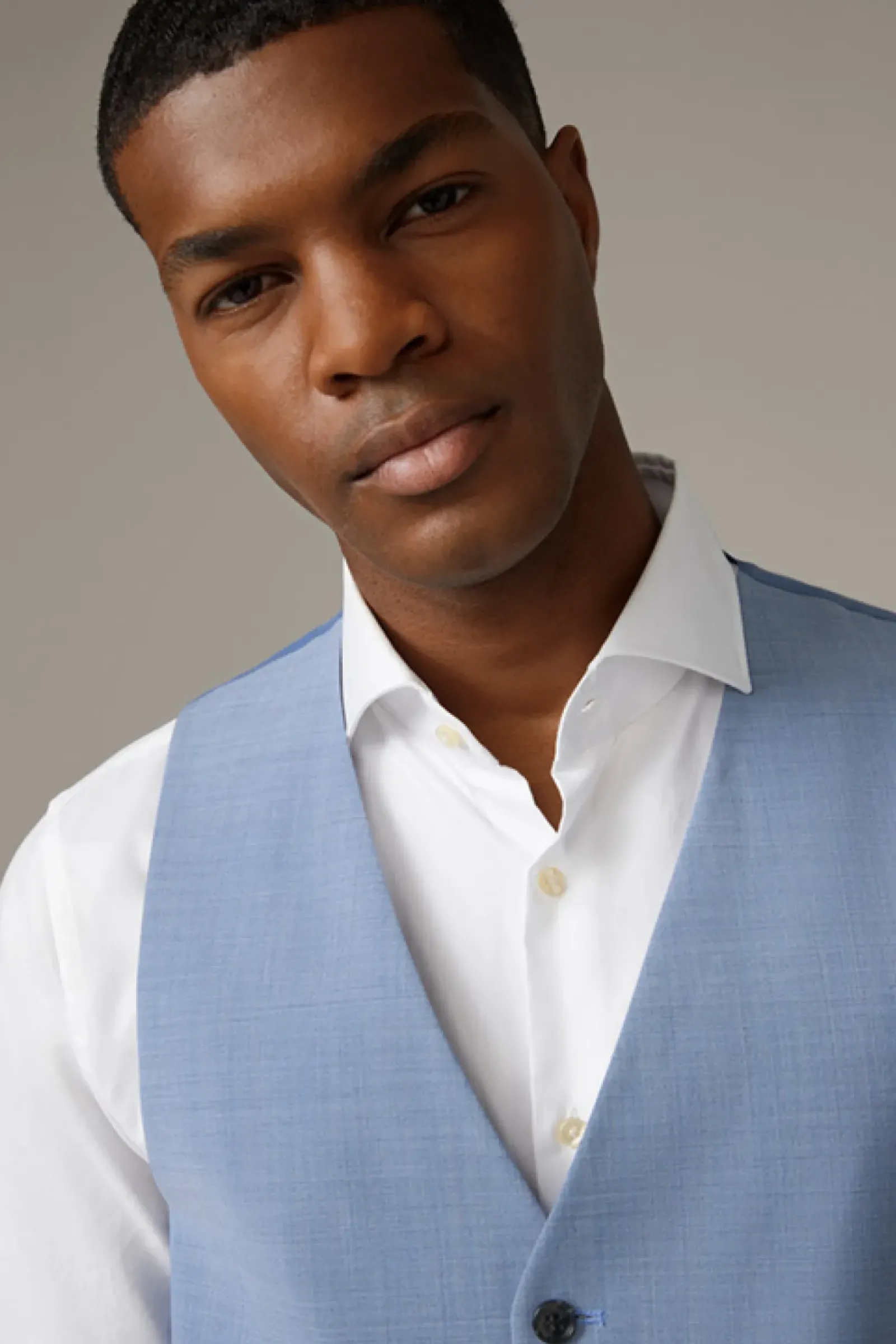 Add-on-Piece für feine Anlässe: die Weste Ves mit durchgehender Knopfleiste, Leistentaschen und changierendem Rückenteil mit verstellbarem Riegel.