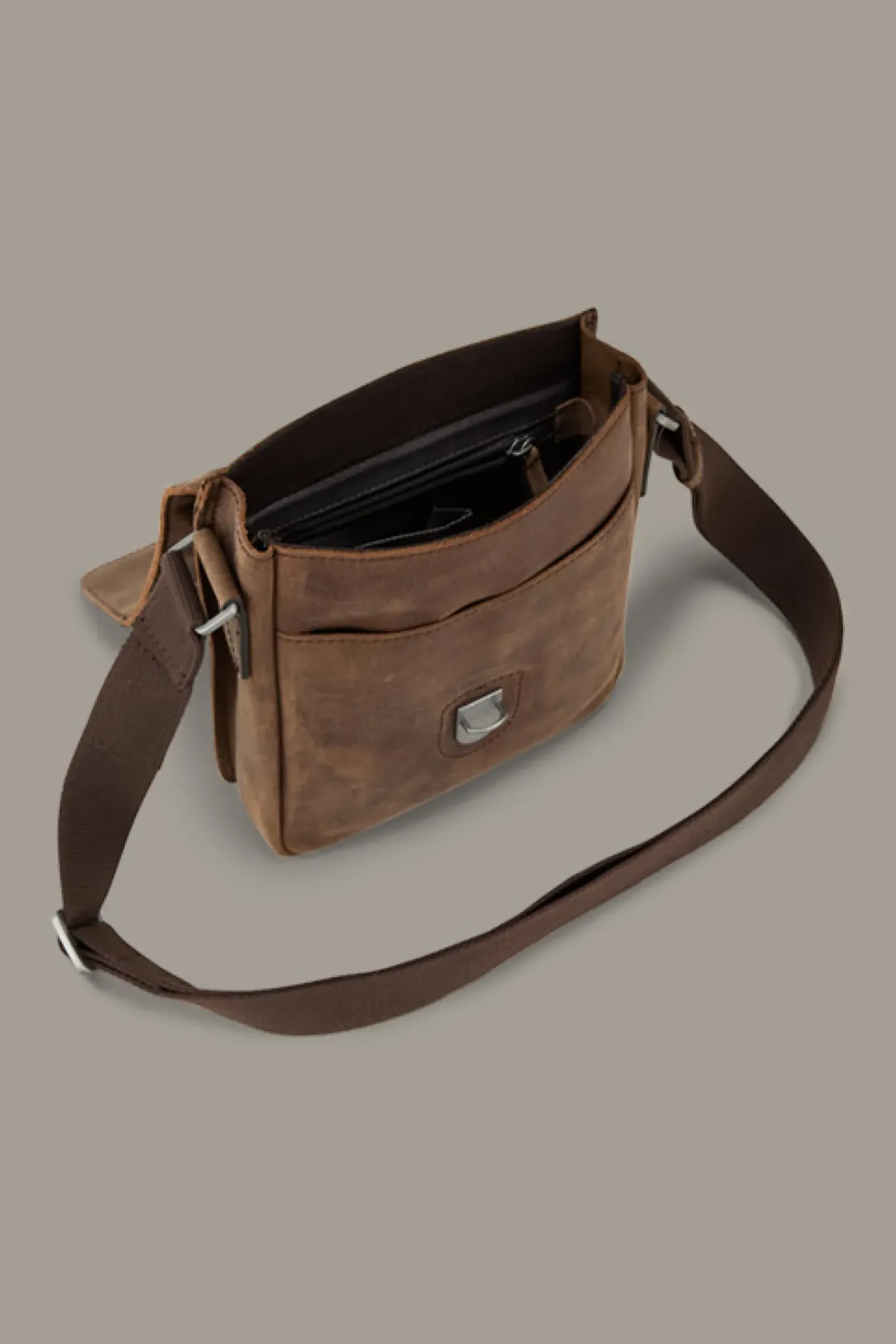 Fold-Over-Design aus Rindsleder im Vintage-Look: die Schultertasche Richmond Jeremy mit verdecktem Steckverschluss, coolen Label-Details und dekorativen Stitchings.
