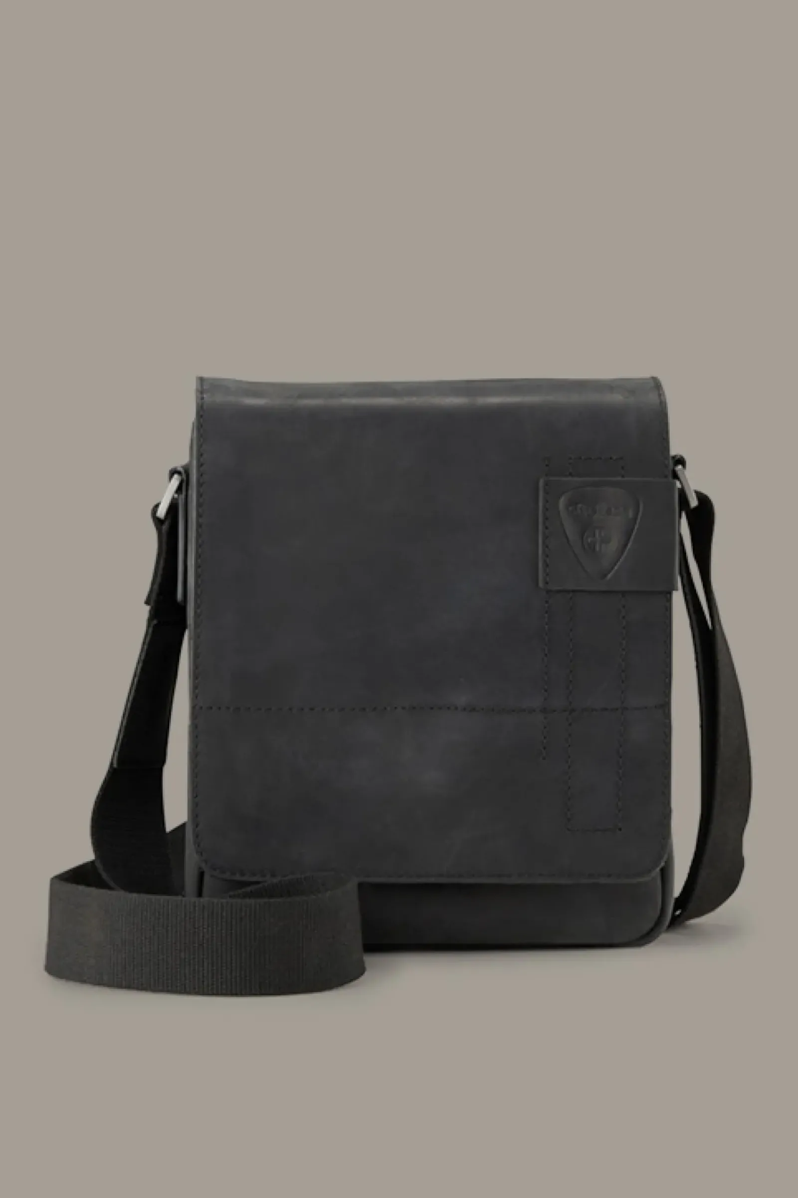 Fold-Over-Design aus Rindsleder im Vintage-Look: die Schultertasche Richmond Jeremy mit verdecktem Steckverschluss, coolen Label-Details und dekorativen Stitchings.