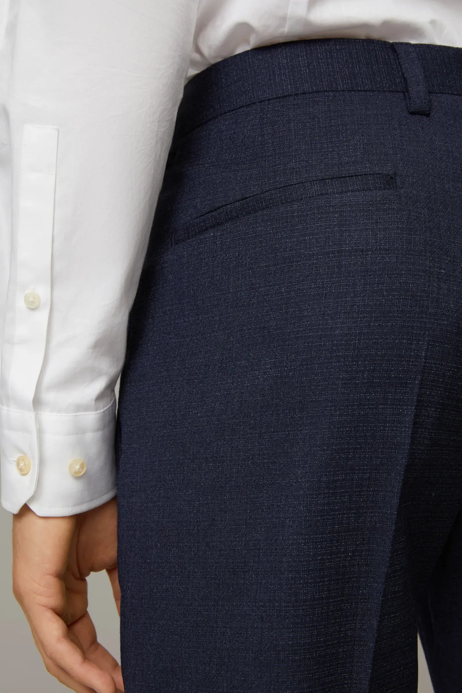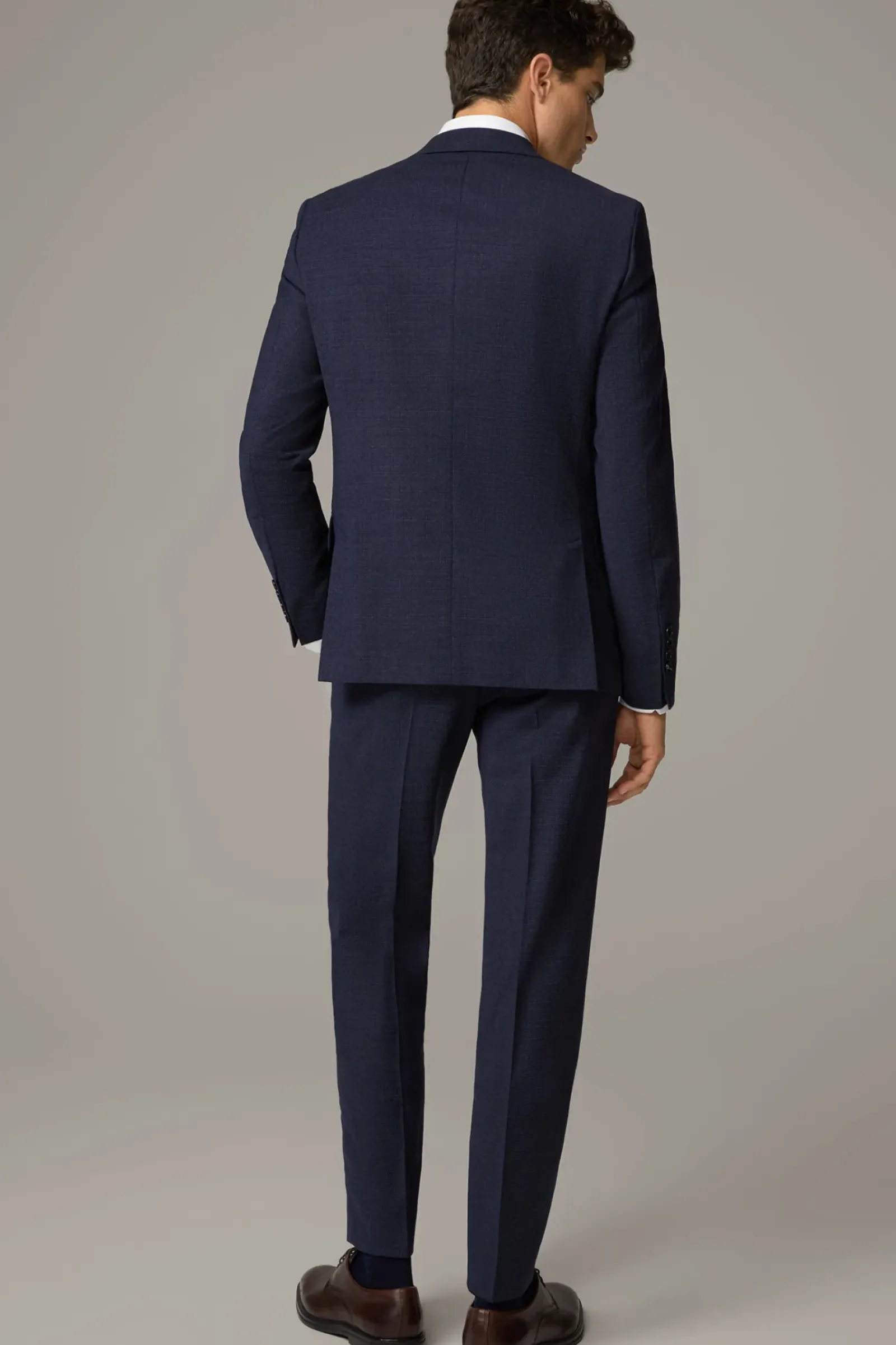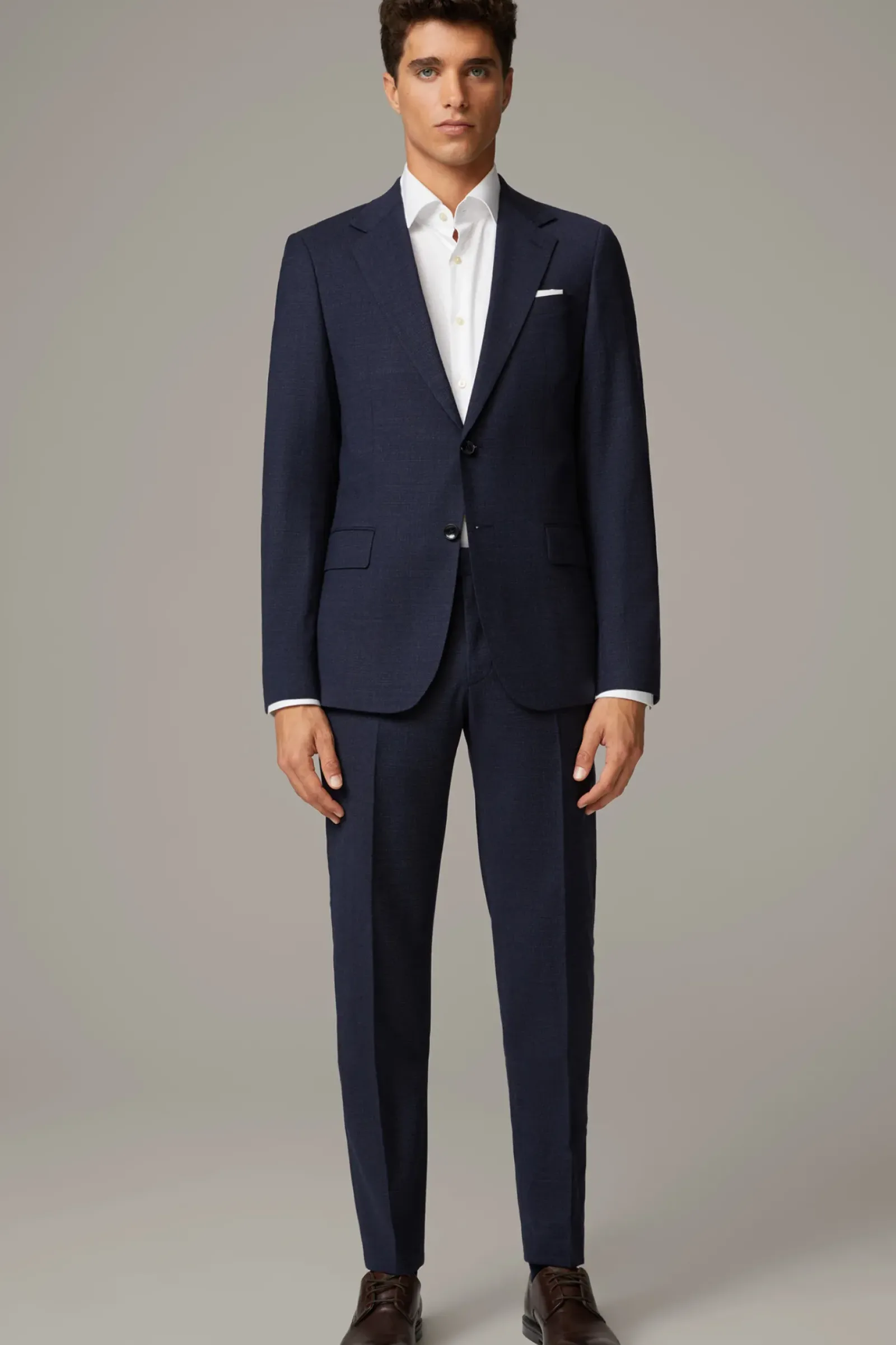 Aus stretchiger Schurwolle in extra schmaler Silhouette: der Einreiher Caidan-Madden mit paspelierten Pattentaschen, Zierärmelschlitzen, Logo-Futter sowie klassischen Bügelfalten.