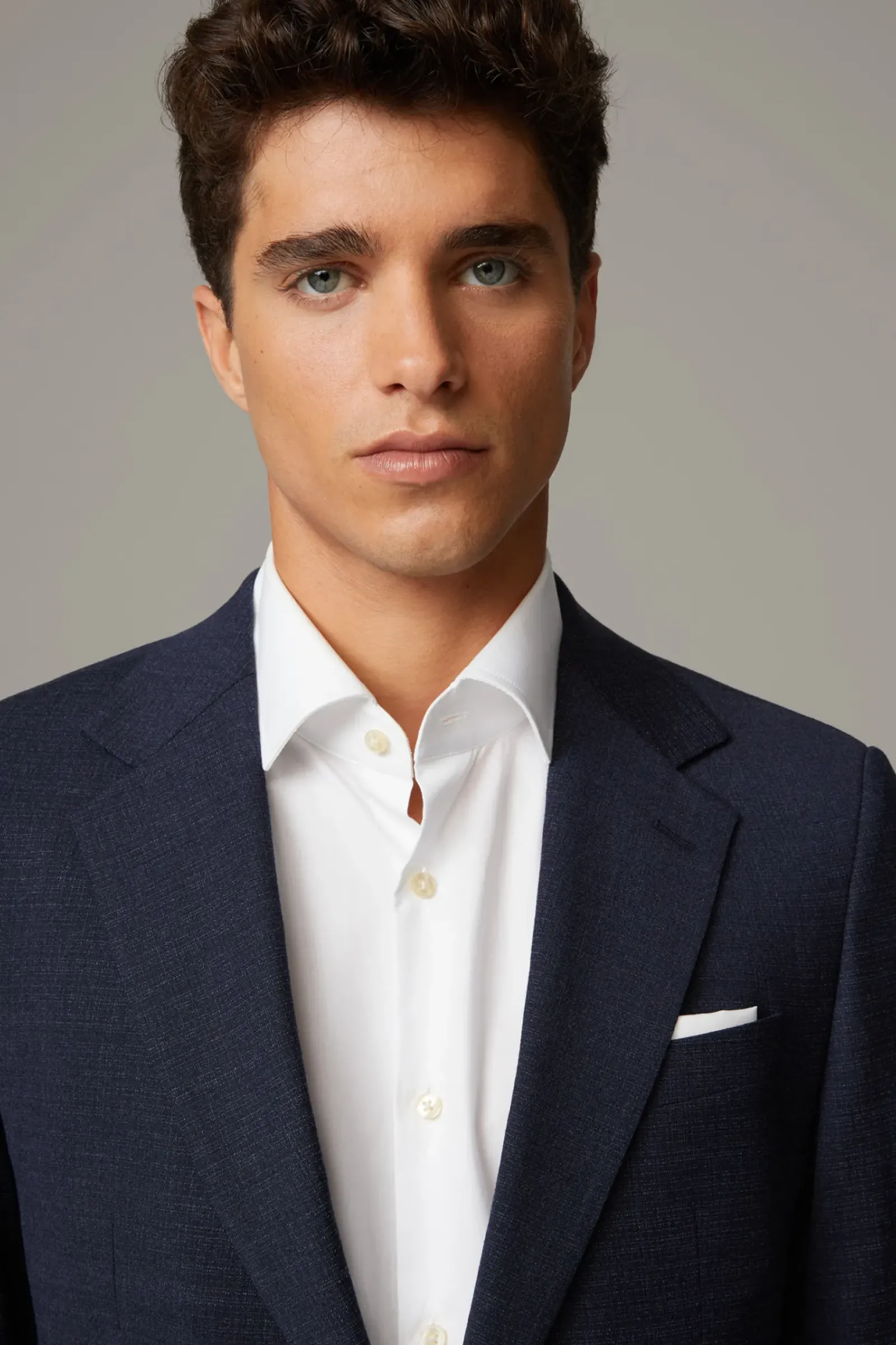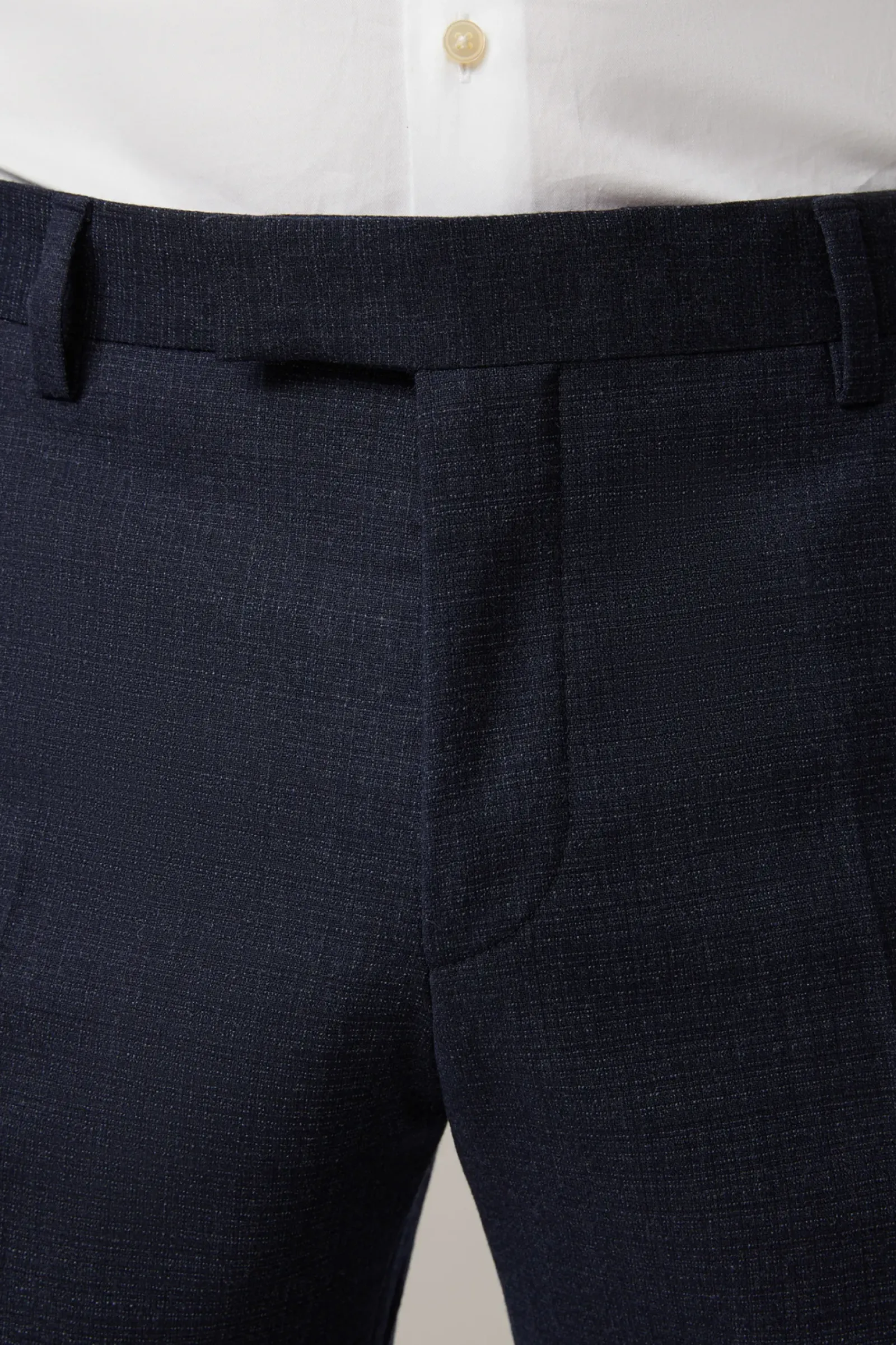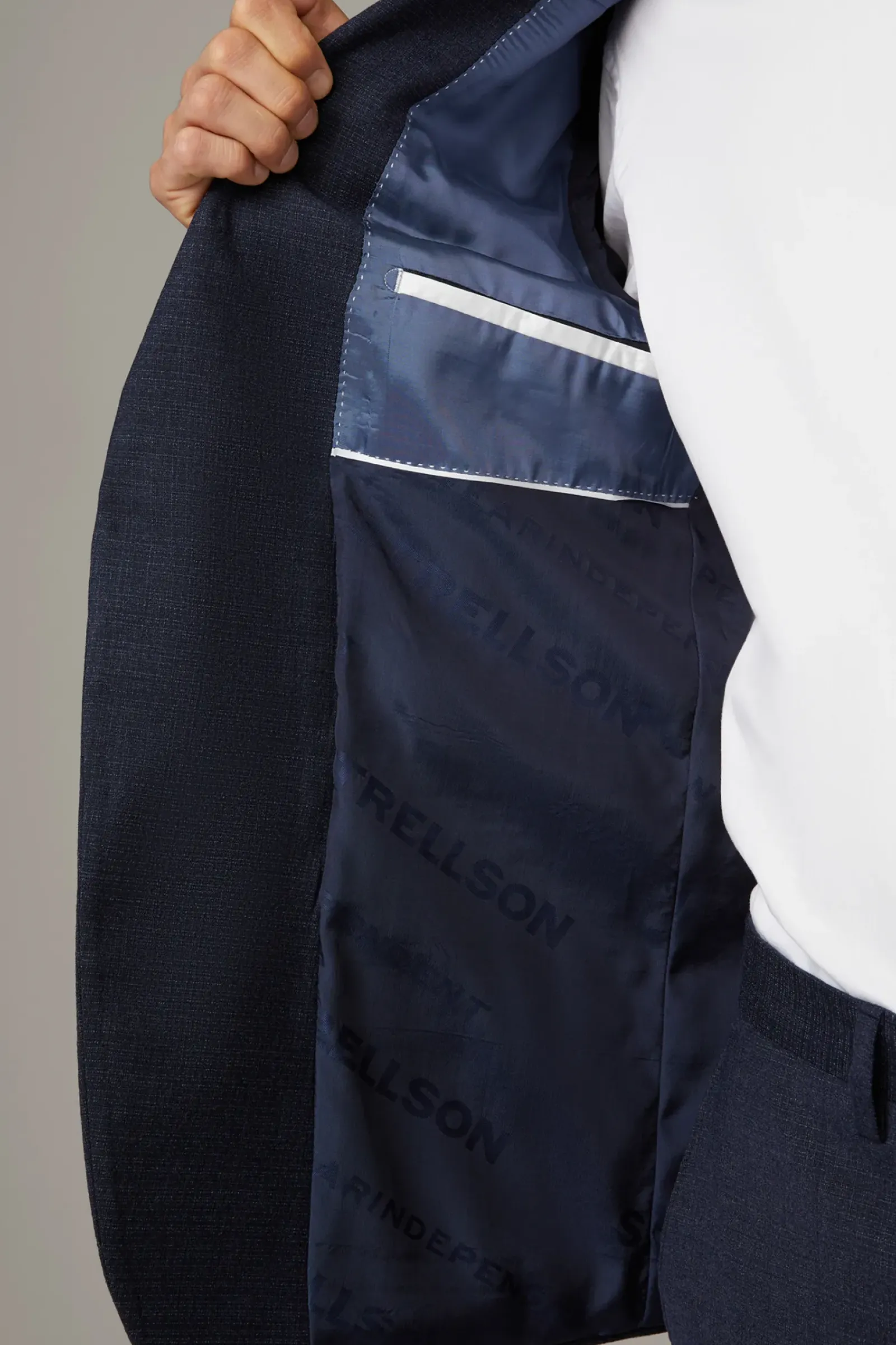 Aus stretchiger Schurwolle in extra schmaler Silhouette: der Einreiher Caidan-Madden mit paspelierten Pattentaschen, Zierärmelschlitzen, Logo-Futter sowie klassischen Bügelfalten.