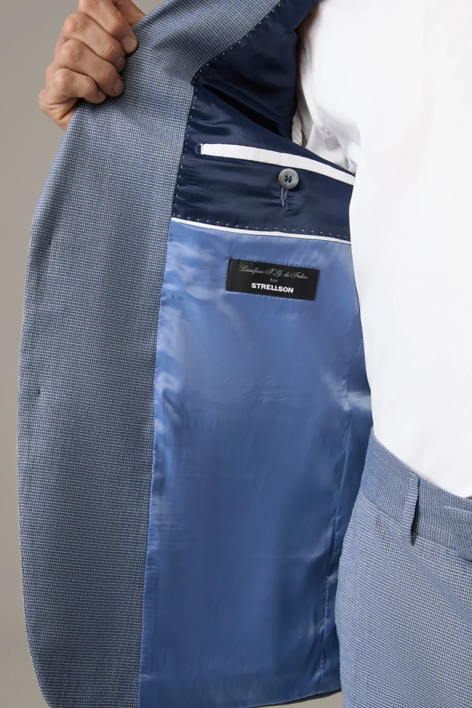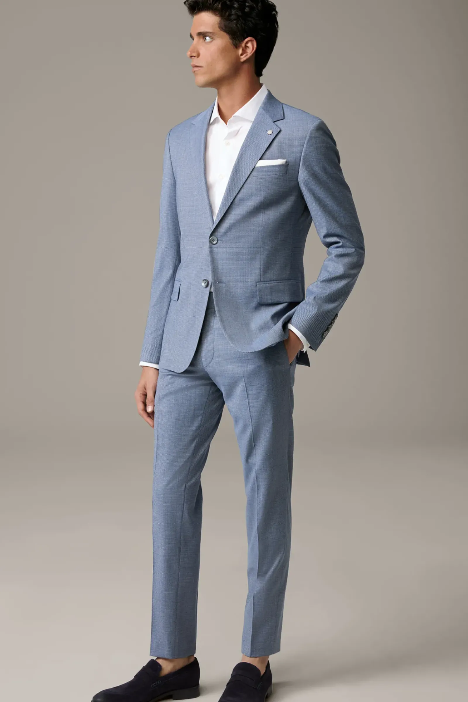 Smartes Muster-Finish: Der extraschmale Anzug Caidan Melwin überzeugt im italienischen Wool Blend. Sakko mit Pattentaschen und Label-Pin am Reverskragen, Anzughose mit klassischen Bügelfalten.