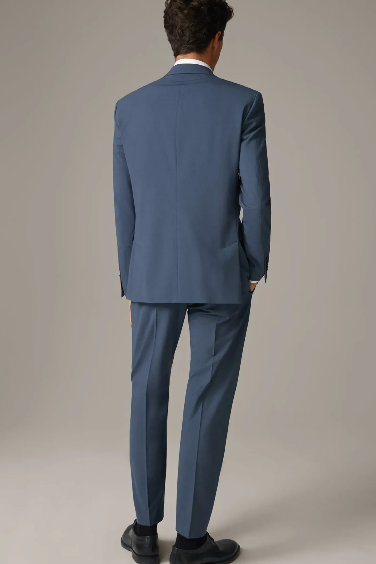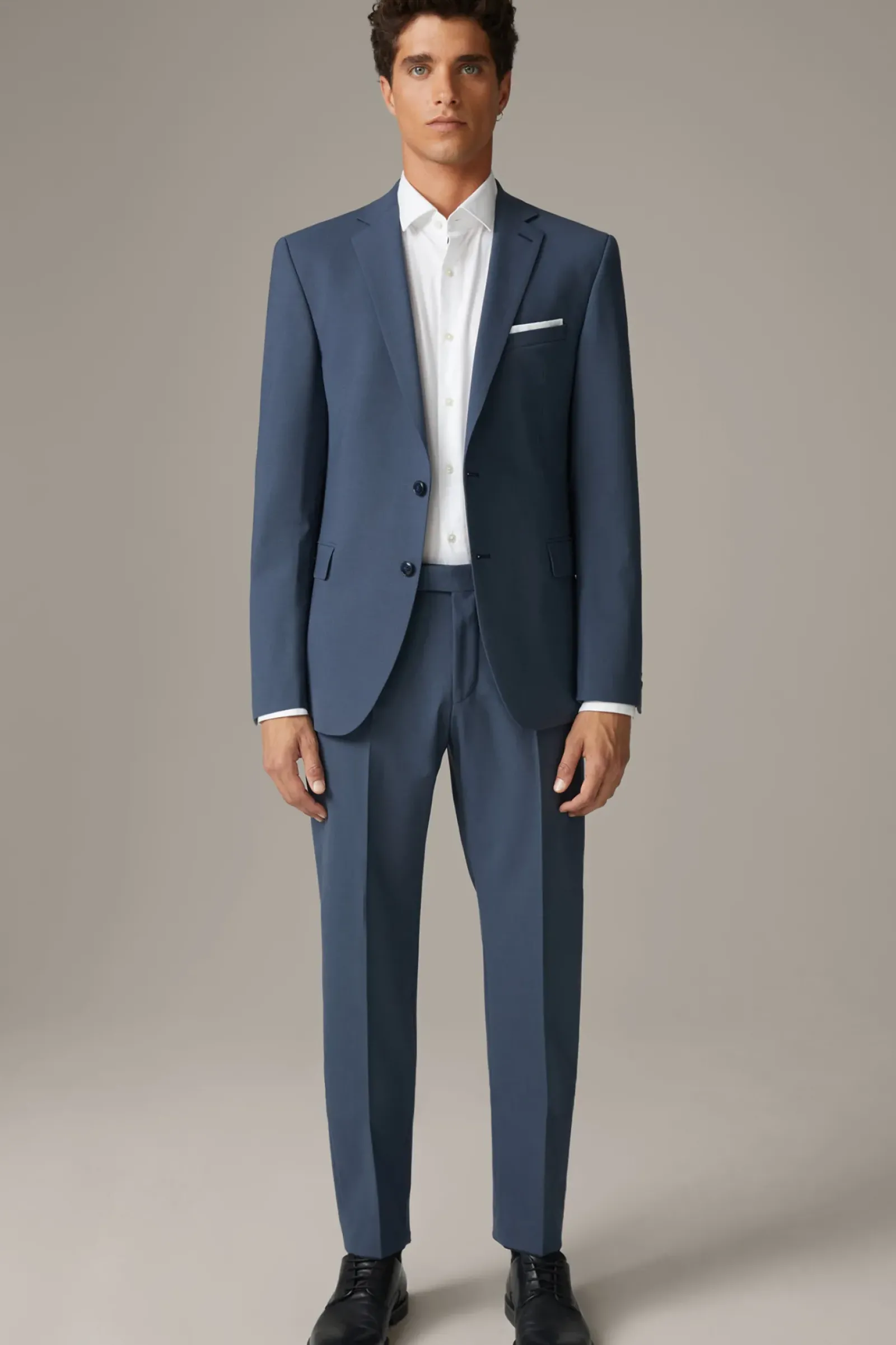 Begeistert im klassischen Design als Einreiher mit Kissing-Buttons, paspelierten Pattentaschen und Bügelfalten: der Anzug Rick-Jans. Im angenehmen Woll-Mix mit fließendem Logo-Futter.
