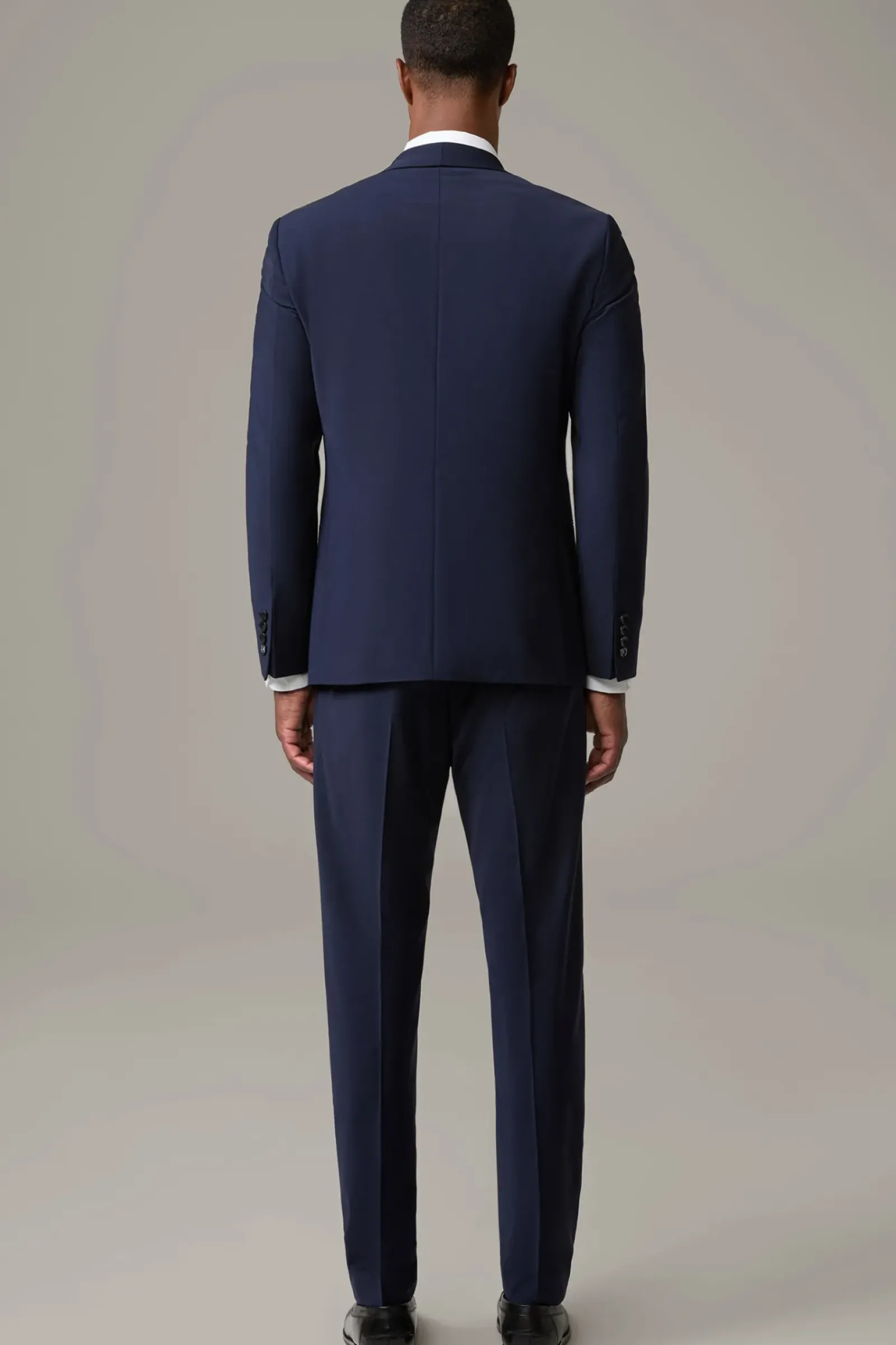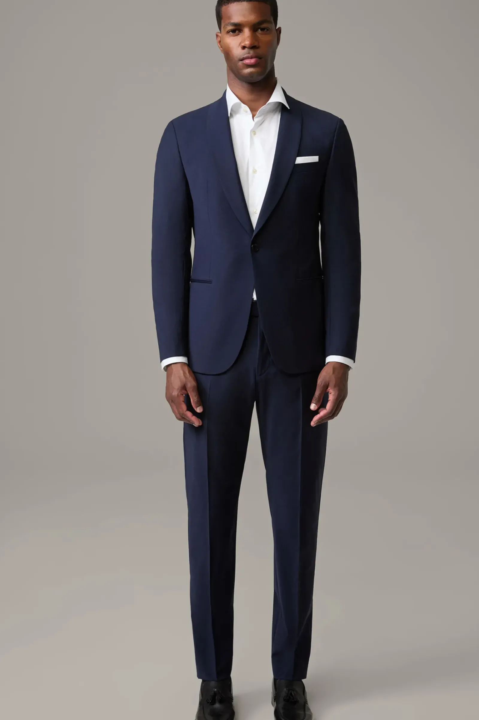 Mit modernem Schalkragen-Revers und paspelierten Eingrifftaschen am Sakko und einer Anzughose mit schmalem Beinverlauf und Bügelfalten überzeugt der Anzug Amur-Madden. Glatter Wool-Stretch.