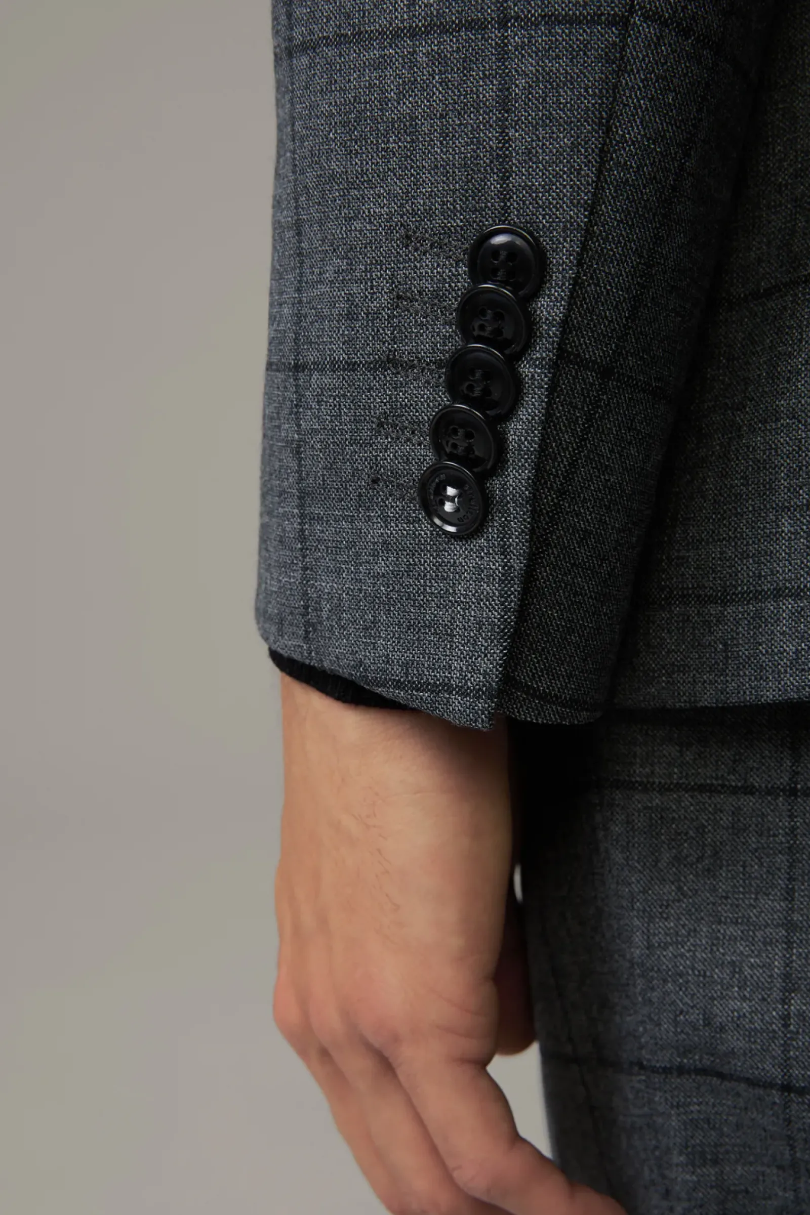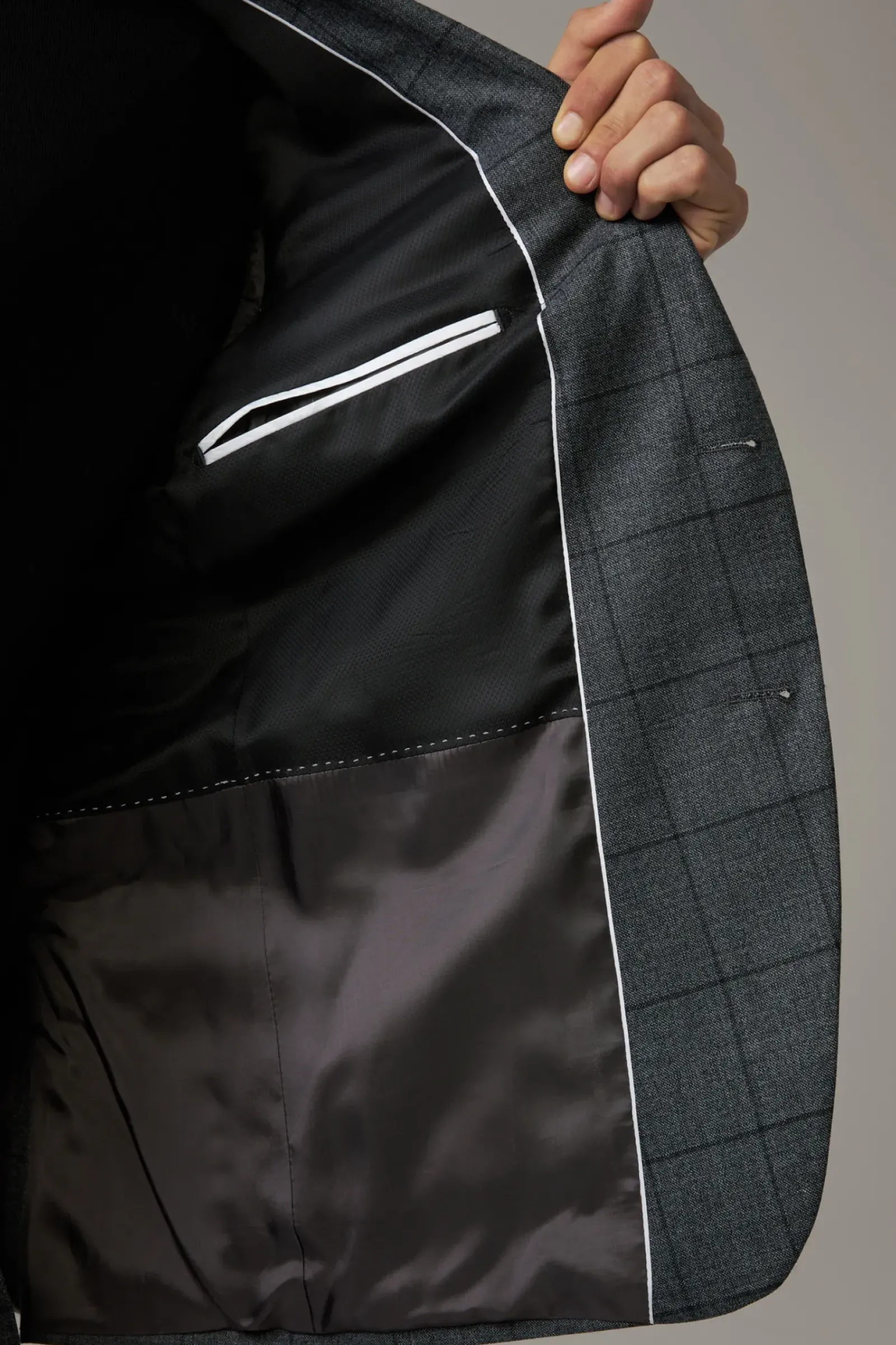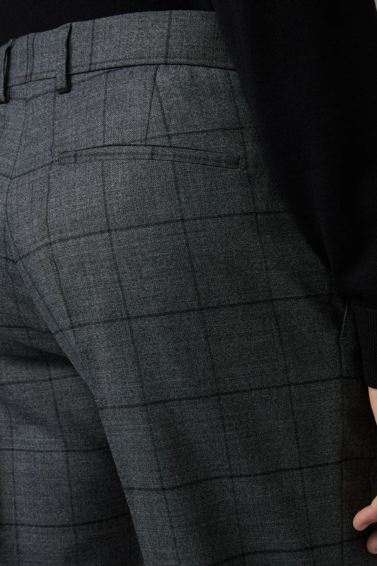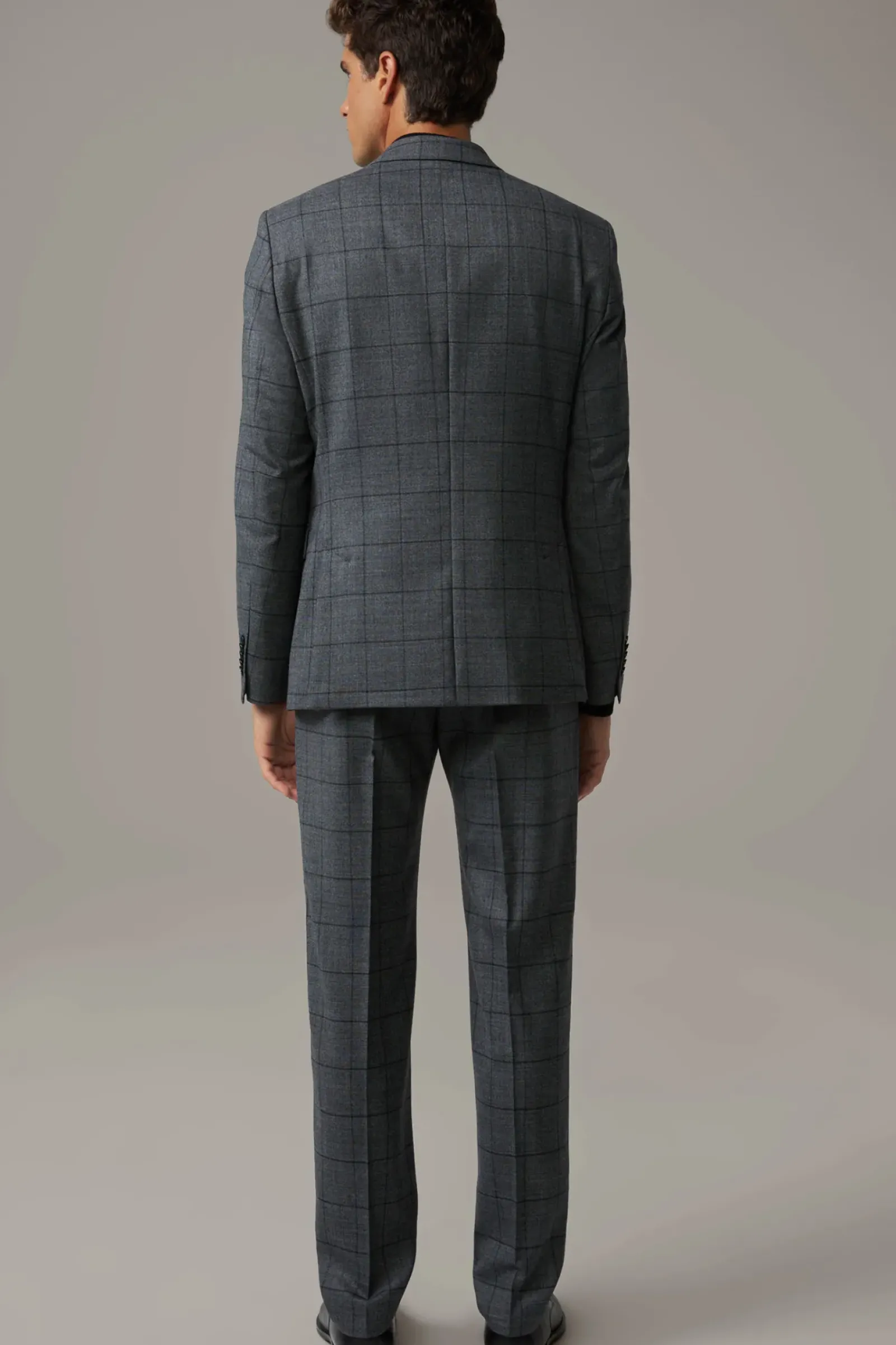 Überzeugt im Glencheck-Style aus Schurwoll-Mix: der Anzug Aidan-Max mit paspelierten Pattentaschen und Bewegungsschlitzen – ergänzt durch eine schmale Anzughose mit doppelter Hakenschließe.
