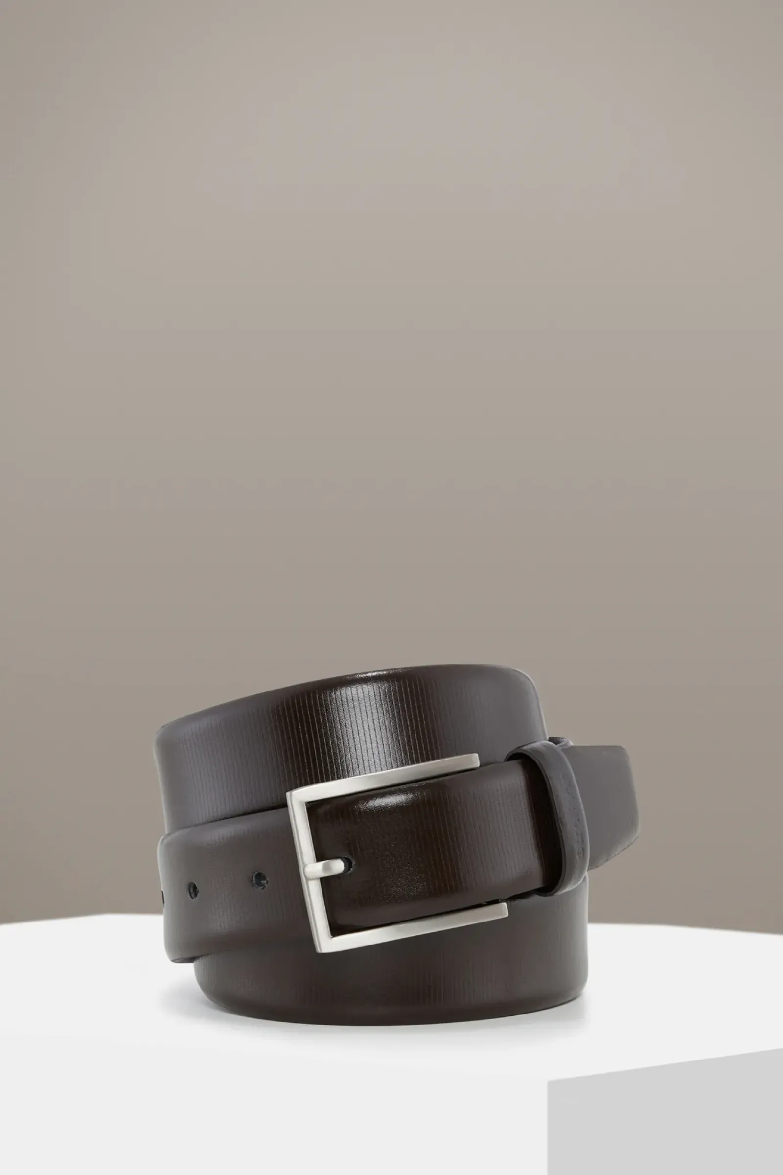 Aus purem Leder mit gebrushter Dornschließe ergänzt der Ledergürtel die maskuline Garderobe. Mit feiner Prägung und leicht glänzender Optik passt das Item zum Business- oder Freizeit-Look.