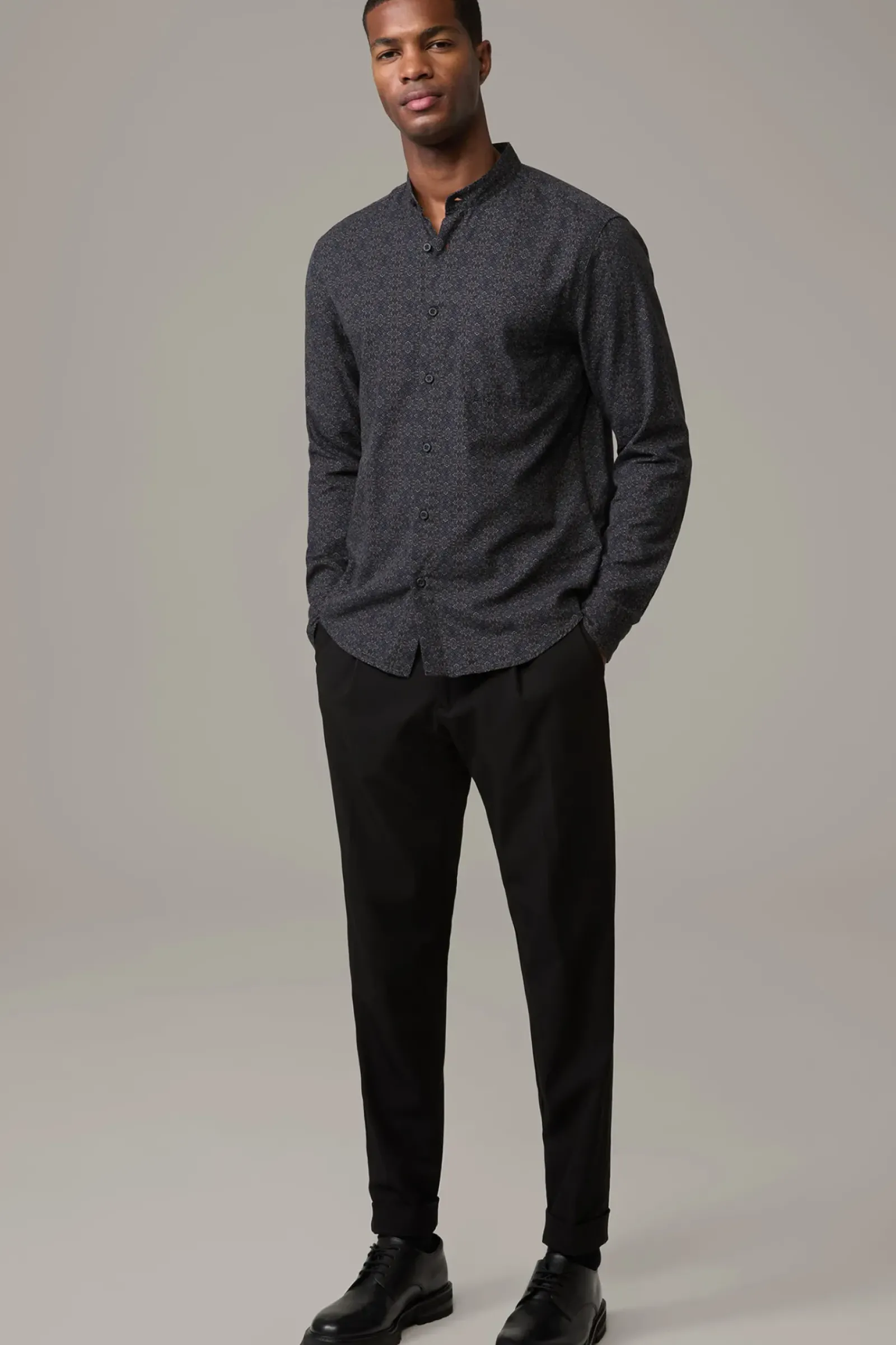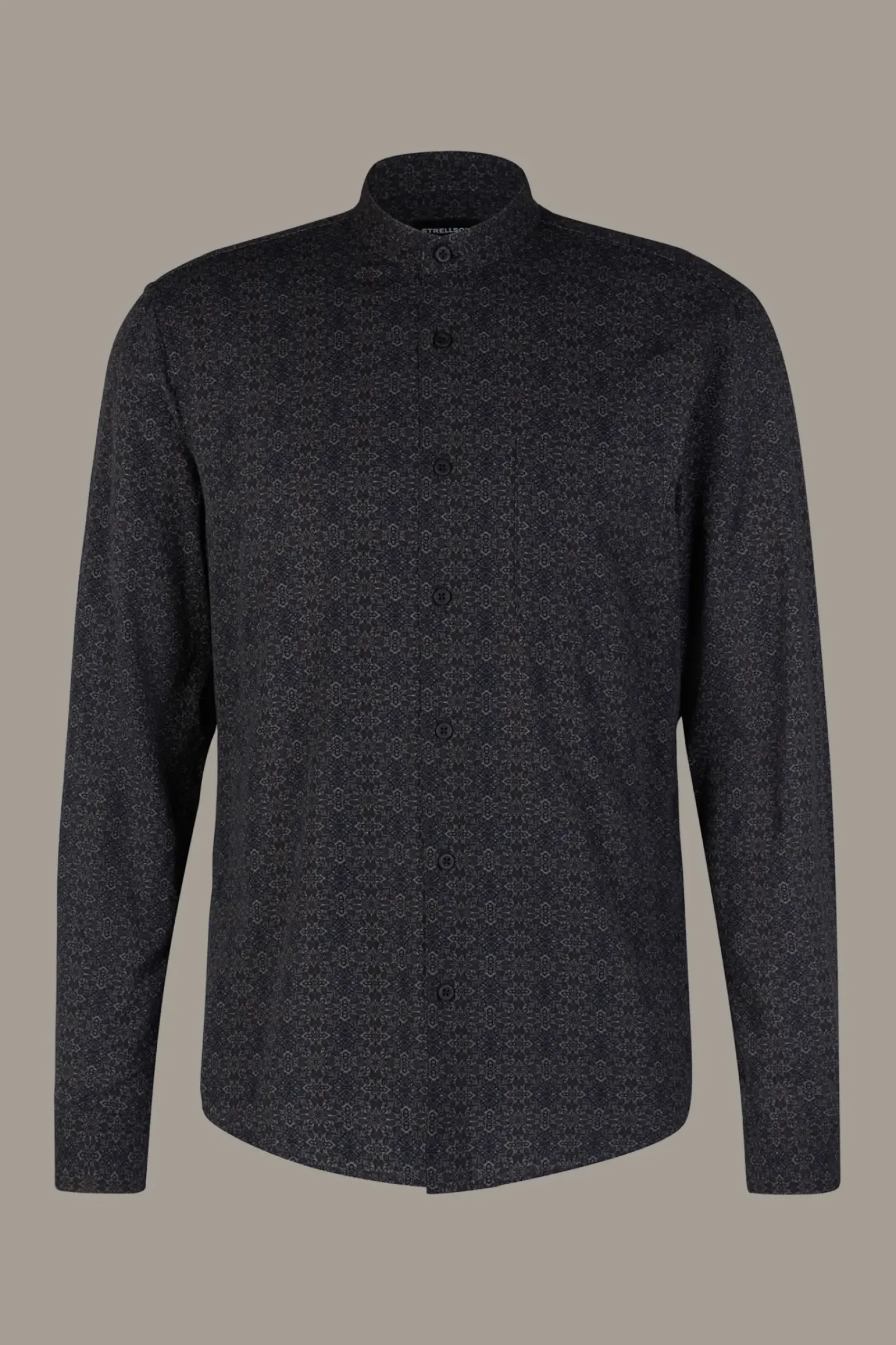 Das Hemd Caydan überzeugt im modernen Allover mit schmalem Stehkragen, Manschettenärmeln und abgerundetem Saum. Aus reinem Cotton.